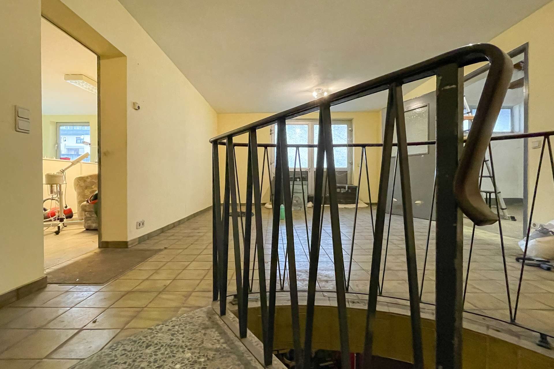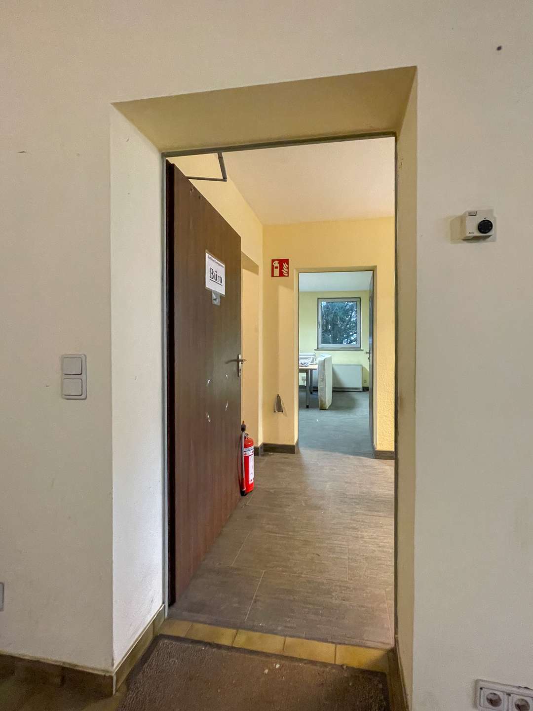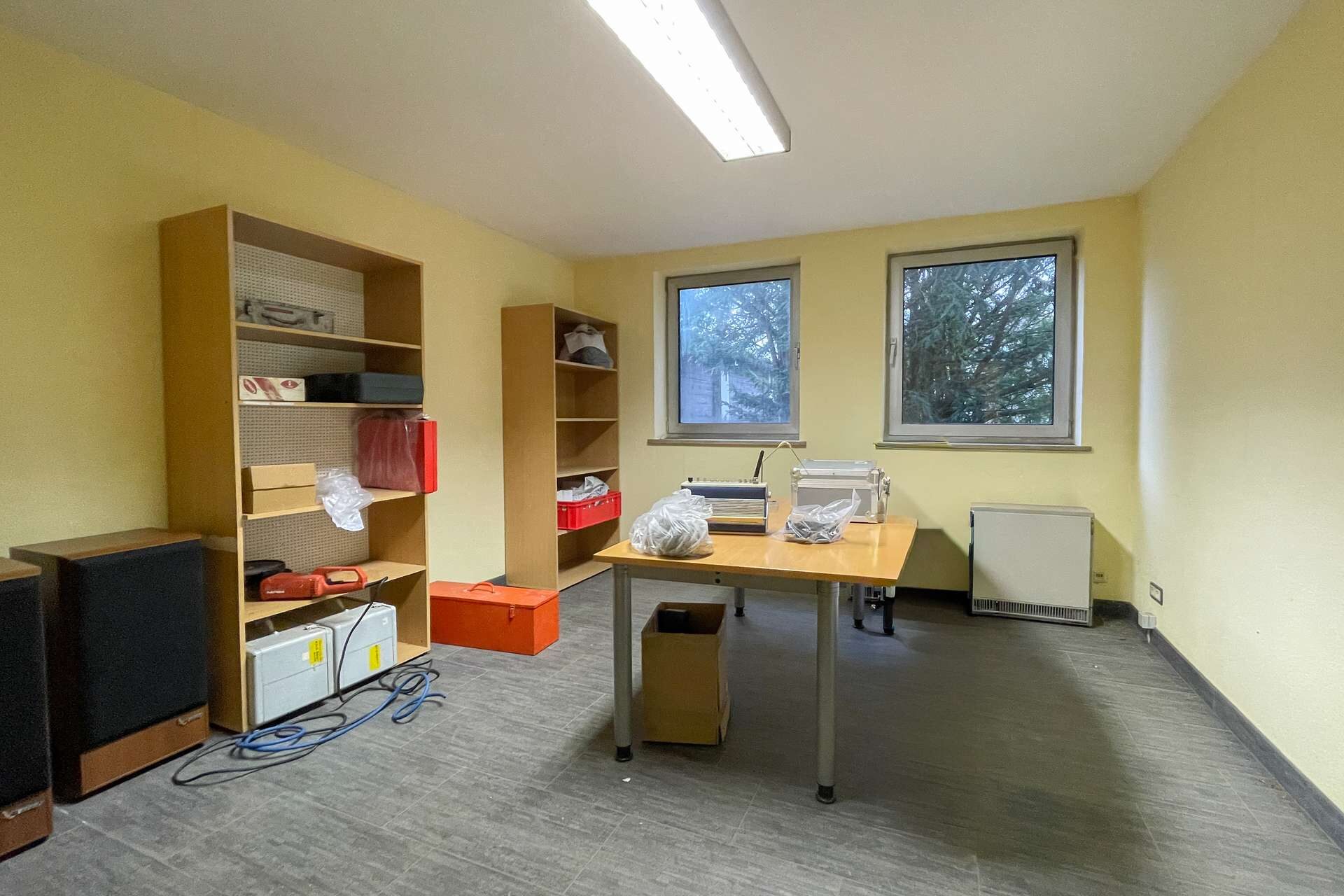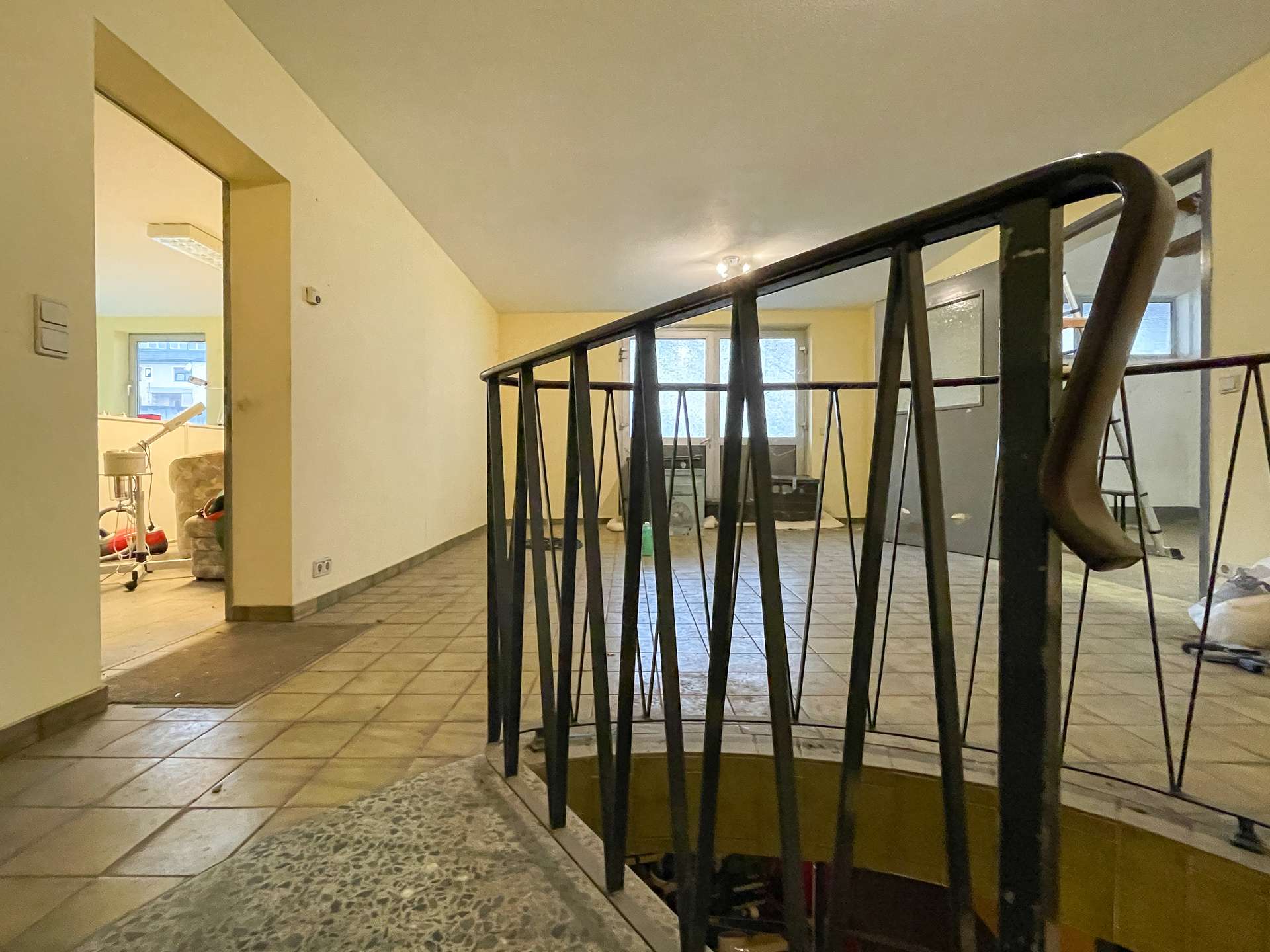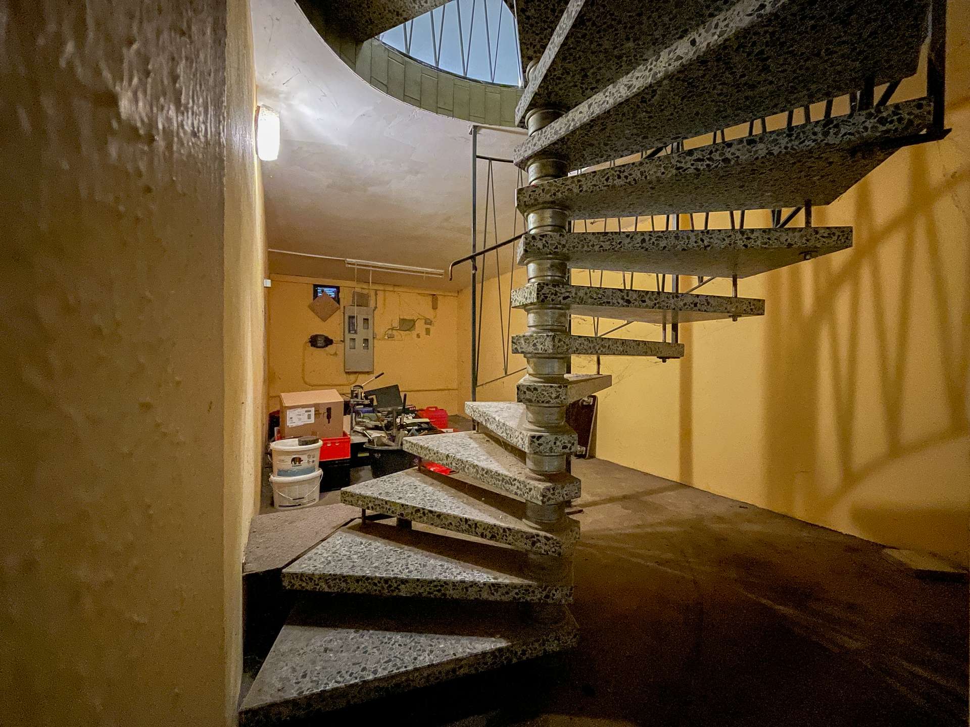 In dem Elektroverteilraum führt eine Wendeltreppe zum Büro und weiteren Lagerräumen im 1 OG. Das Büro besteht aus 2 Zimmern, WC und Dusche.