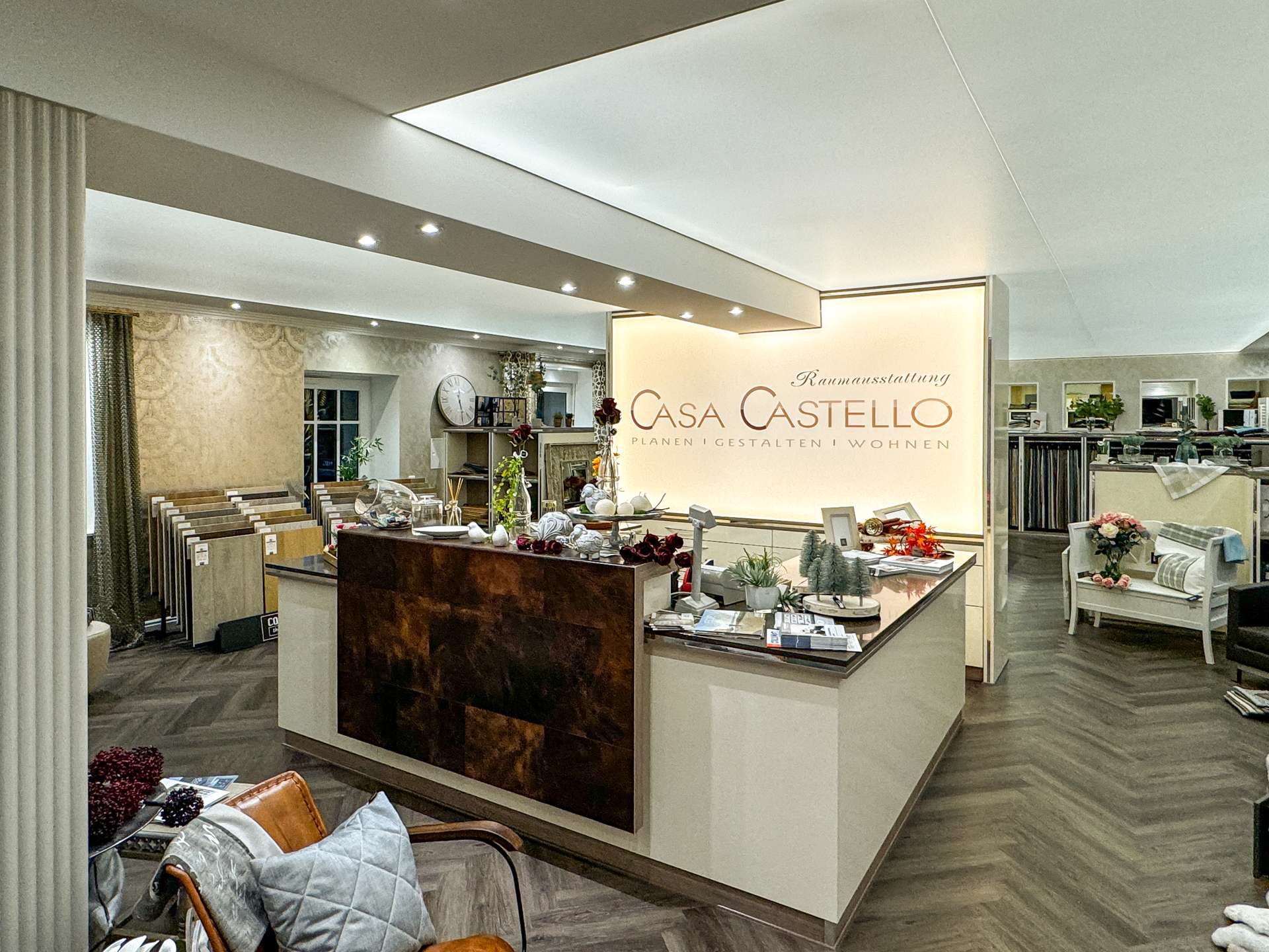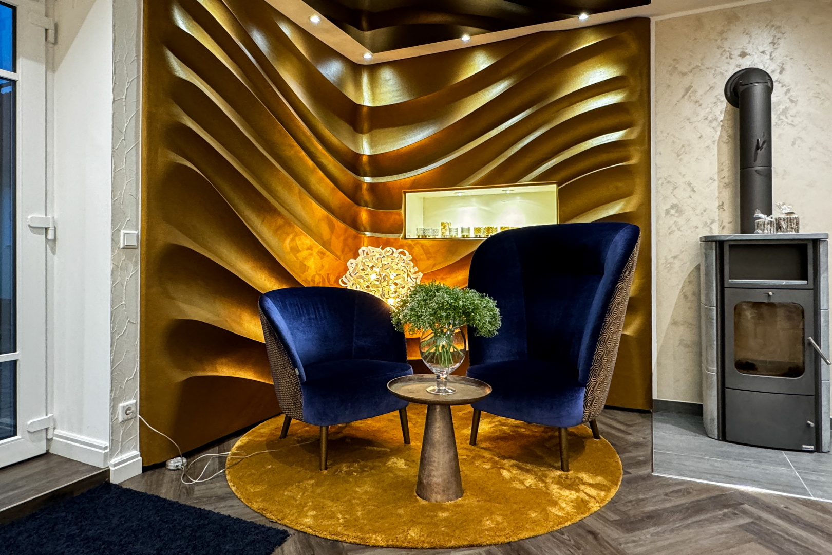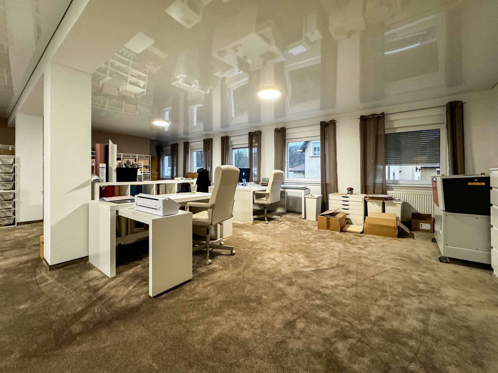 Die 325 m² große Gewerbeeinheit im Erdgeschoss wurde mit hochwertigen Möbeln, Wandbelägen und Böden aus futuristischem Teppich und Vinyl ausgestattet – der ideale Raum für einen Showroom oder Büro/Praxis.