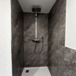 Das Badezimmer wurde im Zuge der Maßnahmen vollständig neu gestaltet und hochwertig ausgestattet. Eine ebenerdige Dusche sorgt für barrierefreien Komfort, während die stilvollen Fliesen in Natursteinoptik eine zeitlose und elegante Atmosphäre schaffen.