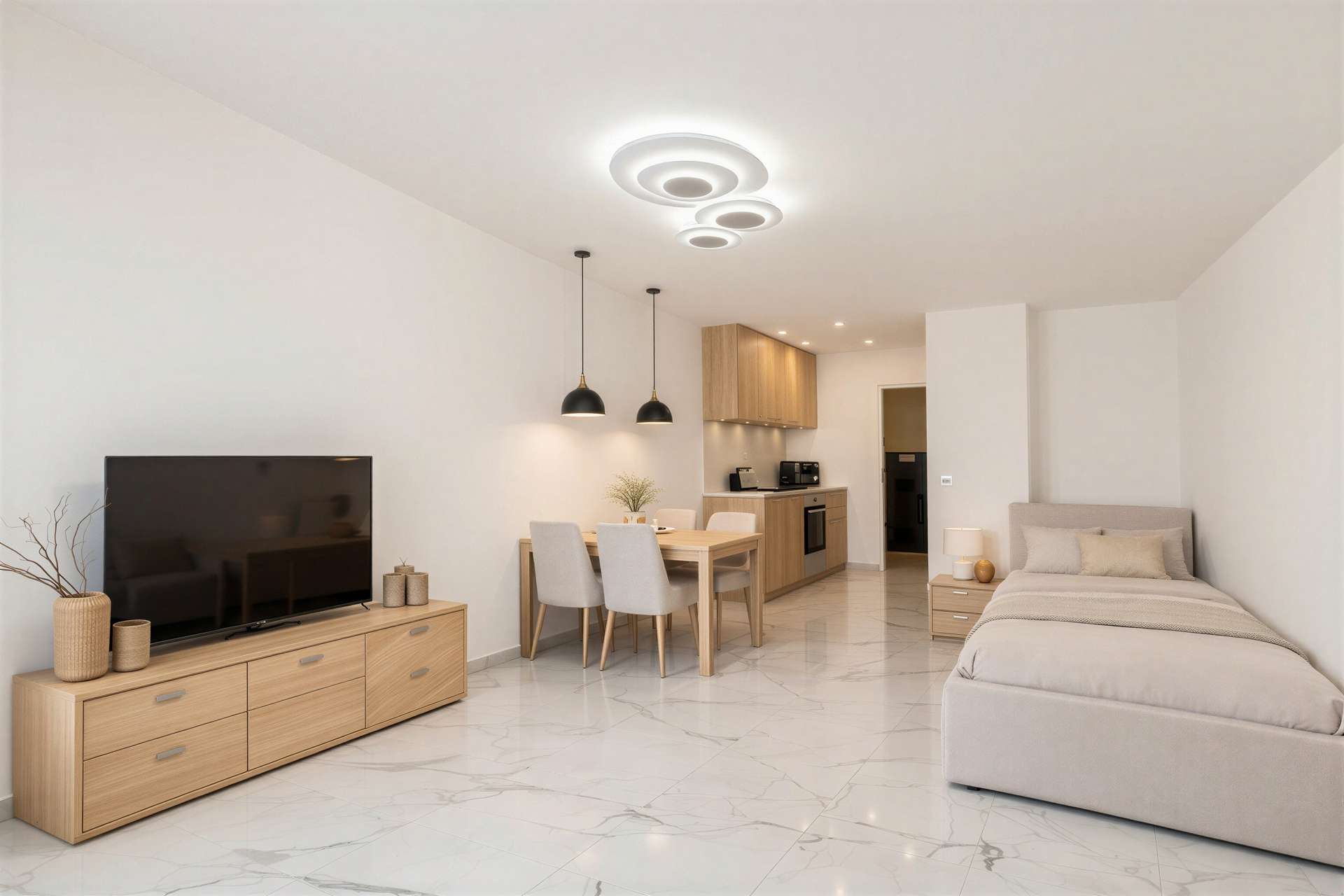 In den Wohnbereichen wurden hochwertige Fliesen in eleganter Marmoroptik verlegt, die sowohl optisch überzeugen als auch besonders pflegeleicht sind.