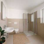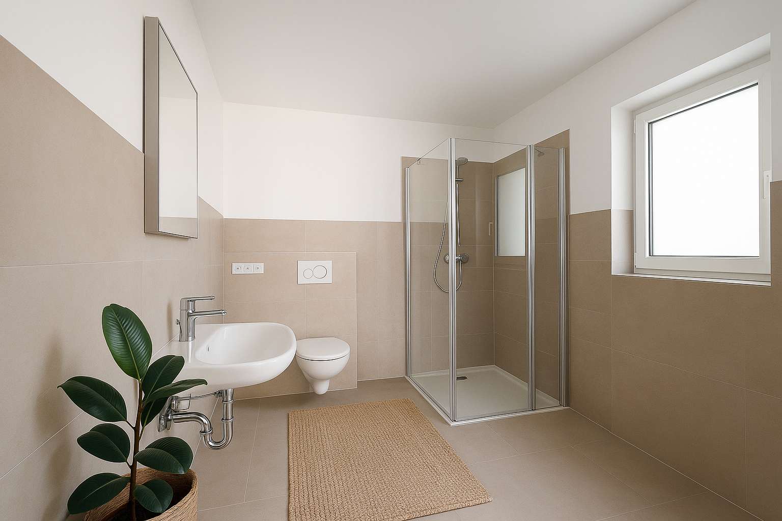Das Badezimmer ist ein echtes Highlight: Es präsentiert sich in modernem Design mit ebenerdiger Dusche, eleganten Fliesen und hochwertigen Sanitärelementen – perfekt für zeitgemäßes, komfortables Wohnen.