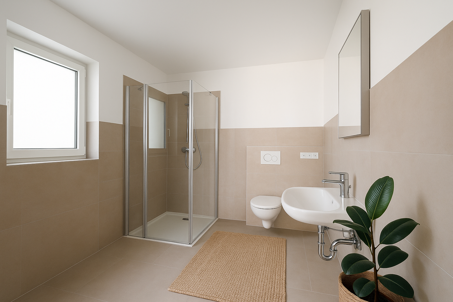 Das Badezimmer ist ein echtes Highlight: Es präsentiert sich in modernem Design mit ebenerdiger Dusche, eleganten Fliesen und hochwertigen Sanitärelementen – perfekt für zeitgemäßes, komfortables Wohnen.
