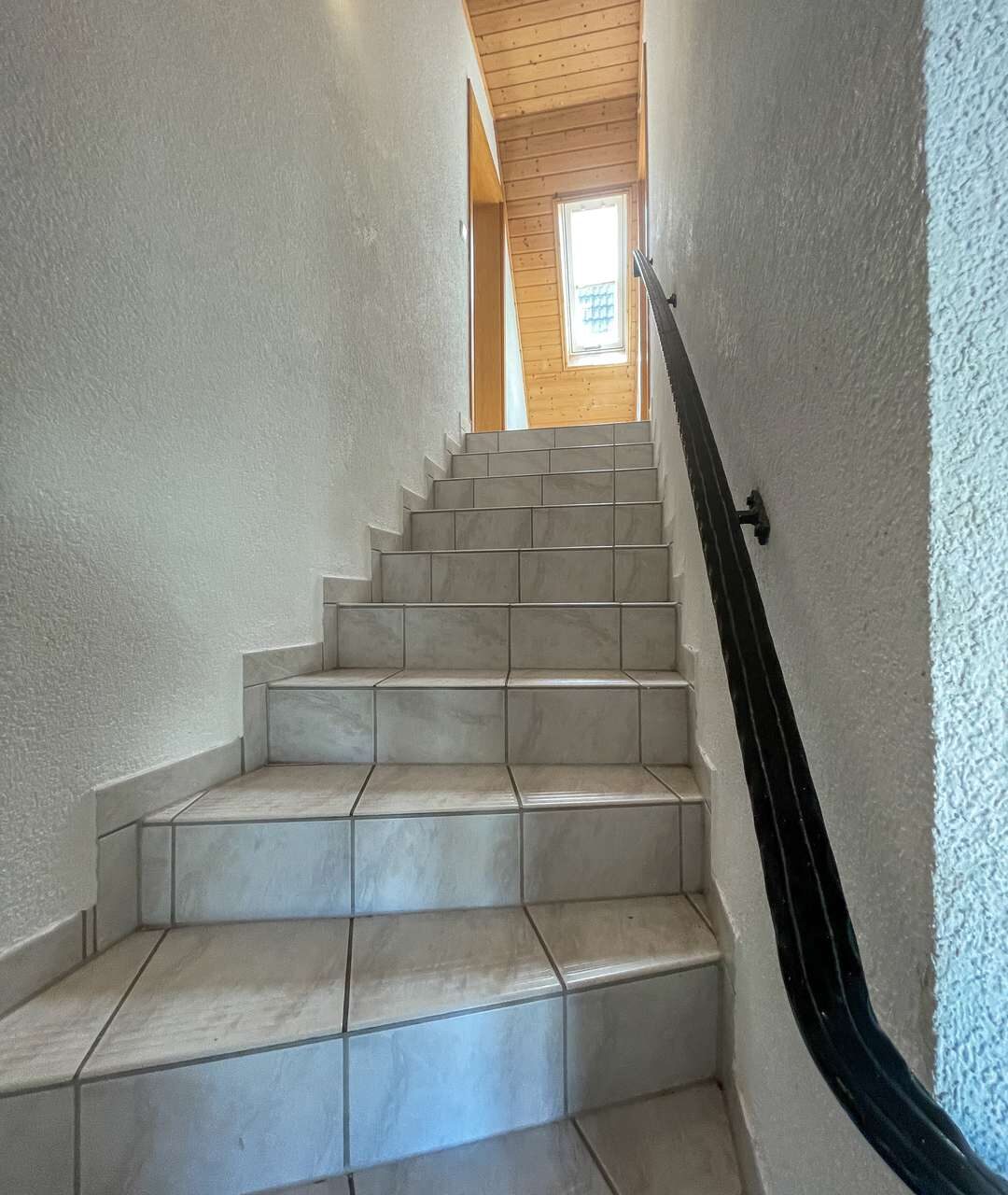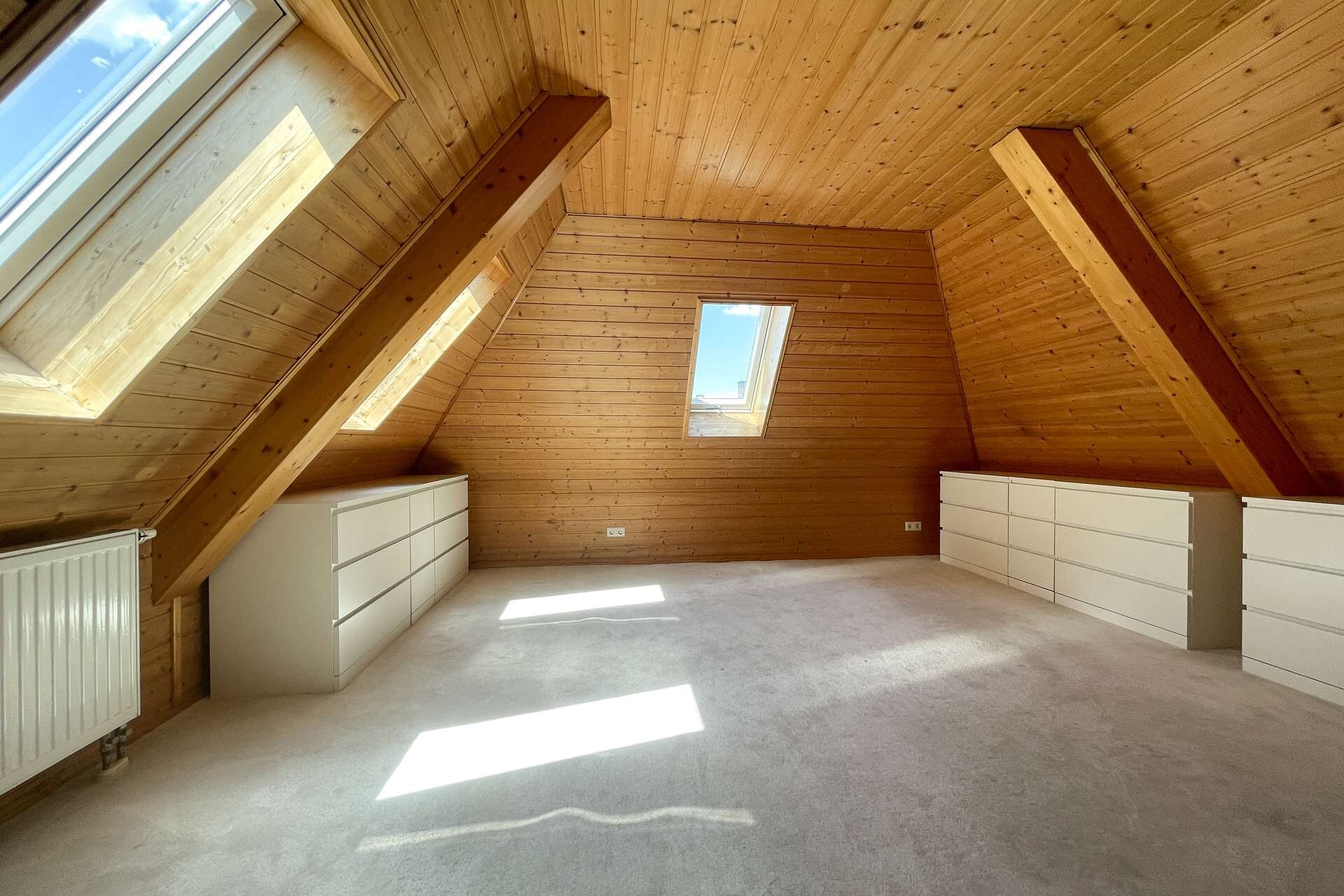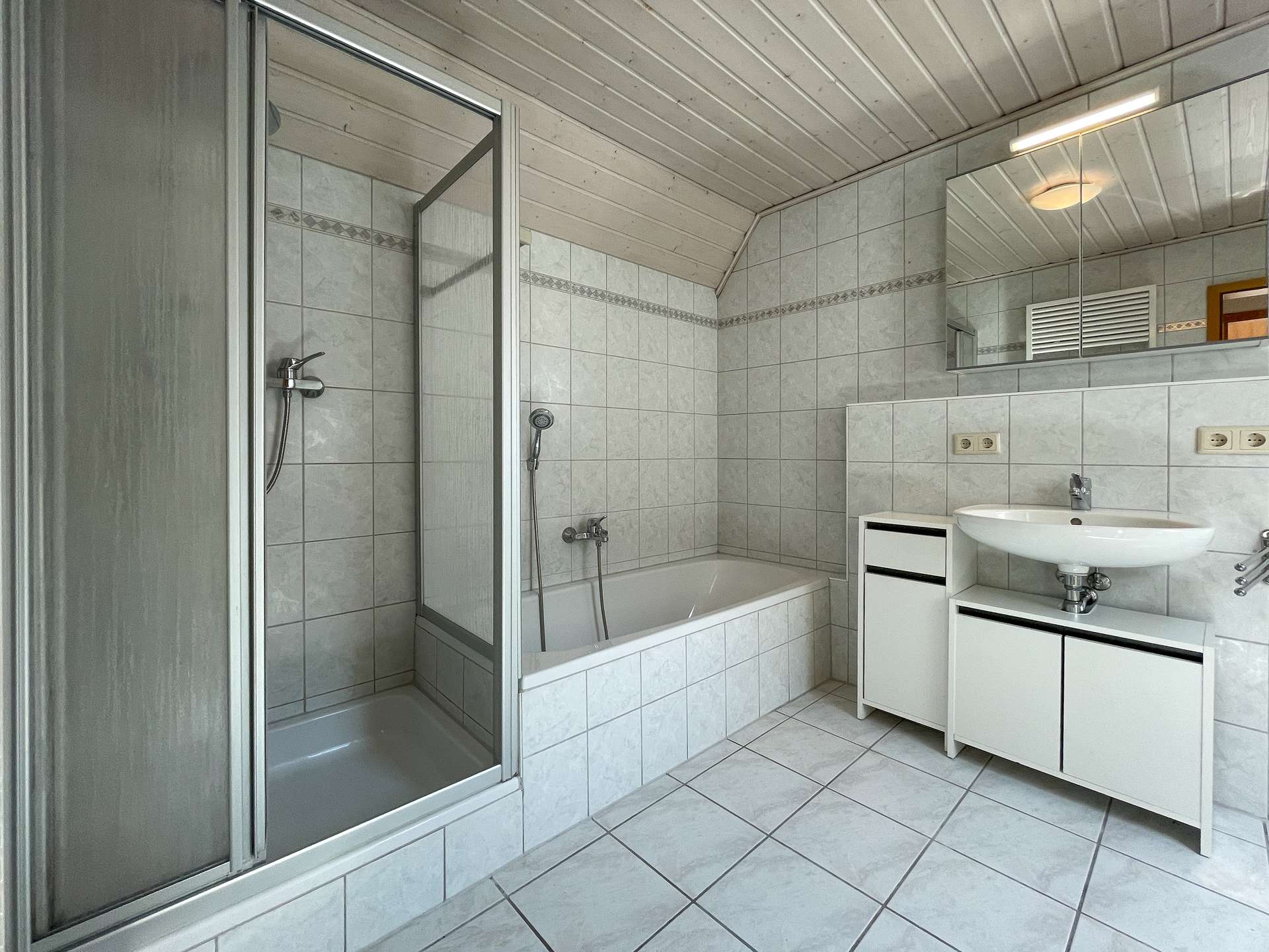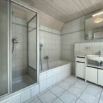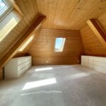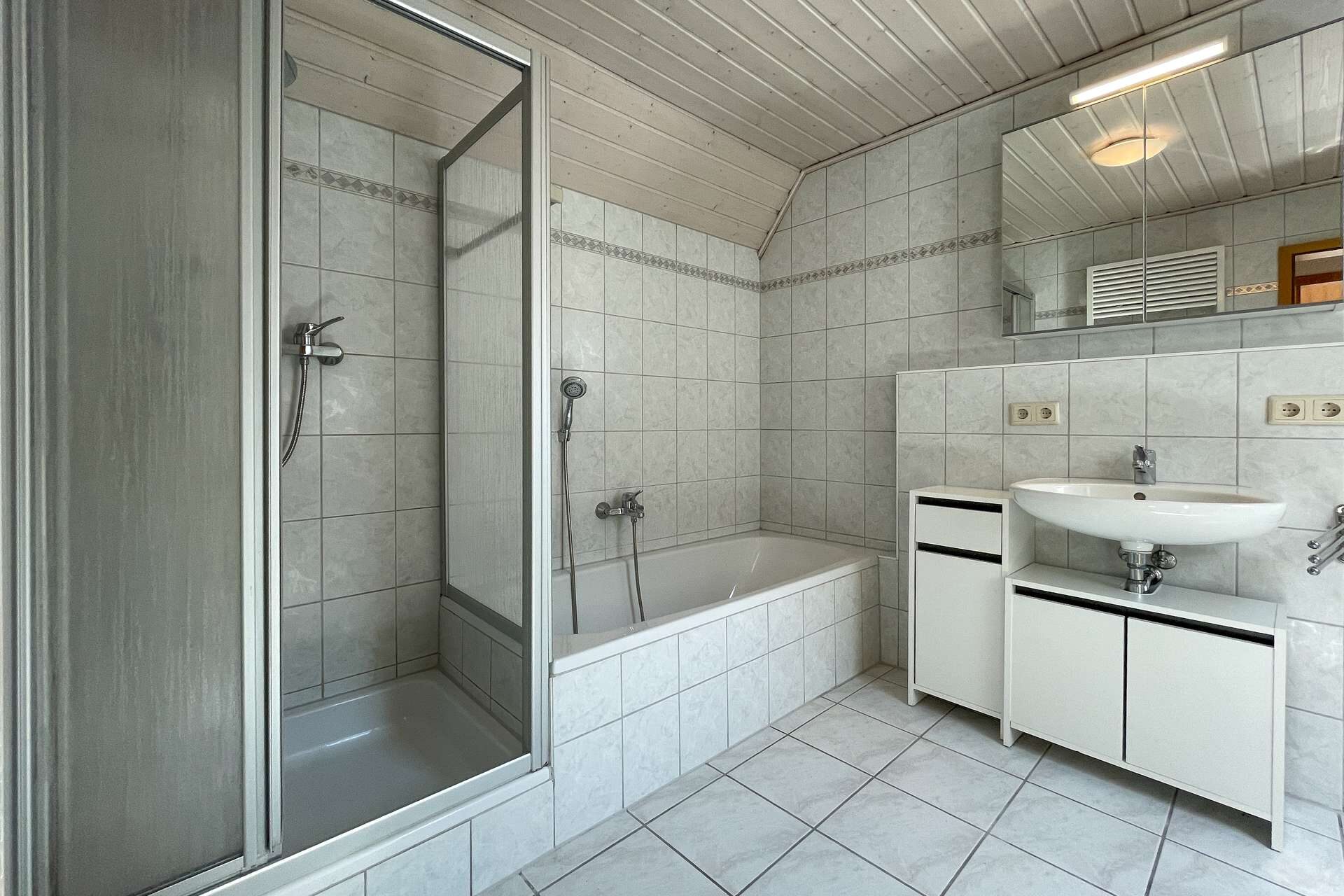 Das Dachgeschoss beherbergt ein ruhiges Schlafzimmer sowie ein geräumiges Badezimmer mit Badewanne und Dusche – perfekt zum Entspannen am Abend.