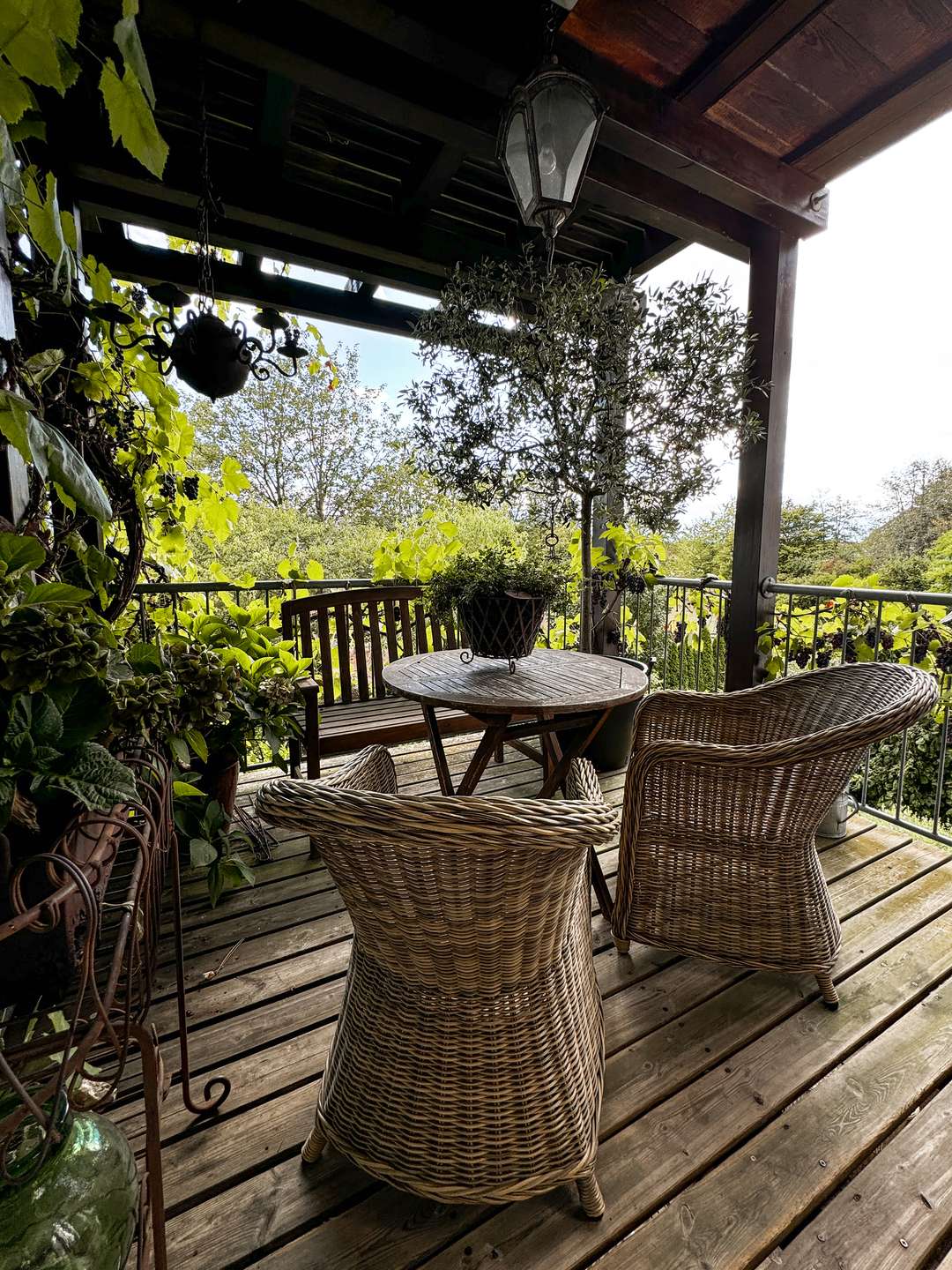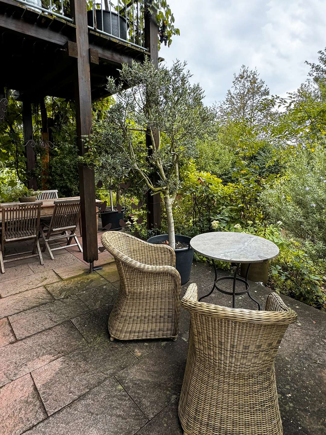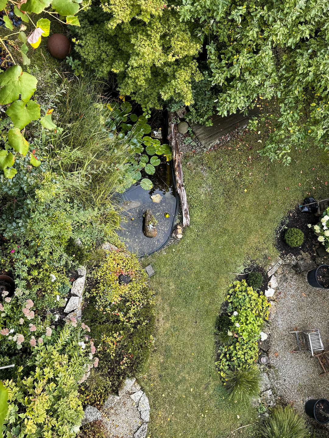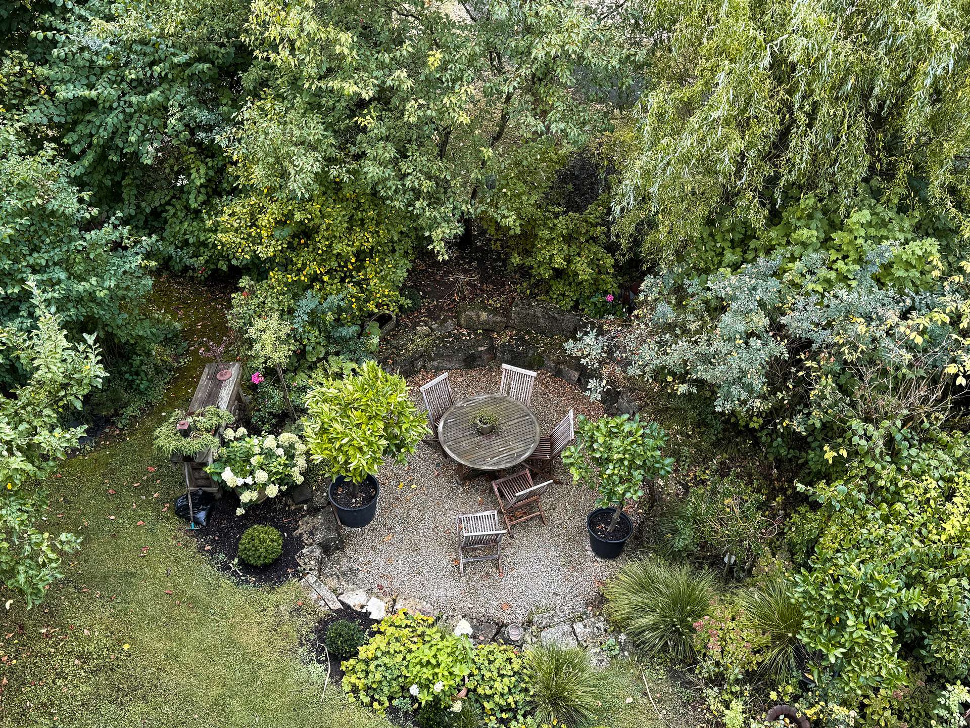 Der idyllisch angelegte Garten begeistert mit Natursteinen, einer tiefergelegten Sitzgelegenheit, altem Obstbestand und einem charmanten Gartenteich – der perfekte Ort zum Entspannen und Genießen der Natur.