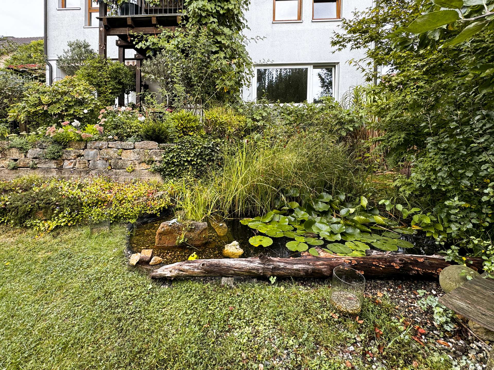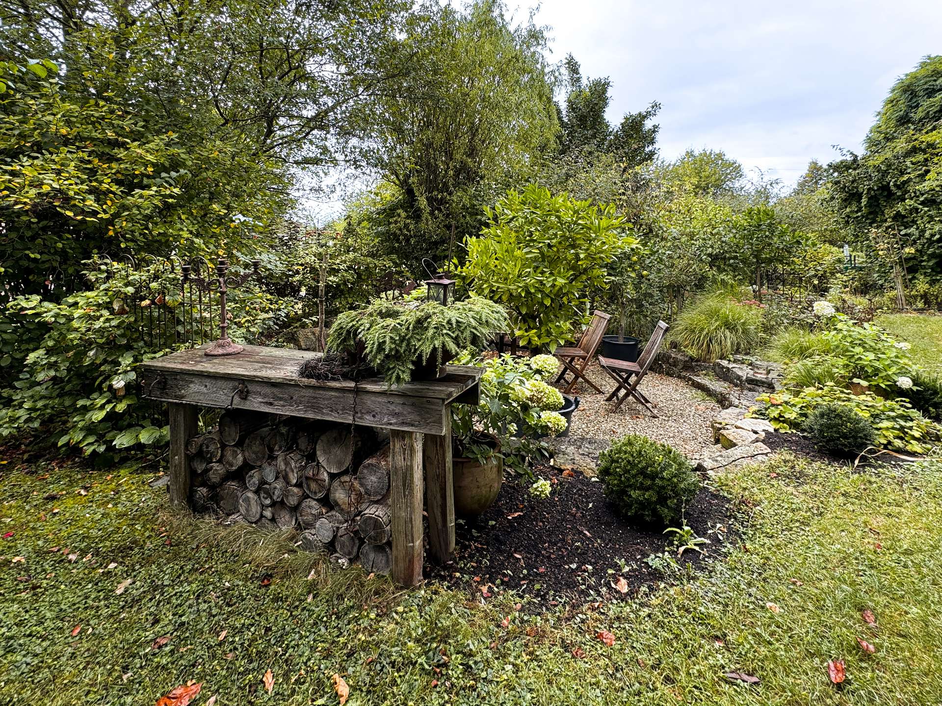 Der idyllisch angelegte Garten begeistert mit Natursteinen, einer tiefergelegten Sitzgelegenheit, altem Obstbestand und einem charmanten Gartenteich – der perfekte Ort zum Entspannen und Genießen der Natur.