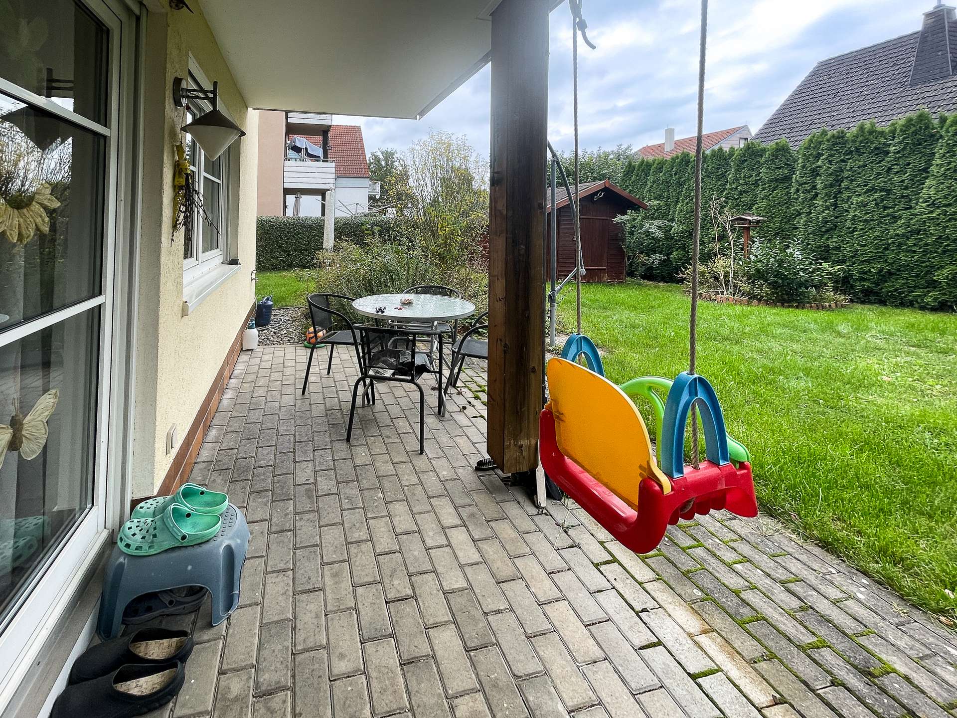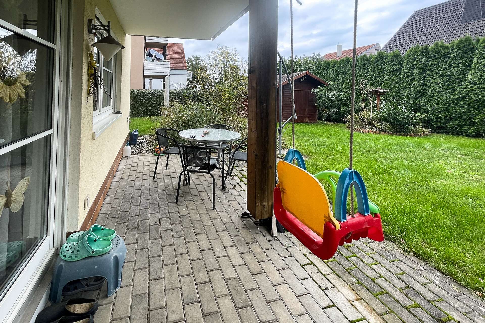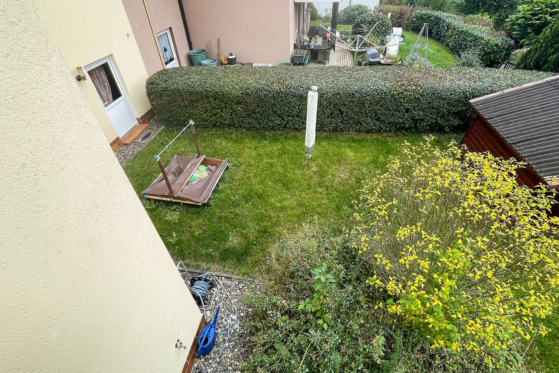 Von der überdachten Terrasse gelangt man direkt in den ca. 140 m² großen Garten – ein echtes Highlight, das die Wohnqualität zusätzlich steigert.