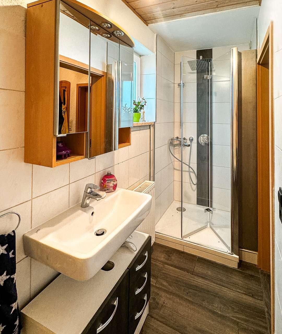 Über eine helle Massivholztreppe gelangen Sie in das erste Obergeschoss – rechter Hand befindet sich das Hauptschlafzimmer mit kleinem Ankleidezimmer. Die lichtdurchflutete Küche ist bereits möbliert und gewährt den Zugang zum Wohnzimmer. Vom Flur aus gelangen Sie in das 2019 sanierte Badezimmer mit Tageslicht. Dieses verfügt neben einer Toilette und einem Handwaschbecken auch über eine bodentiefe Dusche.
