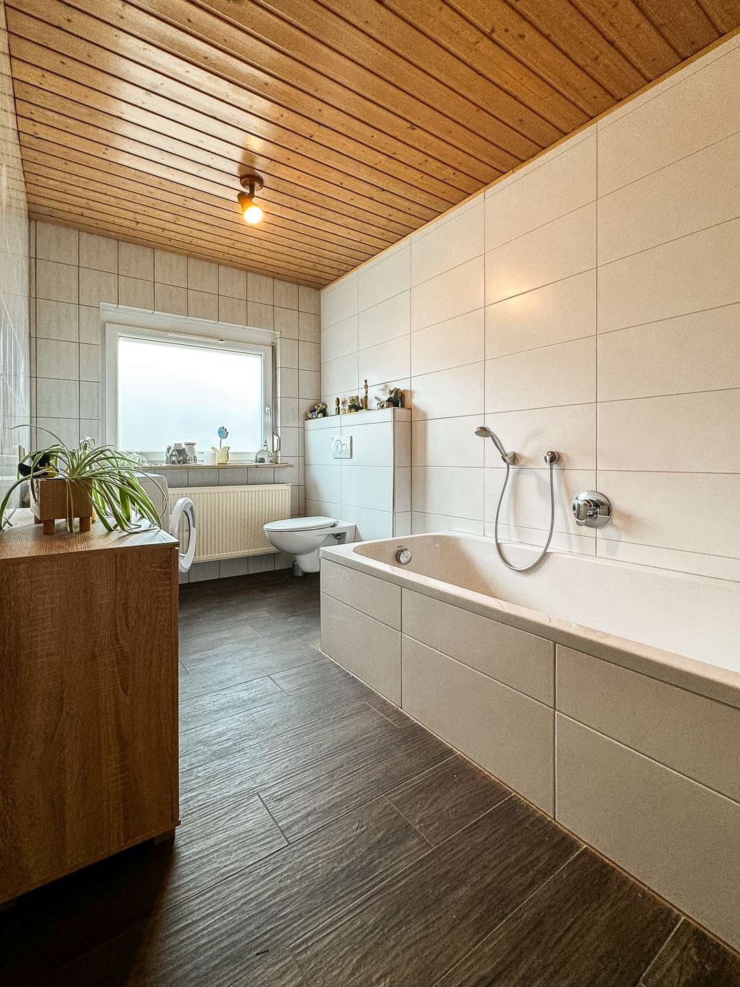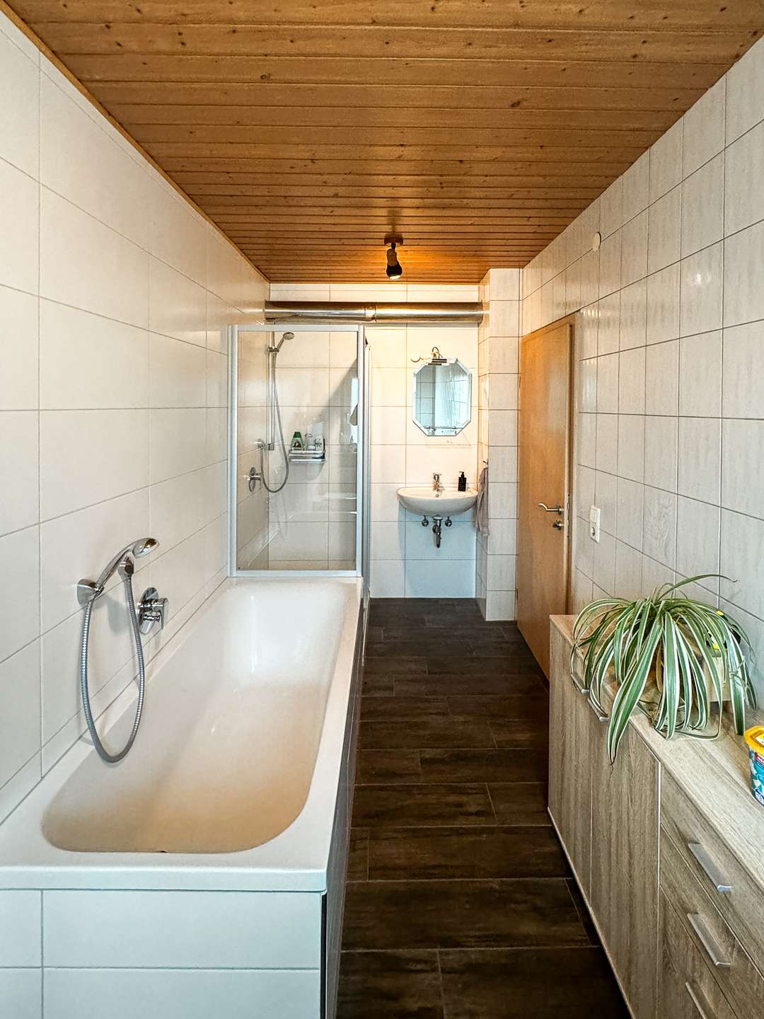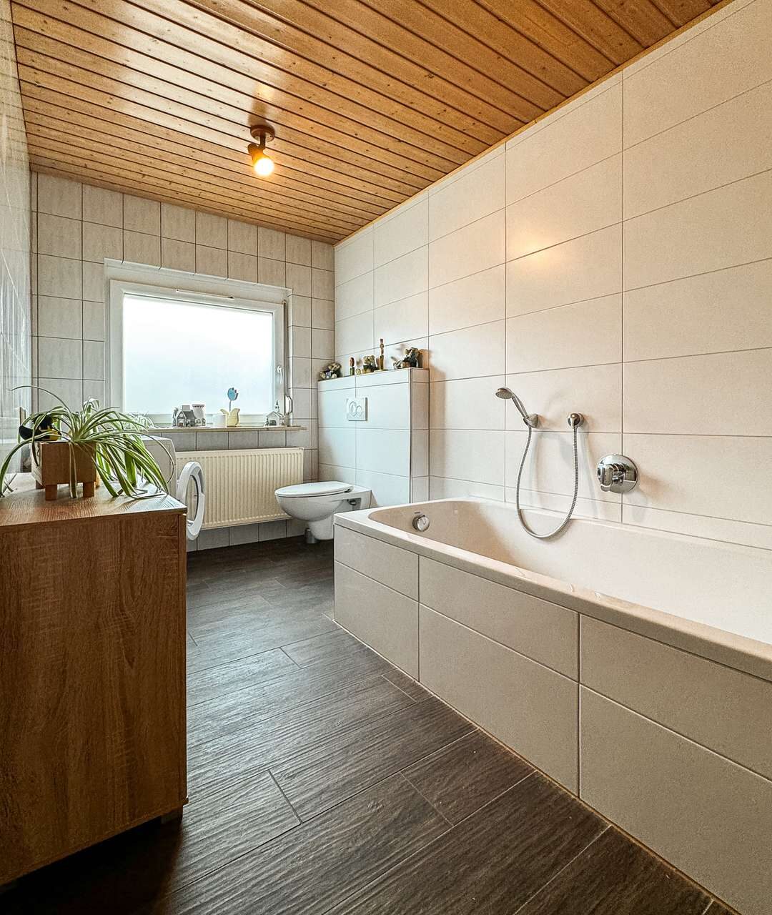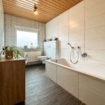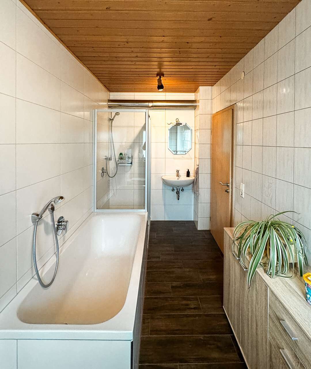 Im Erdgeschoss befindet sich eine Küche, ein Badezimmer, der Heizungsraum und zwei Abstellräume – von hier gelangen Sie auf die Terrasse und in den Garten hinter dem Haus. Das Badezimmer aus dem Jahr 2019 verfügt über eine Badewanne und eine Dusche auch der Anschluss für die Waschmaschine ist hier untergebracht.