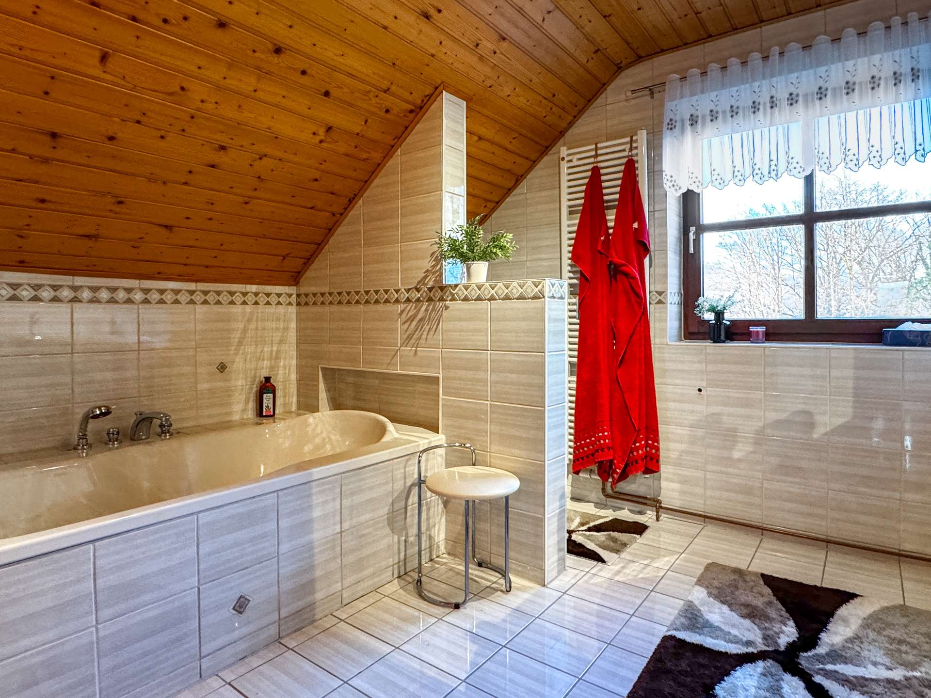 Über eine Buchenholztreppe gelangen Sie in den Privatbereich des Hauses. Ein großer Flur gewährt den Zugang zu allen Räumen. Das Obergeschoss verfügt über insgesamt 3 Schlafzimmer, einen Balkon und das Hauptbadezimmer. Die Ausstattung des Badezimmers lässt keine Wünsche offen, helle Fliesen, eine großzügige Badewanne, eine Dusche und Tageslicht – was will man mehr? Die Räume lassen sich natürlich individuell nutzen, ob Schlafzimmer, Kinderzimmer oder Ankleidezimmer – es entscheiden allein Ihre persönlichen Bedürfnisse.