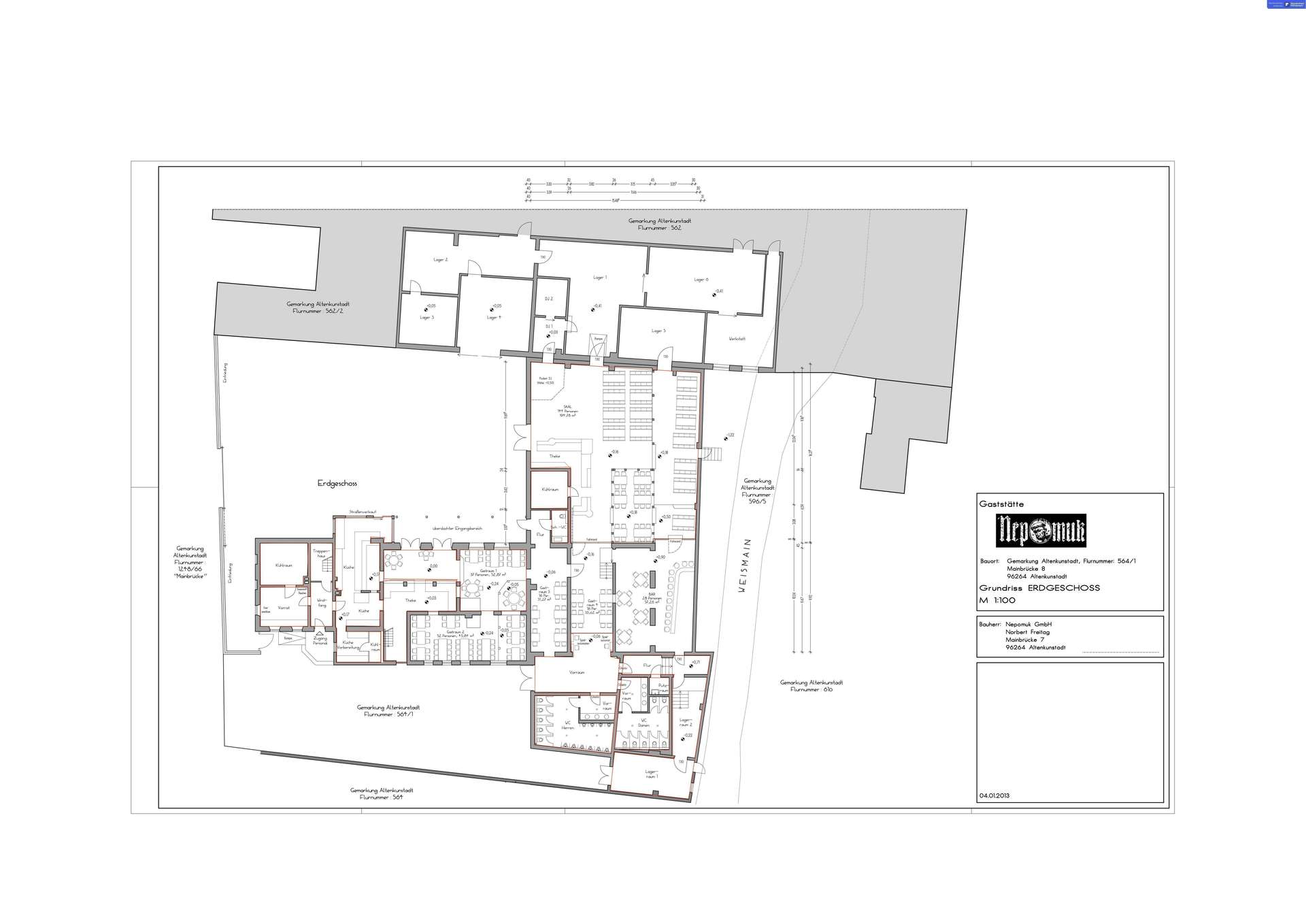 Das Gebäude wurde im Jahr 1900 auf dem 1771 m² großen Grundstück in massiver Bauweise errichtet und verfügt insgesamt über 1288 m² Nutzfläche. Diese beinhaltet neben den 1152 m² Gewerbeflächen auch eine wunderschöne Betreiberwohnung im Obergeschoss mit insgesamt 5 Zimmer auf 136 m². Auch ein Biergarten mit großer Markise und Glasüberdachung gehört zu diesem Objekt.