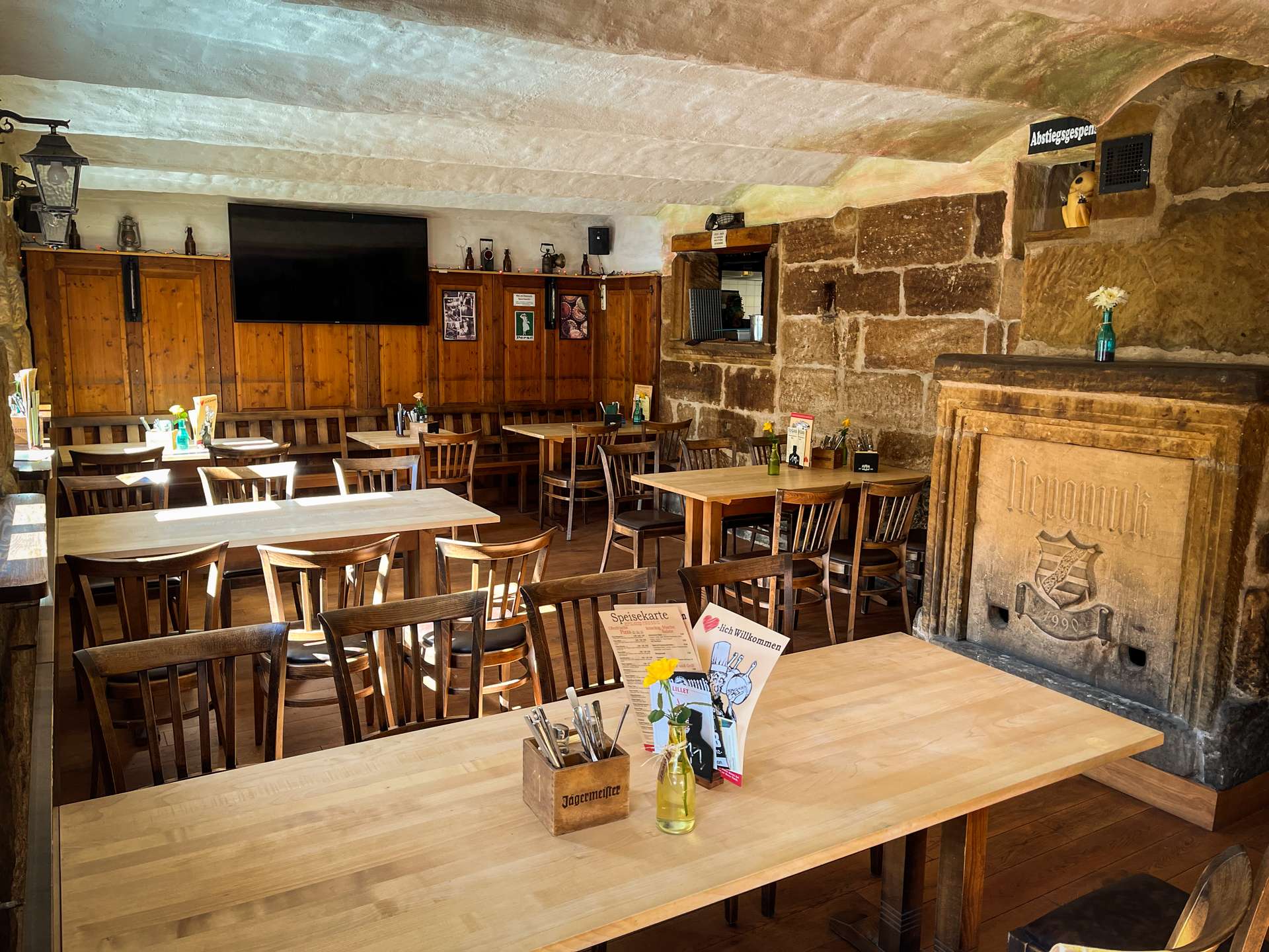 Im Erdgeschoss stehen insgesamt 4 Gasträume mit 120 Sitzplätzen, eine Bar und ein Saal für bis zu 500 Personen zur Verfügung. Der Biergarten bietet Platz für weitere 300 Gäste. Somit bietet dieses Objekt Platz für fast 900 Gäste.