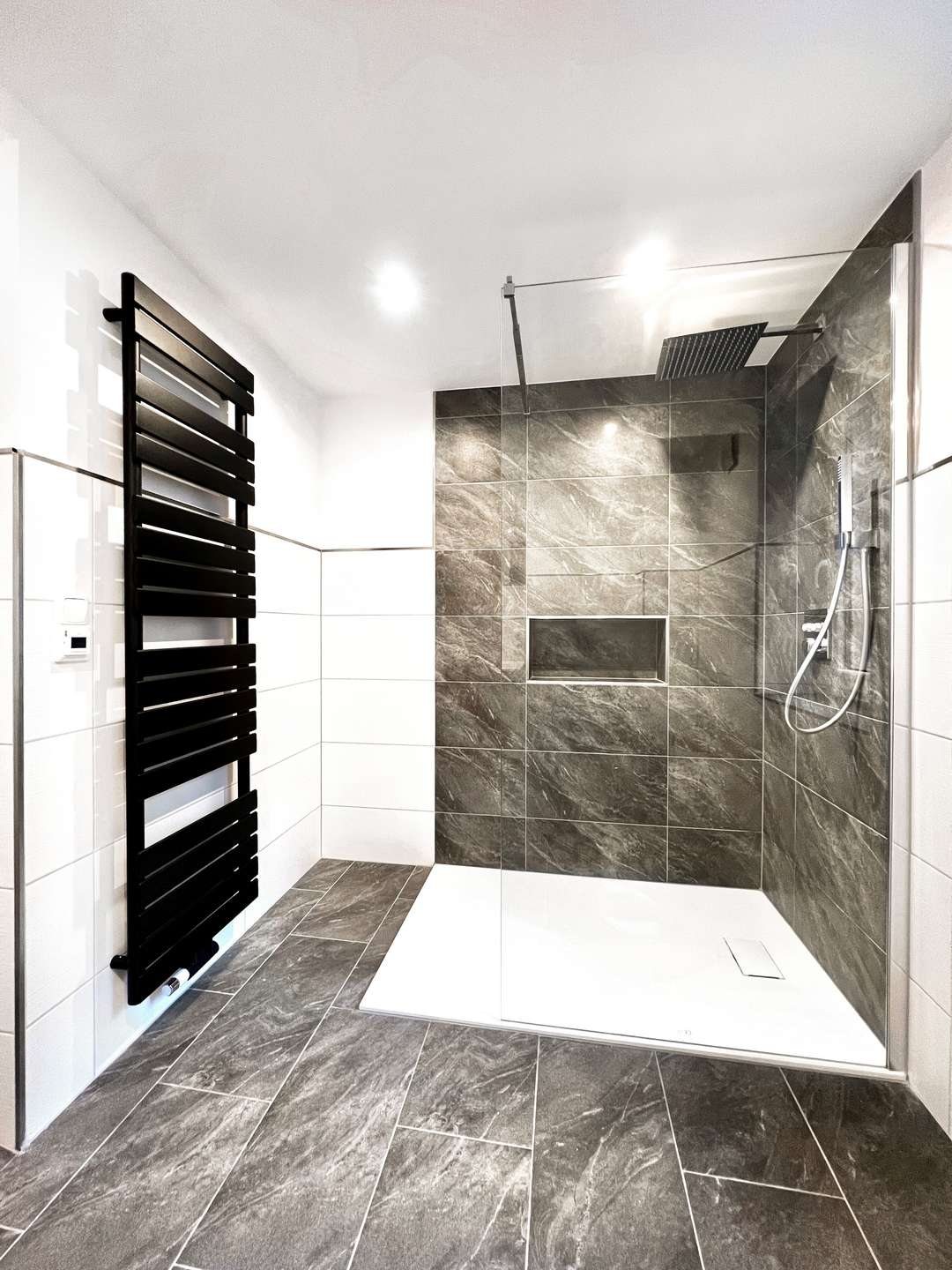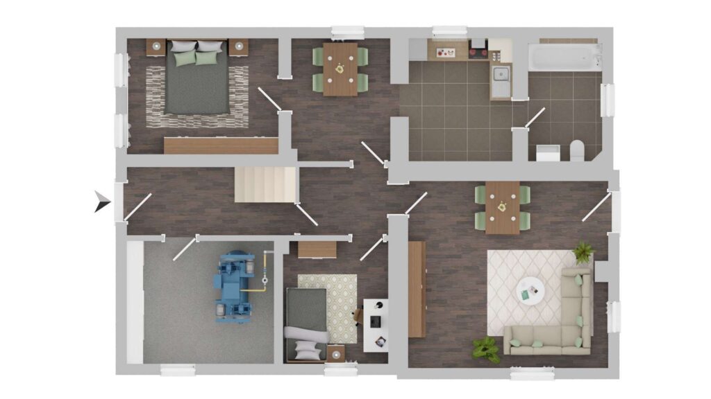 Hinter der Küche befindet sich das Badezimmer mit bodenebener Dusche, Toilette und Waschbecken. Die modernen Fliesen in Grau und Weißtönen ergänzen sich perfekt mit den modernen Glas und Holzelementen, auch hier haben Sie keine Probleme durch hohe Duschwannen oder zu wenig Platz. Der Flur bietet ebenso Zugang zum großzügigen Wohnzimmer, der lichtdurchflutete Raum ergänzt sein Wohlfühlambiente mit einem Kaminanschluss und dem Zugang zur eigenen Terrasse. Perfekt für gemütliche Sommerabende. Auch das Schlafzimmer bietet viel Licht und Wohnkomfort, dieses erreichen Sie ebenfalls vom Flur. Alle Räume verfügen über große Fenster und sind mit hochwertigem Vinyl in moderner Holzoptik ausgelegt. Bei Bedarf kann eine Garage auf dem Grundstück mit erworben werden.