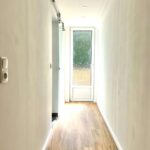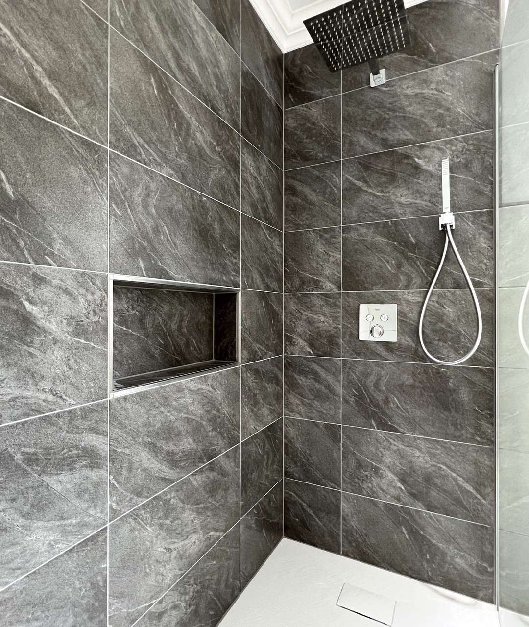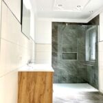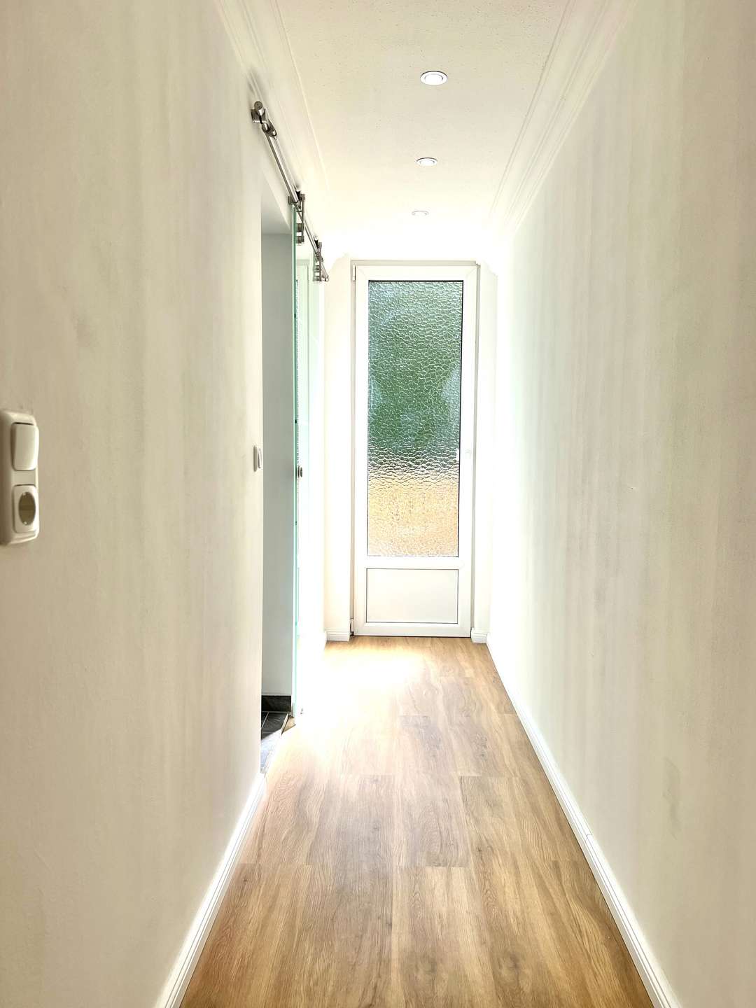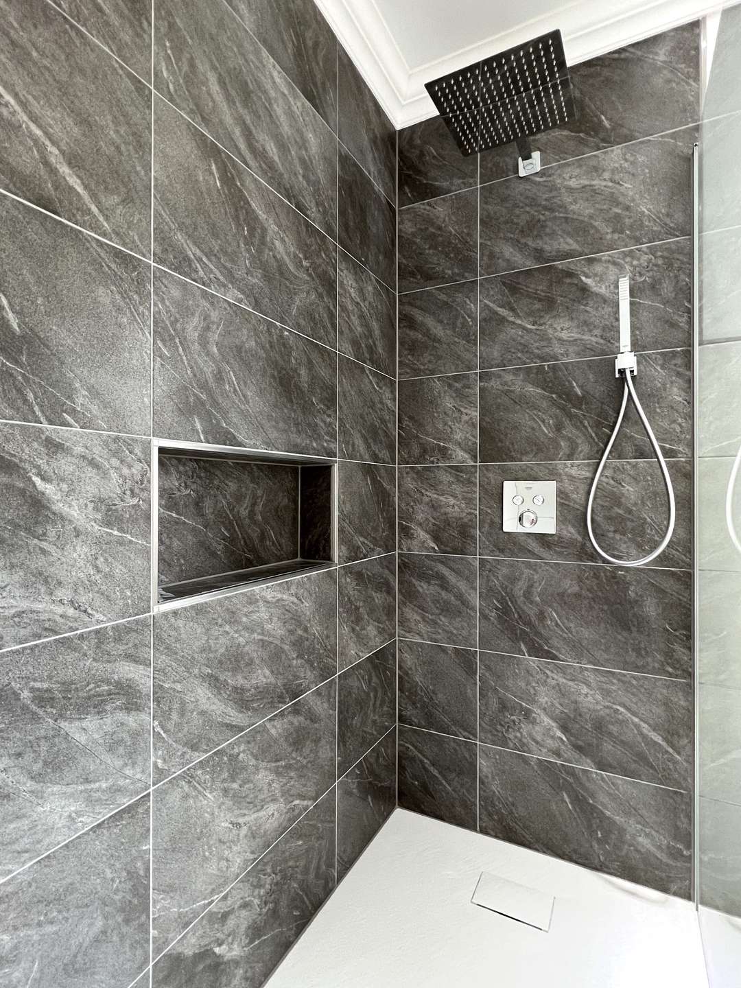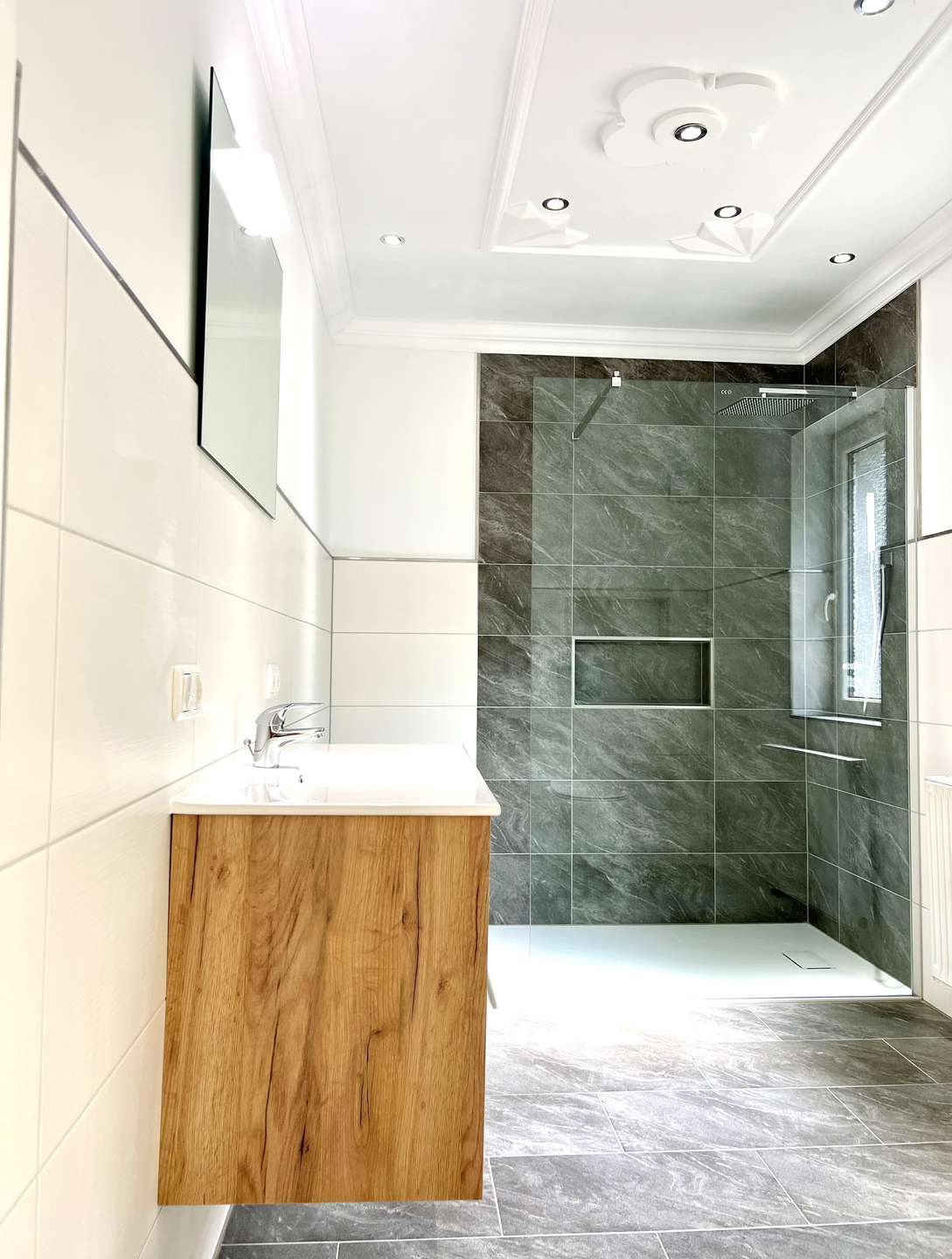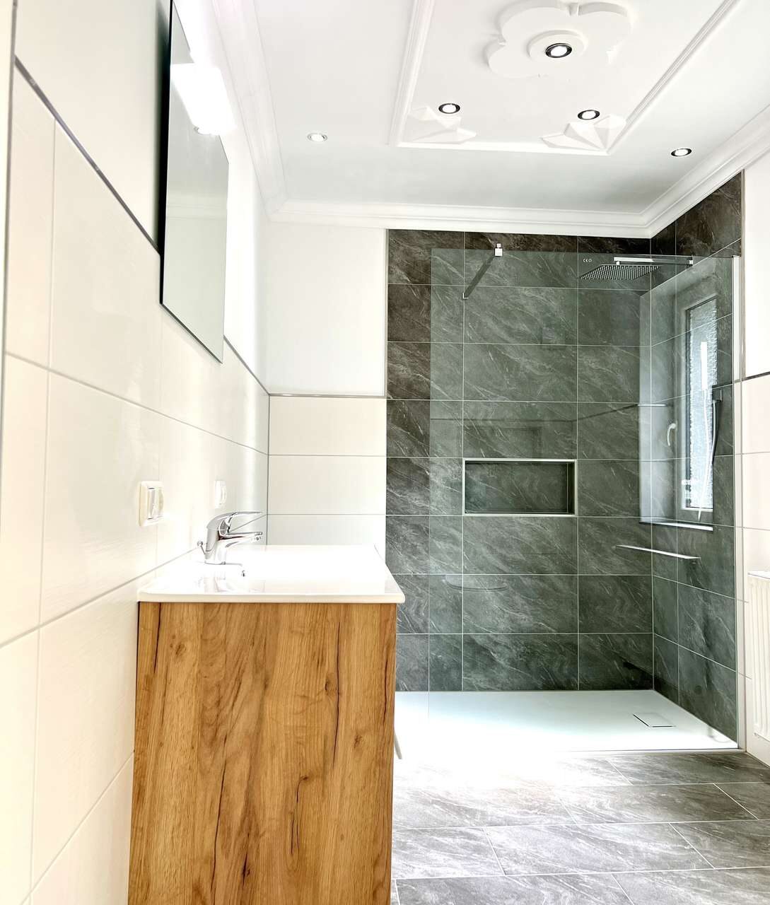 Der Flur bietet außerdem noch Zugang zum Badezimmer mit bodenebener Dusche, Fenster, Toilette und Waschbecken. Die modernen Fliesen in Grau und Weißtönen ergänzen sich perfekt mit den Stuckelementen an der Decke. Zwischen dem Badezimmer und Wohnzimmer befindet sich ein kleiner Balkon, da dieser auf der Rückseite des Hauses liegt, können Sie hier ungestört verweilen.