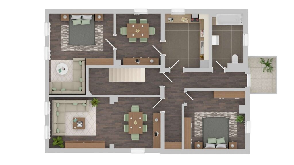 Vom zentralen Flur gelangen Sie linker Hand in die Küche, diese bietet ausreichend Platz für Ihre Traumküche. Im Anschluss an die Küche gelangen Sie in das Esszimmer, die wunderschönen Stuckelemente an den Wänden und im Durchgang geben dem hellen Raum einen außergewöhnlichen Charme. Hinter dem Esszimmer befindet sich ein weiterer Raum, welcher vielfältig genutzt werden kann. Ob Büro-, Kinderzimmer oder Gästezimmer, hier können Sie Ihren Wohntraum einrichten.