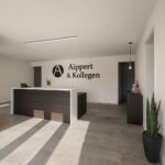 Edle Fliesen- und Teppichböden unterstreichen den hochwertigen Charakter der Räume. Das barrierefreie Konzept gewährleistet eine komfortable Erreichbarkeit für Mitarbeiter und Kunden.