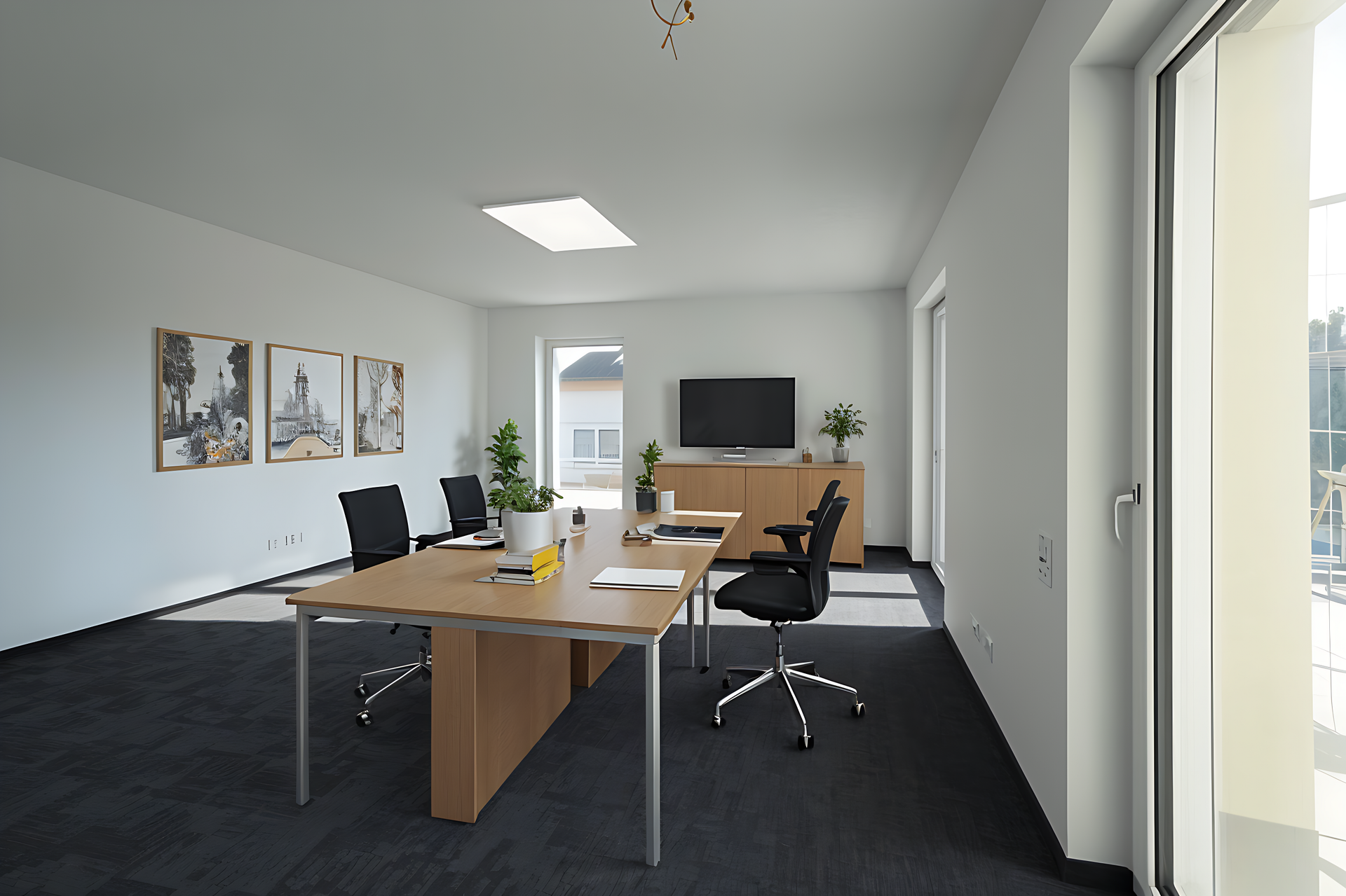 Großzügige Fensterflächen fluten die Etage mit Tageslicht und schaffen ein Ambiente, das Offenheit, Leichtigkeit und Inspiration ausstrahlt. Hier entsteht eine Arbeitswelt, die Motivation und Wohlbefinden fördert – ein Ort, an dem Ideen wachsen und Visionen Realität werden.