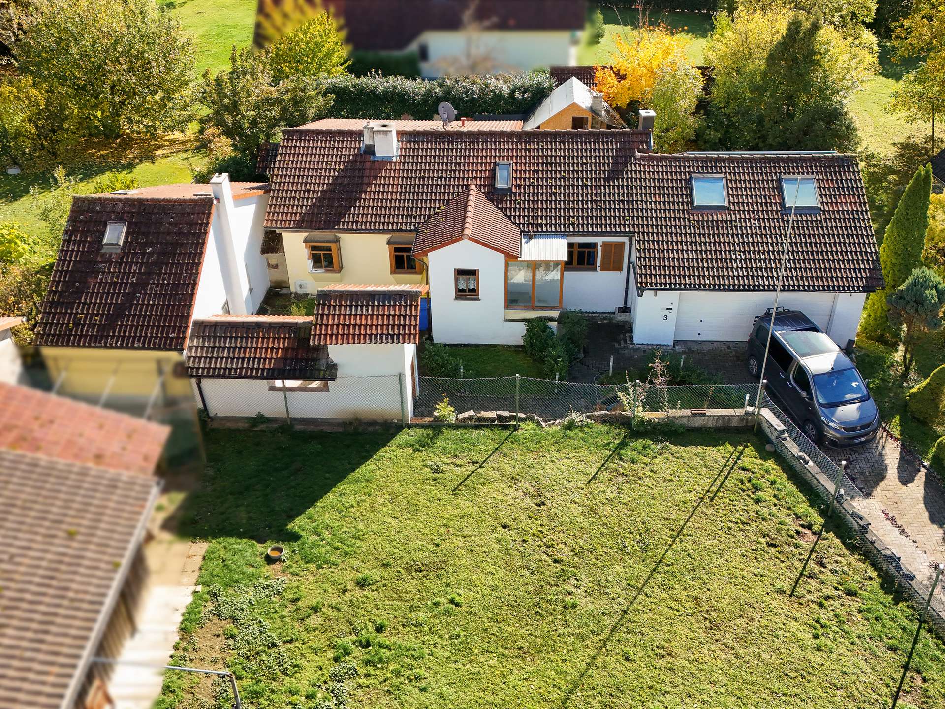 Zum Anwesen gehören außerdem eine Doppelgarage inklusive Abstellraum und ein zusätzlicher Stellplatz im Freien.