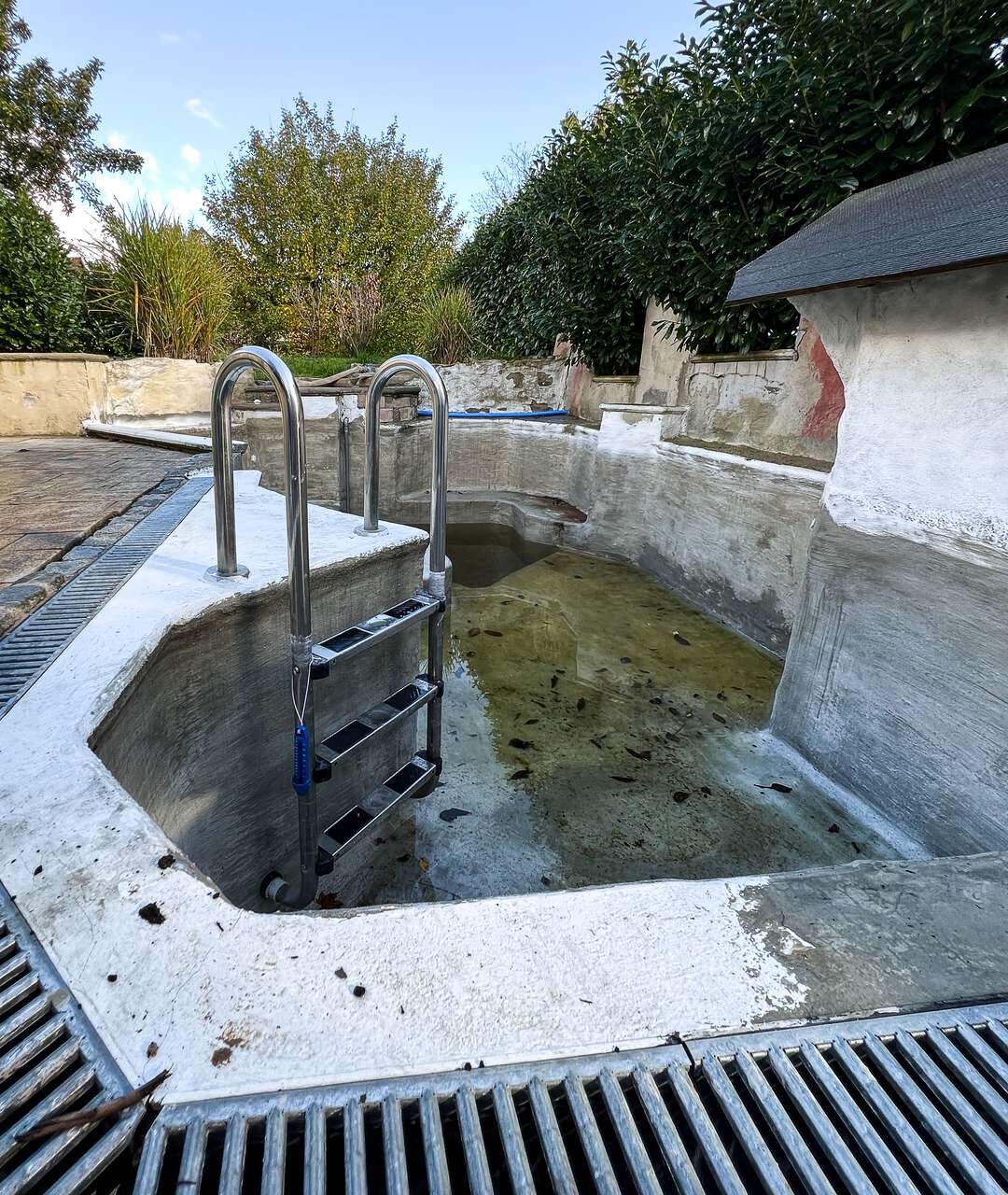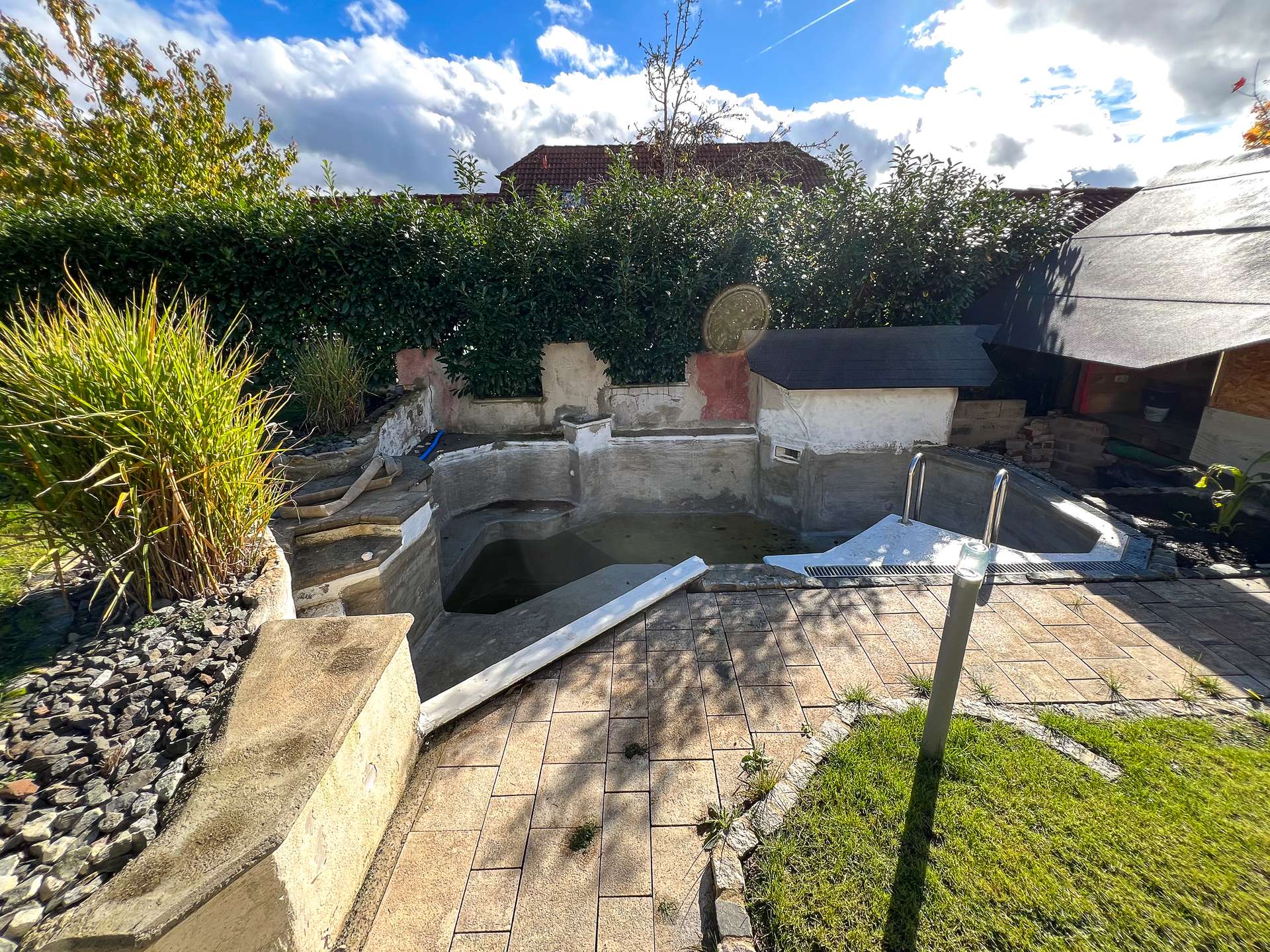 Der Außenbereich bietet großzügige Gestaltungsmöglichkeiten. Der Garten ist weitläufig und verfügt über eine Terrasse sowie einen Pool inklusive eines kleinen Poolhauses, welche sich derzeit im finalen Bauabschnitt befinden. Mit etwas Feinarbeit lässt sich hier eine wunderschöne Erholungsoase gestalten. Die gepflegten Grünflächen und die ruhige Umgebung unterstreichen das angenehme Wohngefühl und bieten viel Raum für Freizeit und Familie.