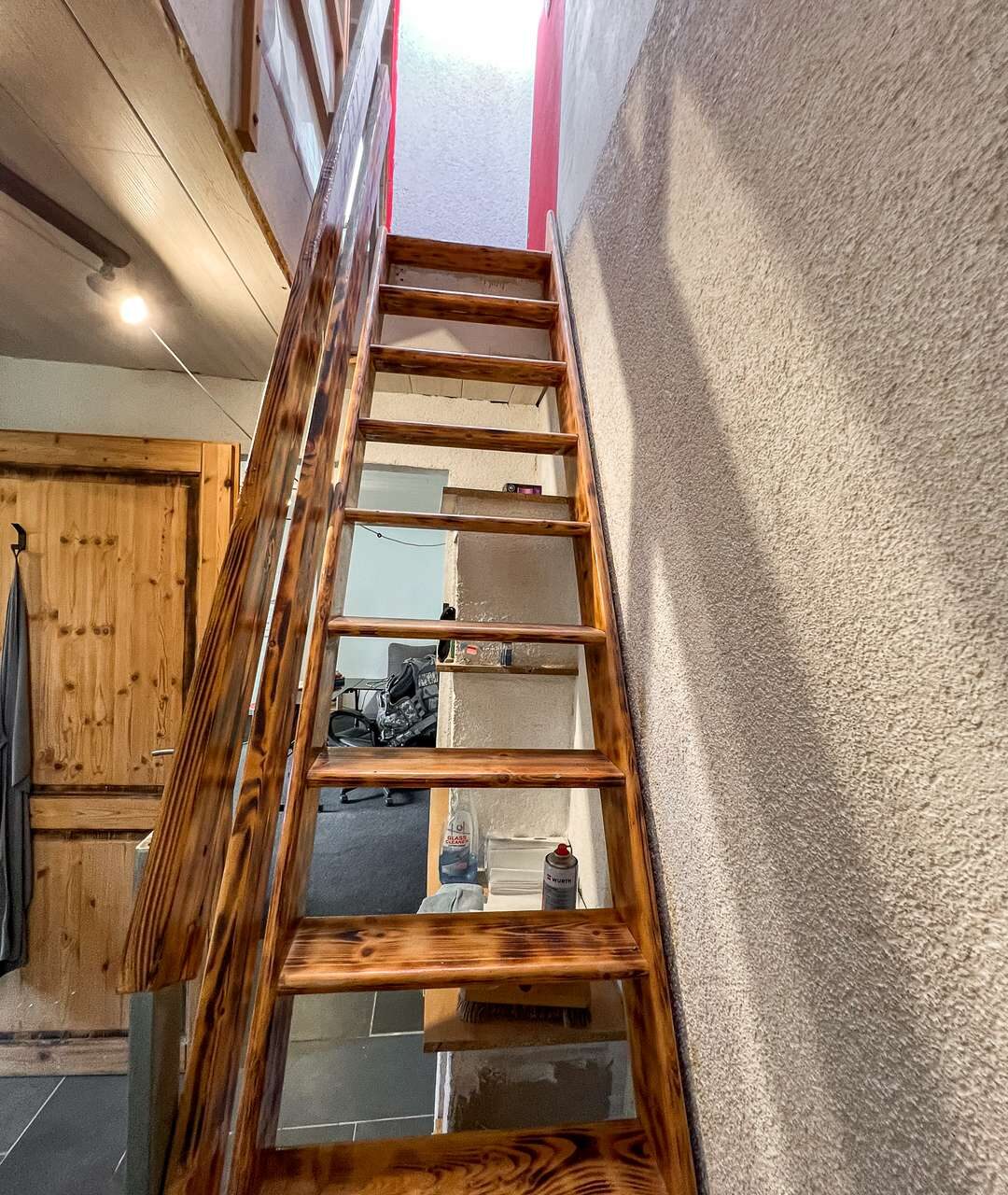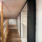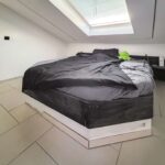 Auch hier befindet sich ein kompaktes Obergeschoss mit Dachschrägen, welches über eine kleine Treppe erreichbar ist und zusätzlichen Raum für ein Schlafzimmer, ein Ankleidezimmer und ein separates Bad mit Dusche bietet.