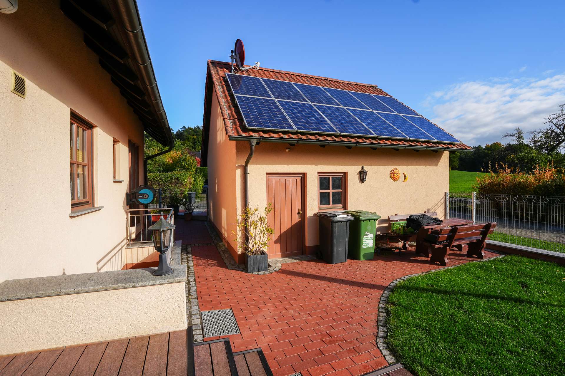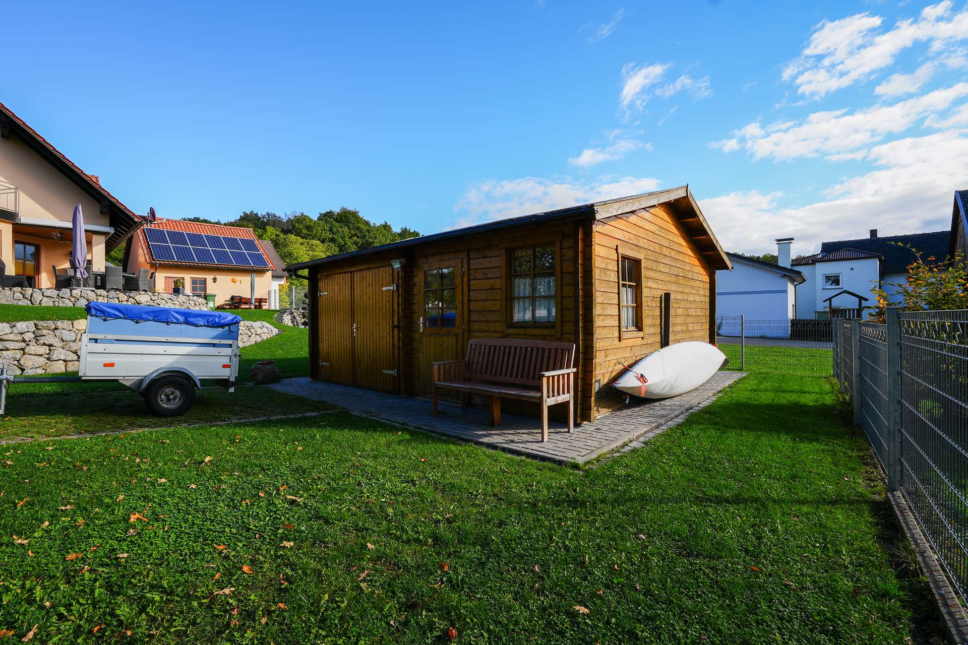 Zur Immobilie gehören eine Doppelgarage mit PV-Anlage, gepflegte Außenanlagen und ausreichend Stellplätze. Zusätzlich steht eine Gartenhütte zur Verfügung, die sich aufgrund ihrer Ausgestaltung auch als Garage nutzen lässt und über eine befestigte Zufahrt komfortabel erreichbar ist.