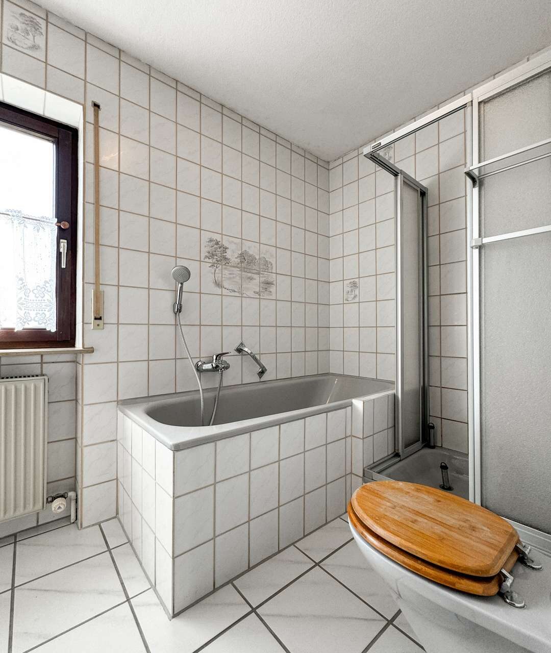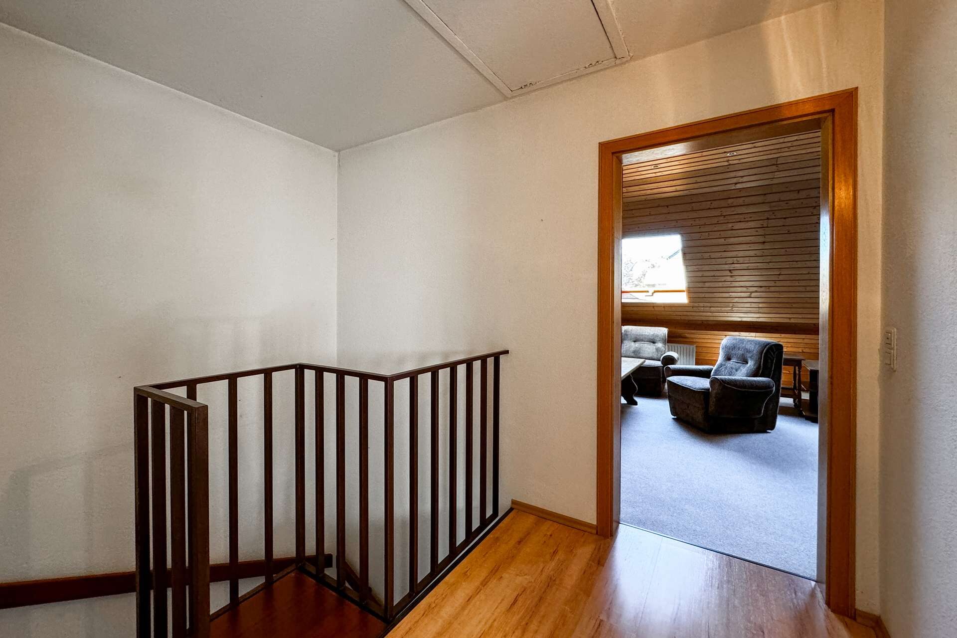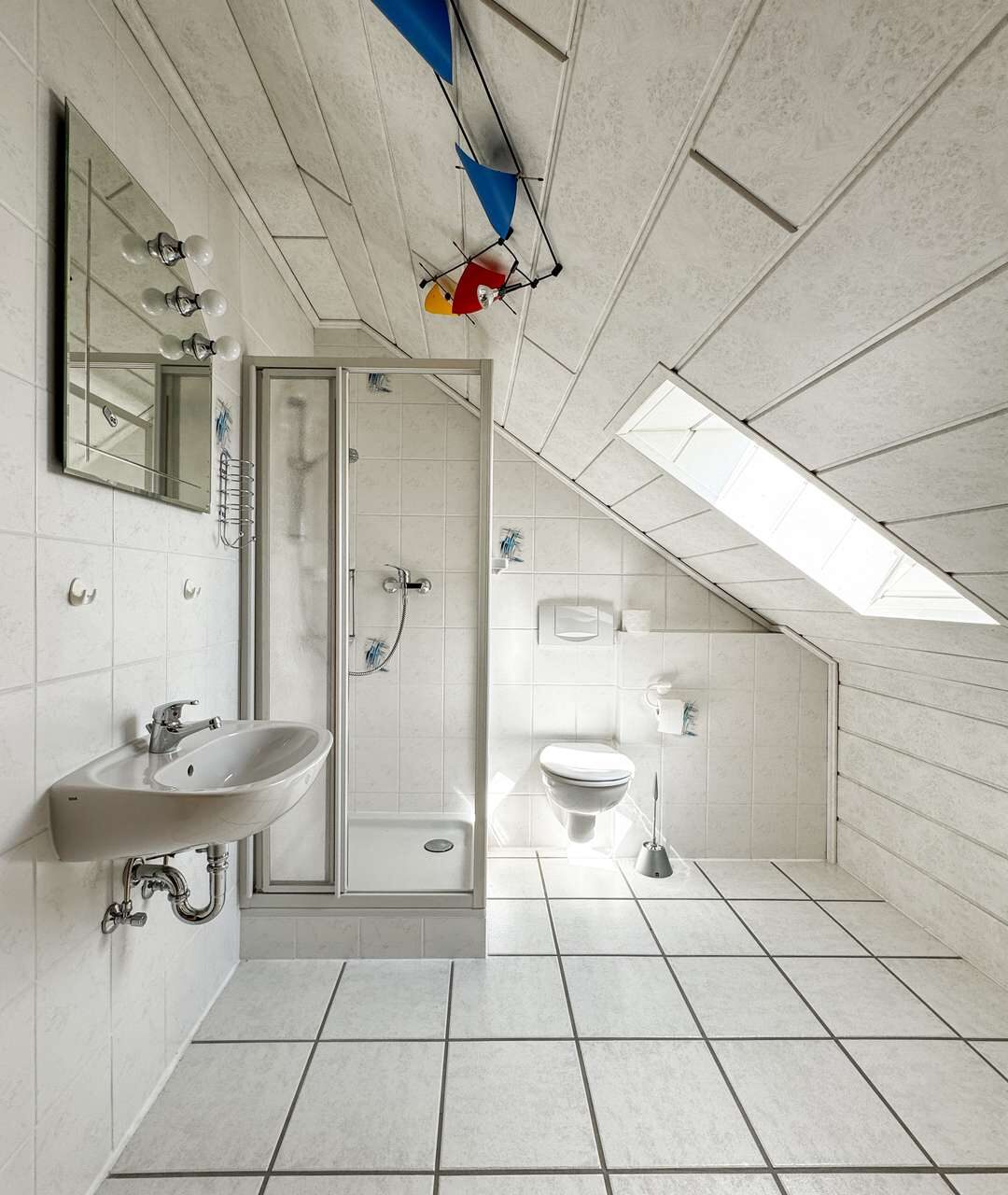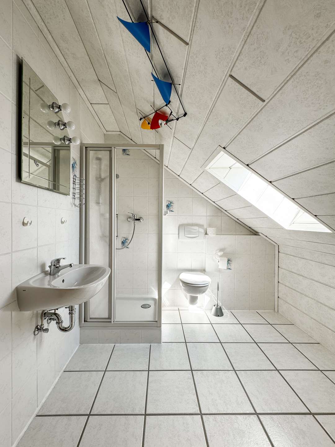 Im Obergeschoss befinden sich drei Schlafzimmer und ein helles Badezimmer mit Dusche und Badewanne. Hier finden Sie ausreichend Platz für die ganze Familie. Das Dachgeschoss bietet einen weiteren großen Raum, der sich ideal als Kinderzimmer, Arbeitszimmer oder Gästezimmer eignet. Auch hier ist ein Badezimmer mit Dusche vorhanden.