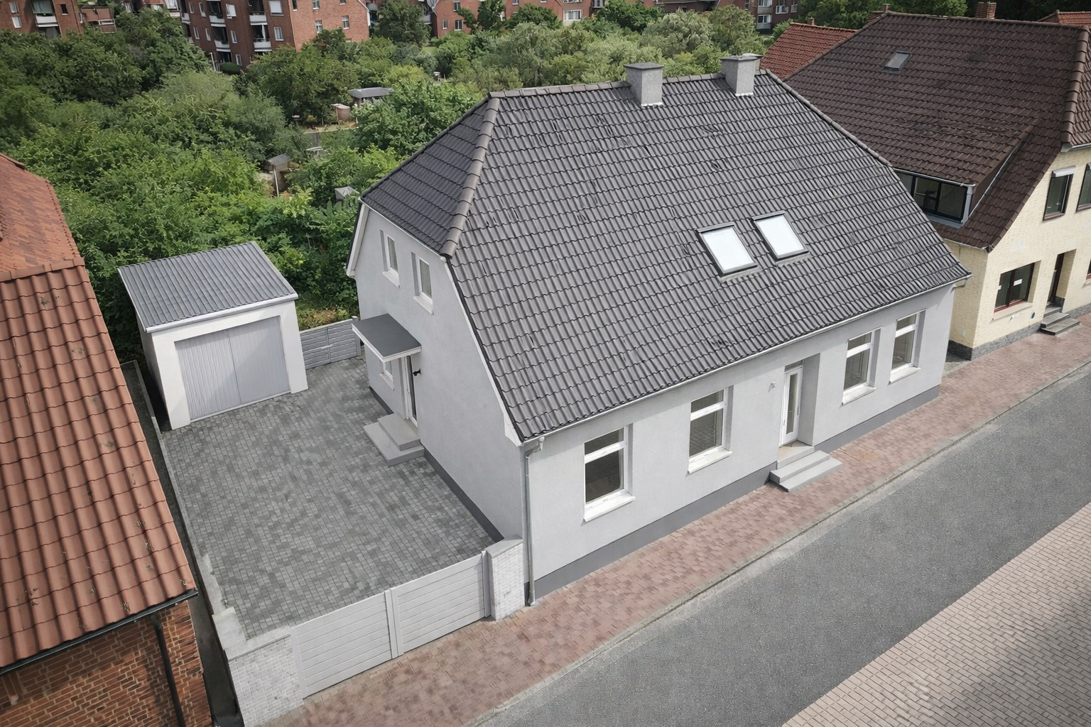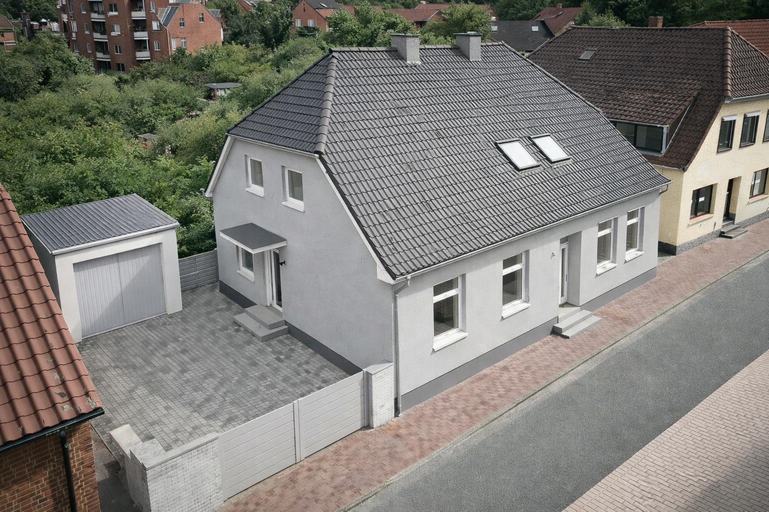 Der gepflasterte Innenhof bietet Platz für Fahrzeuge und einen geschützten Außenbereich. Eine Garage ergänzt das Angebot und sorgt für zusätzlichen Komfort. Weitere Abstell- und Nutzflächen stehen im Gebäude zur Verfügung.