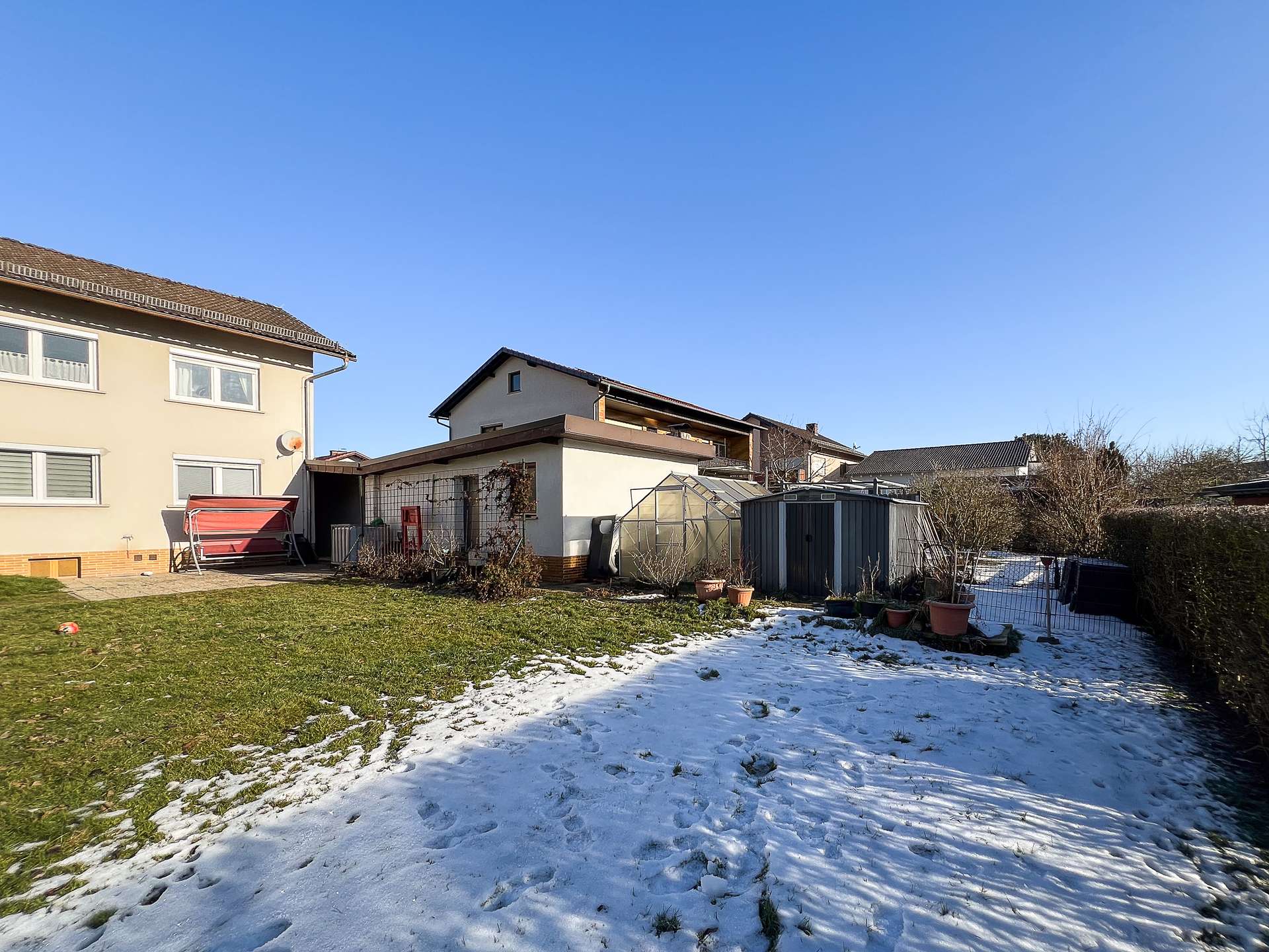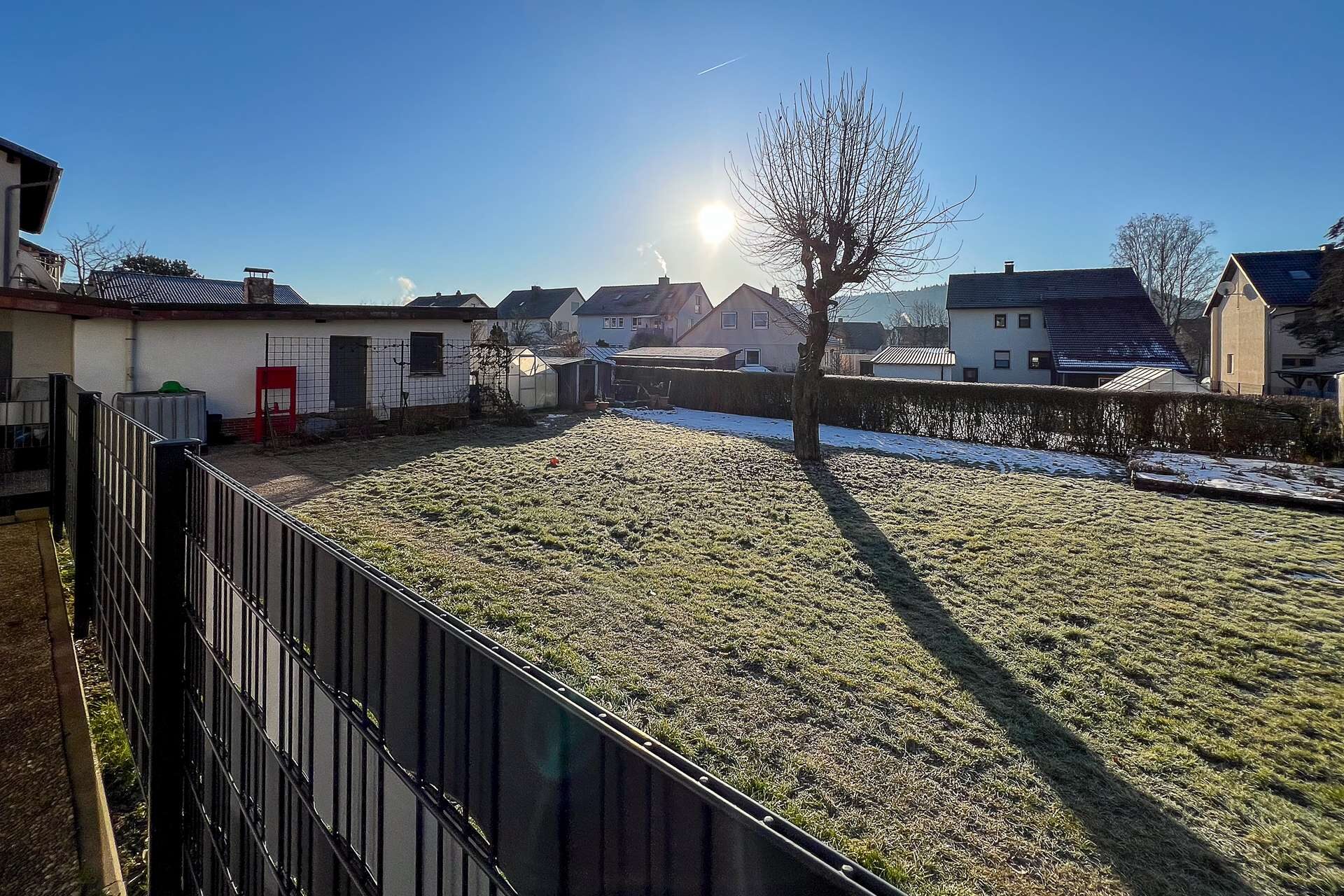Der Garten präsentiert sich großzügig, gepflegt und angenehm eingefasst durch Hecken, Zaunelemente und gewachsenen Baumbestand. Er bietet einen geschützten Rückzugsort mit viel Platz für Freizeit, Spiel oder Erholung.