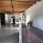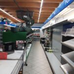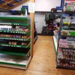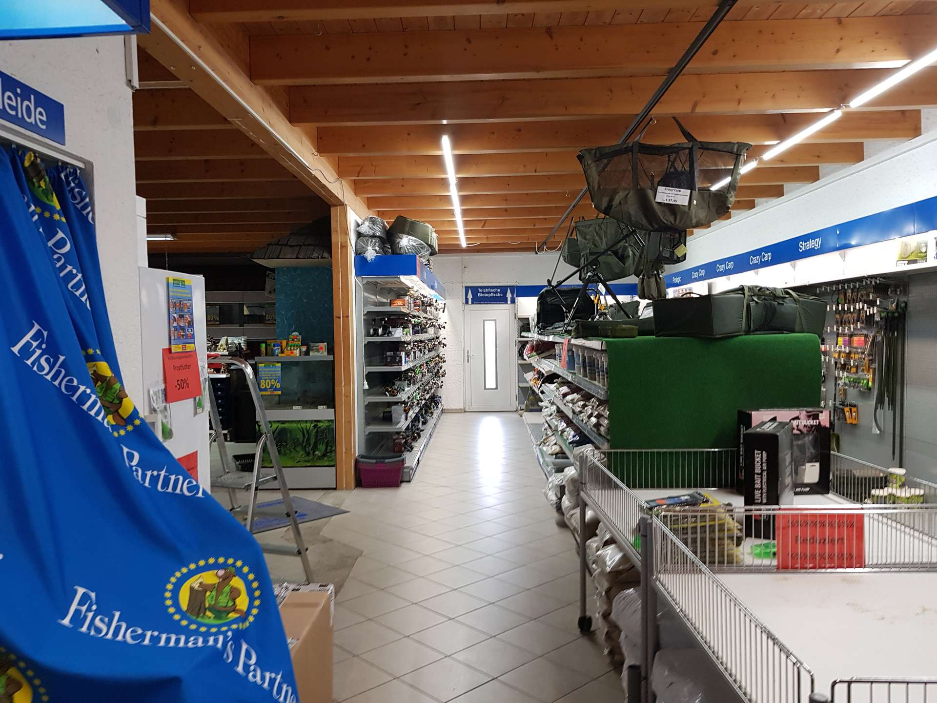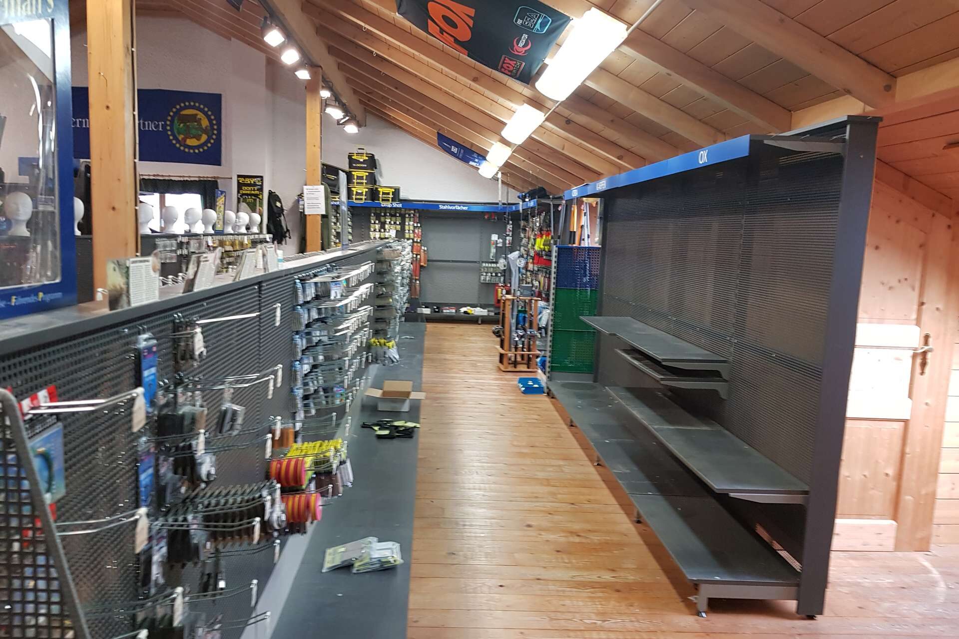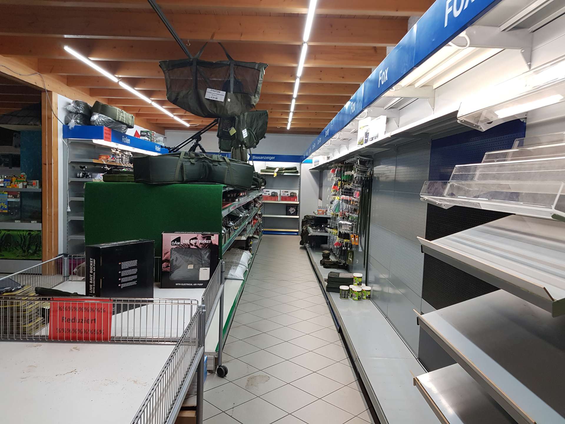 Das Gebäude ist teilweise mit Verkaufsregalen möbliert, die auf den Bildern zu