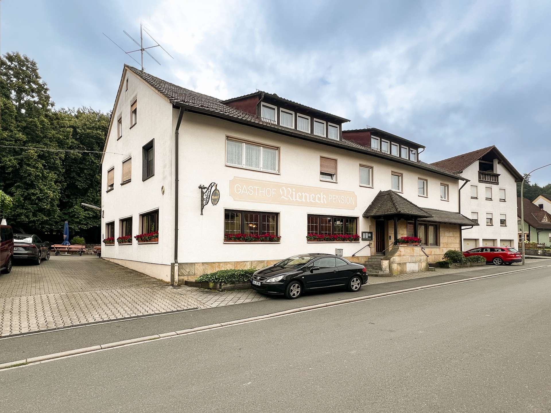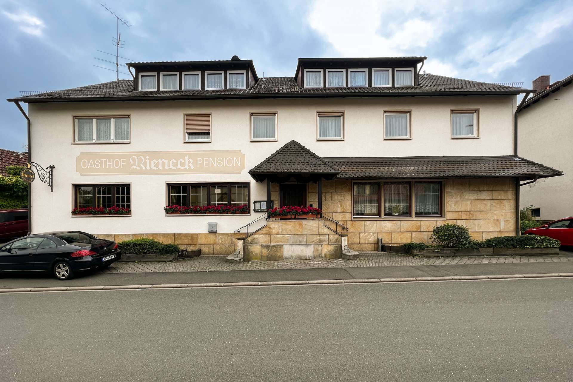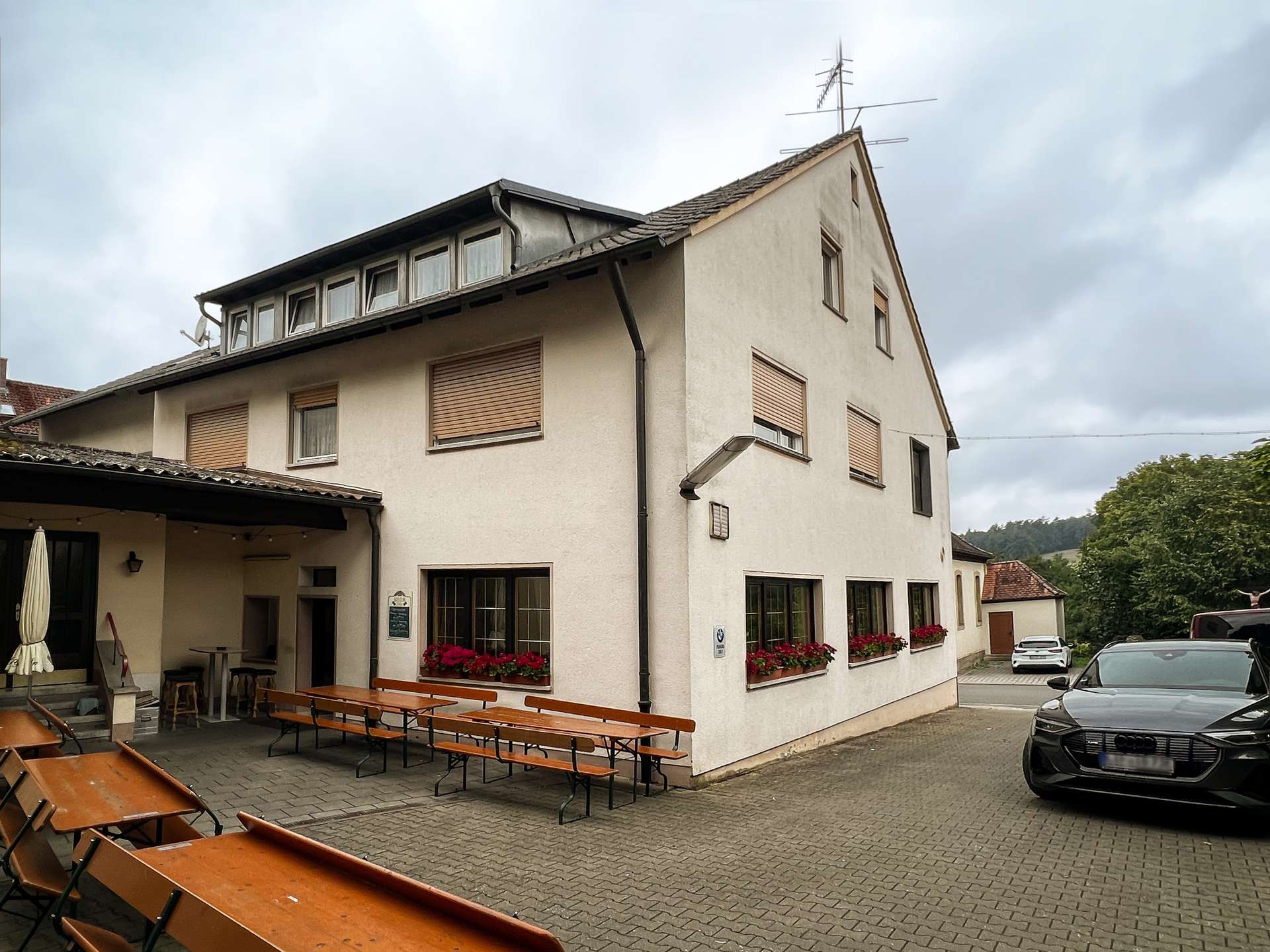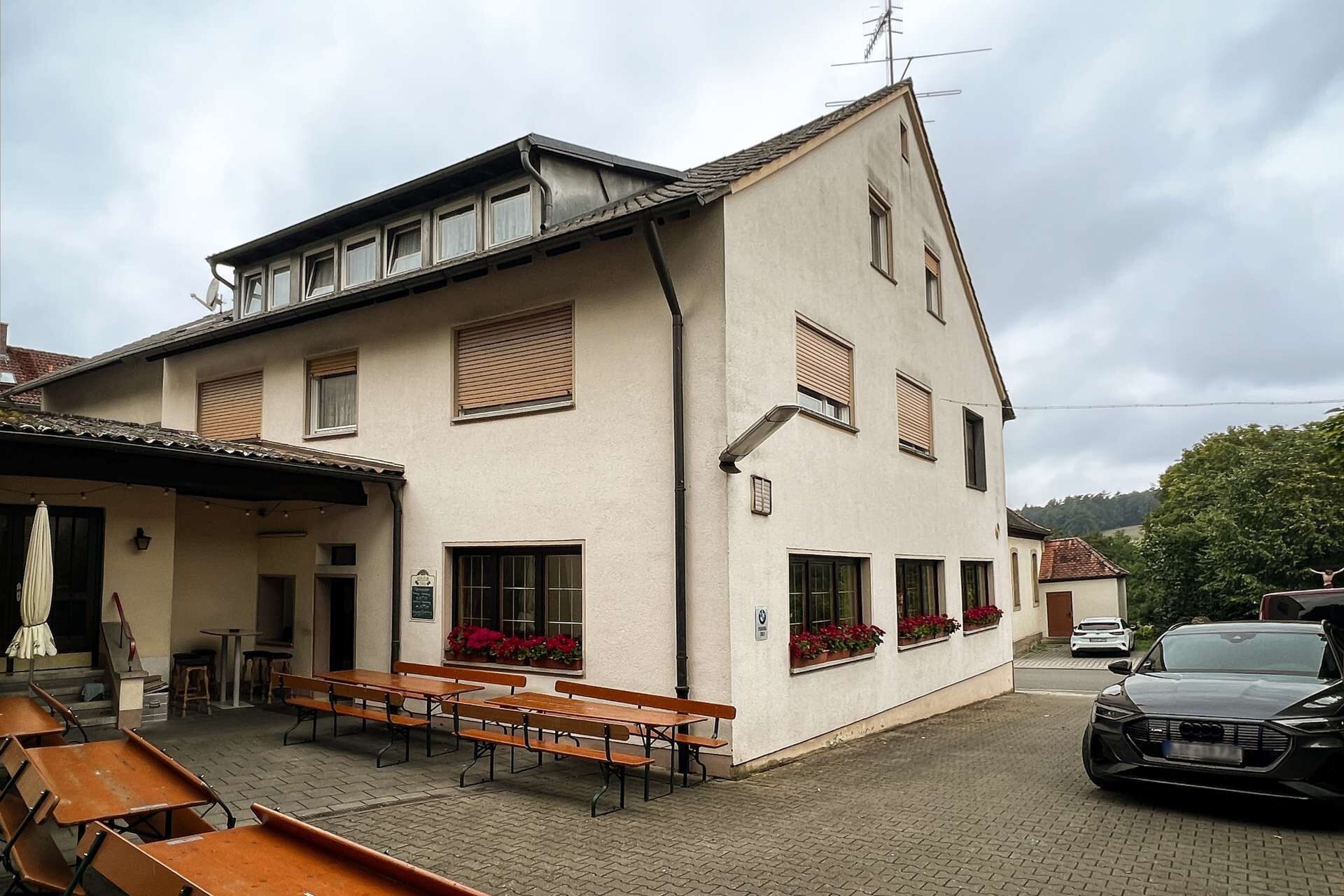 Das Hauptgebäude wurde auf dem 4622 m² großen Grundstück errichtet und fortlaufend erweitert, sowie instandgehalten. Im Erdgeschoss befindet sich die Gastwirtschaft mit großen Gasträumen, Küche und Sanitäranlagen. Der Saal wurde im Jahr 1956 angebaut und bietet ebenfalls eine großzügige Fläche für neuen Wohnraum. Eine Umnutzung zu Wohnungen lässt sich durch die großen Räume leicht realisieren.