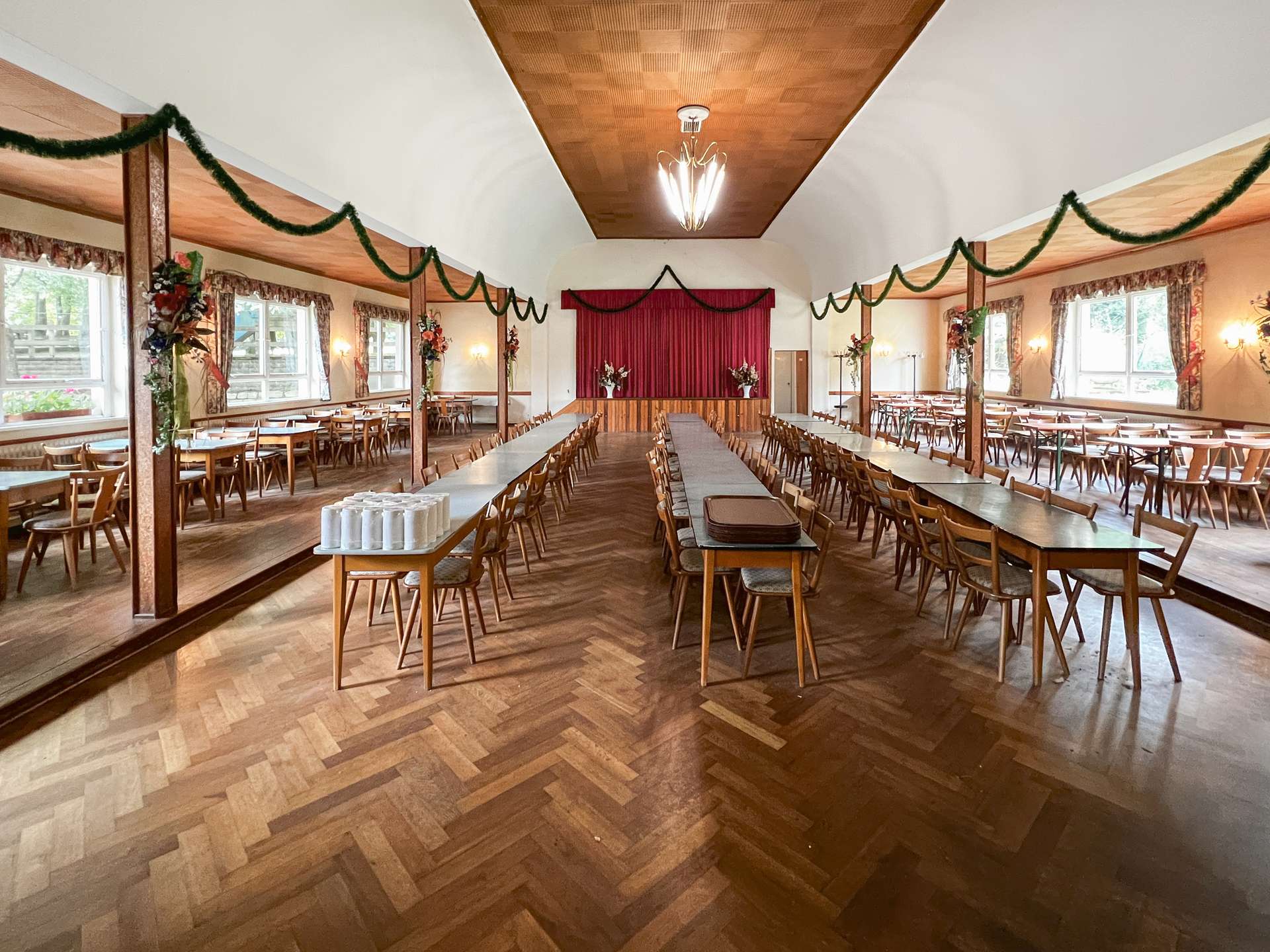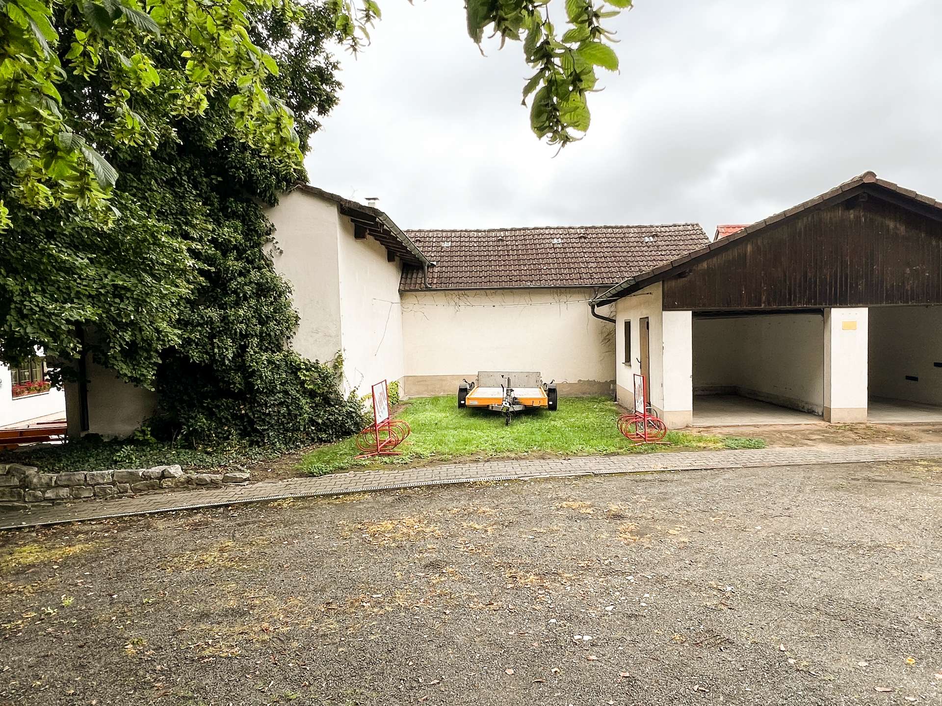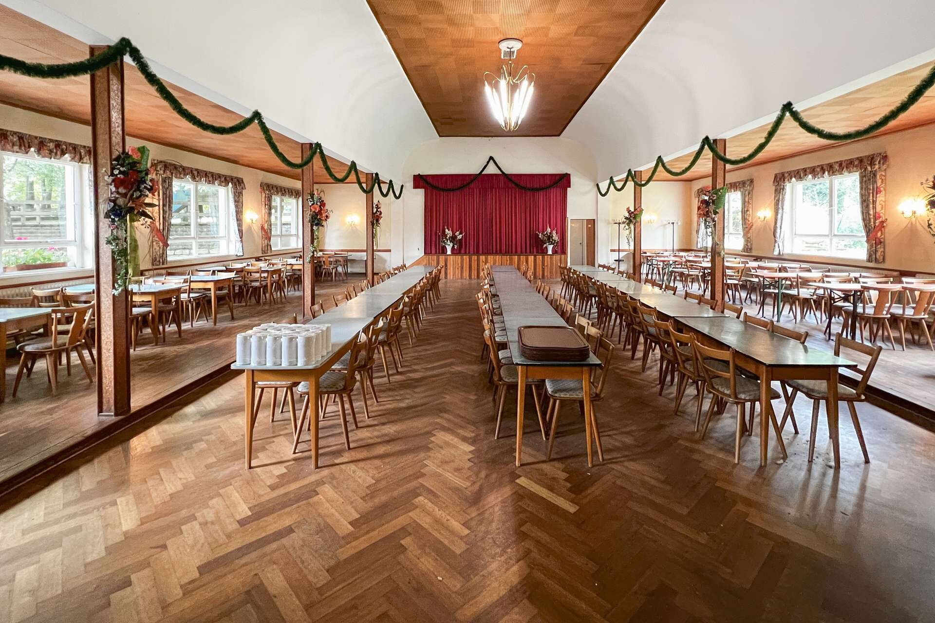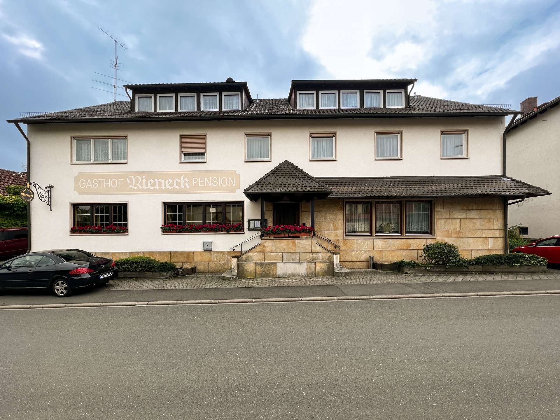 Das Hauptgebäude wurde auf dem 4622 m² großen Grundstück errichtet und fortlaufend erweitert, sowie instandgehalten. Im Erdgeschoss befindet sich die Gastwirtschaft mit großen Gasträumen, Küche und Sanitäranlagen. Der Saal wurde im Jahr 1956 angebaut und bietet ebenfalls eine großzügige Fläche für neuen Wohnraum. Eine Umnutzung zu Wohnungen lässt sich durch die großen Räume leicht realisieren.