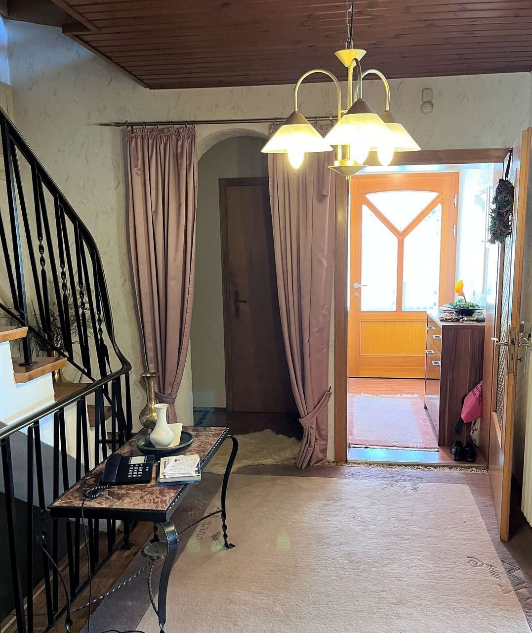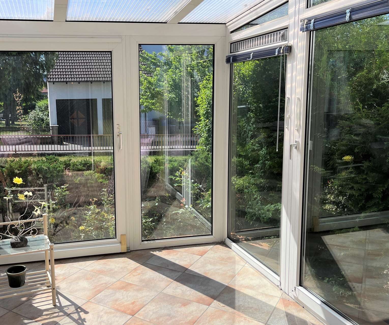 Im Erdgeschoss gewährt der große Flur Zugang zu den vorderen Räumen, von hier aus geht ebenso das Treppenhaus in den Keller und die oberen Etagen ab. Hier befindet sich auch die Feuerraumtür für den zentralen Kachelofen, somit müssen Sie ihr Holz nicht in die Wohnräume bringen. Im Erdgeschoss sind insgesamt vier Zimmer, eine Küche und eine Toilette. Besonderes Highlight auf dieser Etage ist der wunderschöne Wintergarten mit Schiebetüren nach draußen.