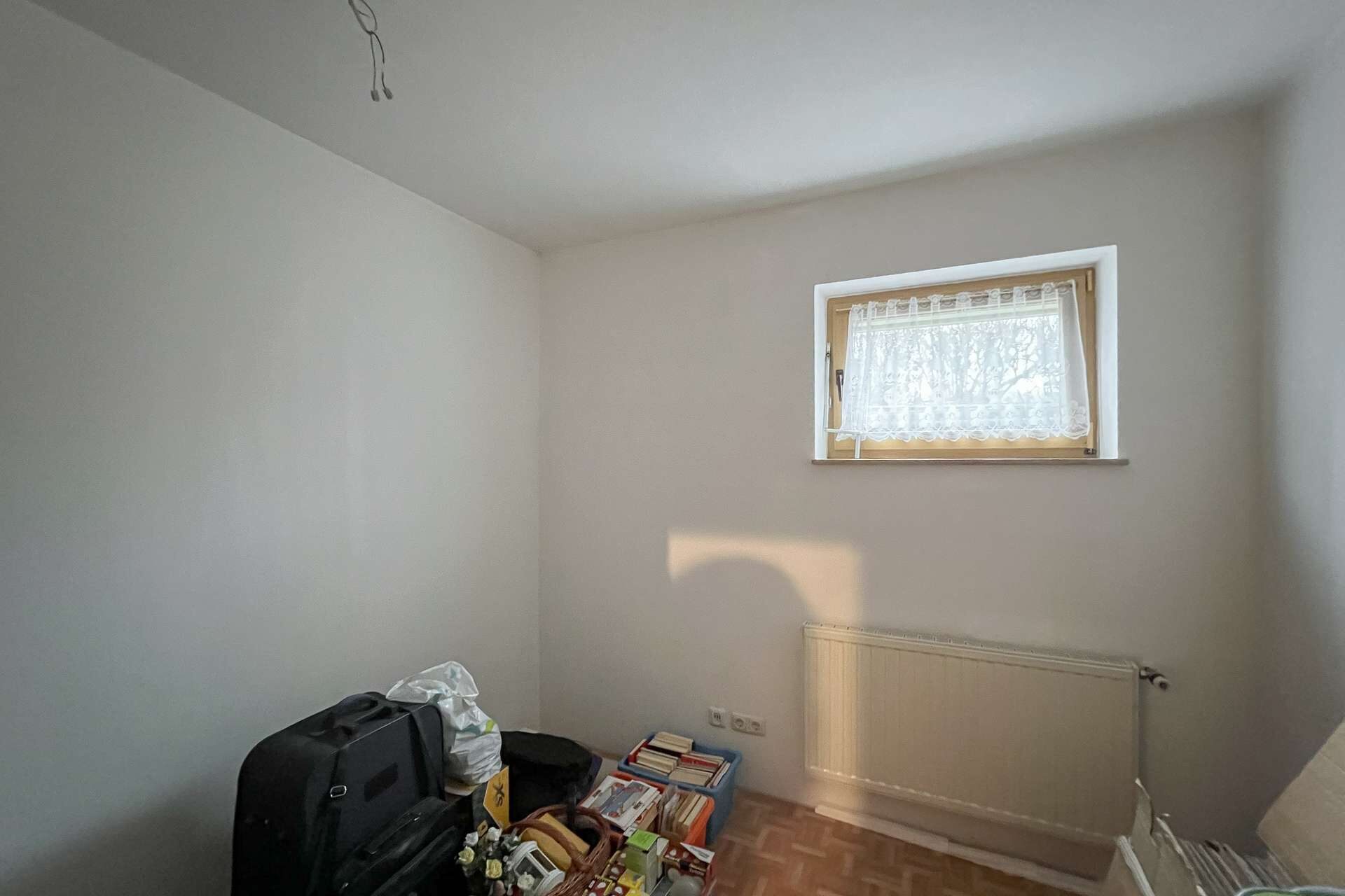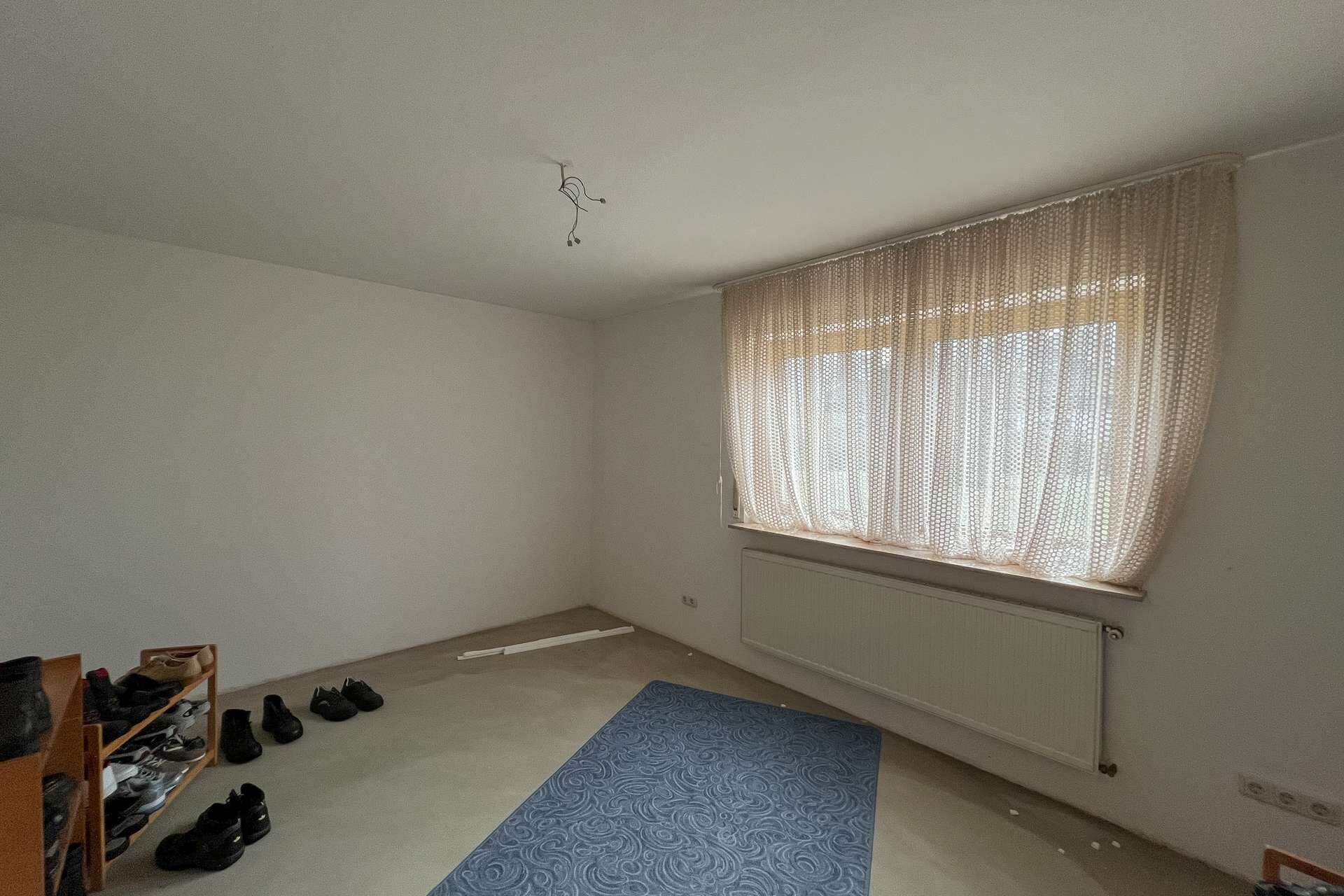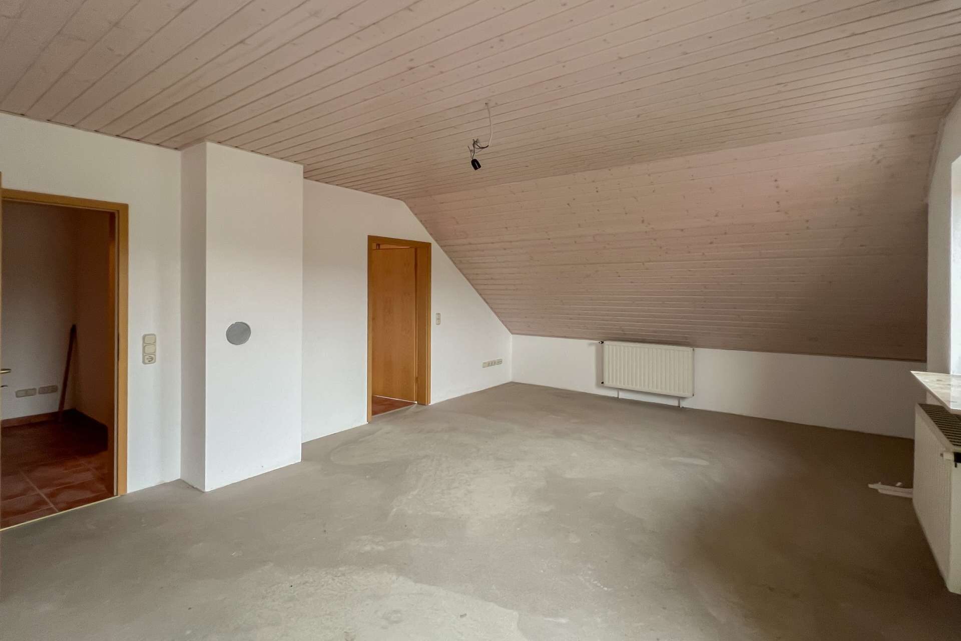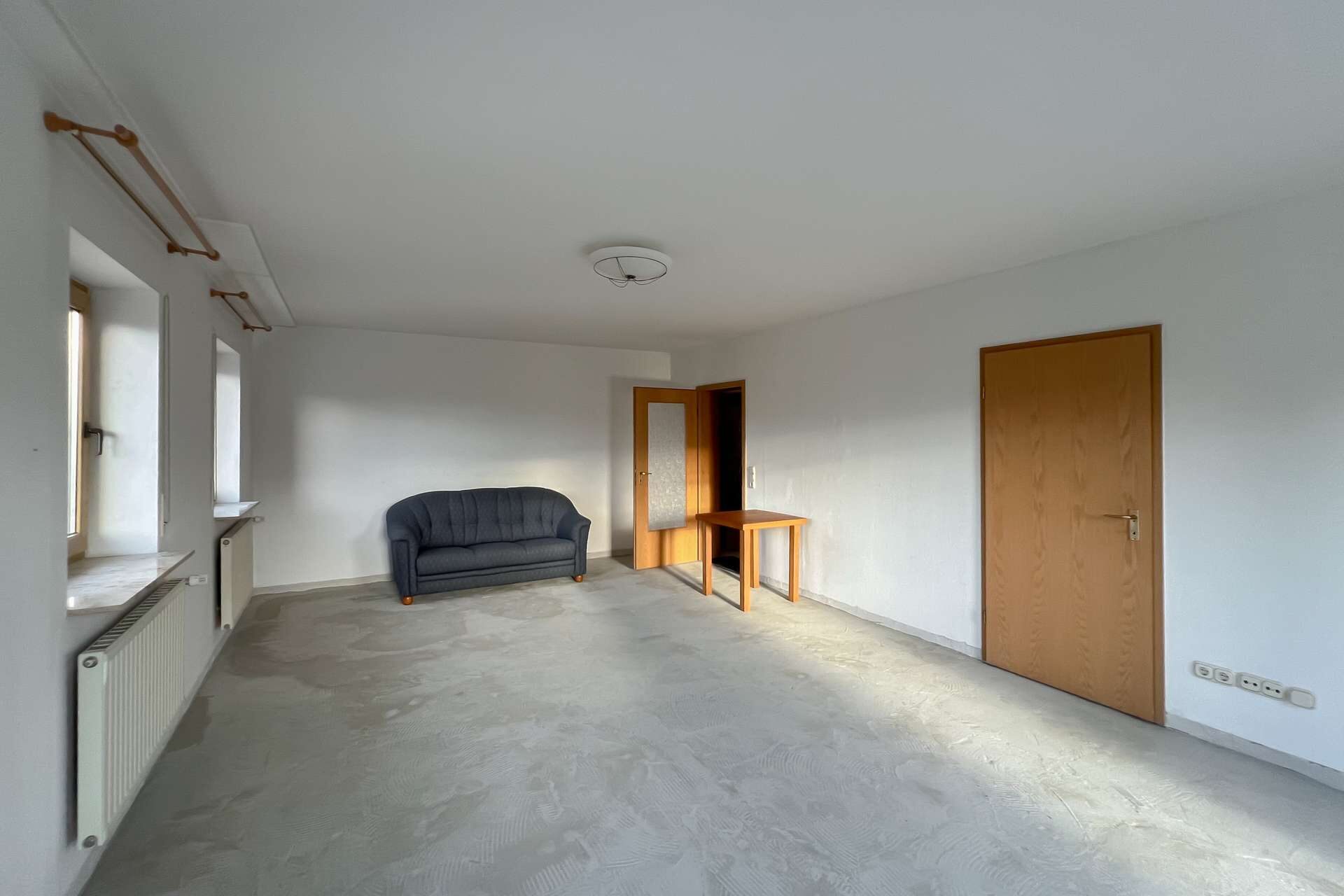 Im Wohnzimmer fehlen noch Bodenbeläge, was neuen Eigentümern freie Gestaltungsmöglichkeiten eröffnet. Ein Tageslichtbad sowie ein separates WC runden das Angebot dieser Ebene ab.