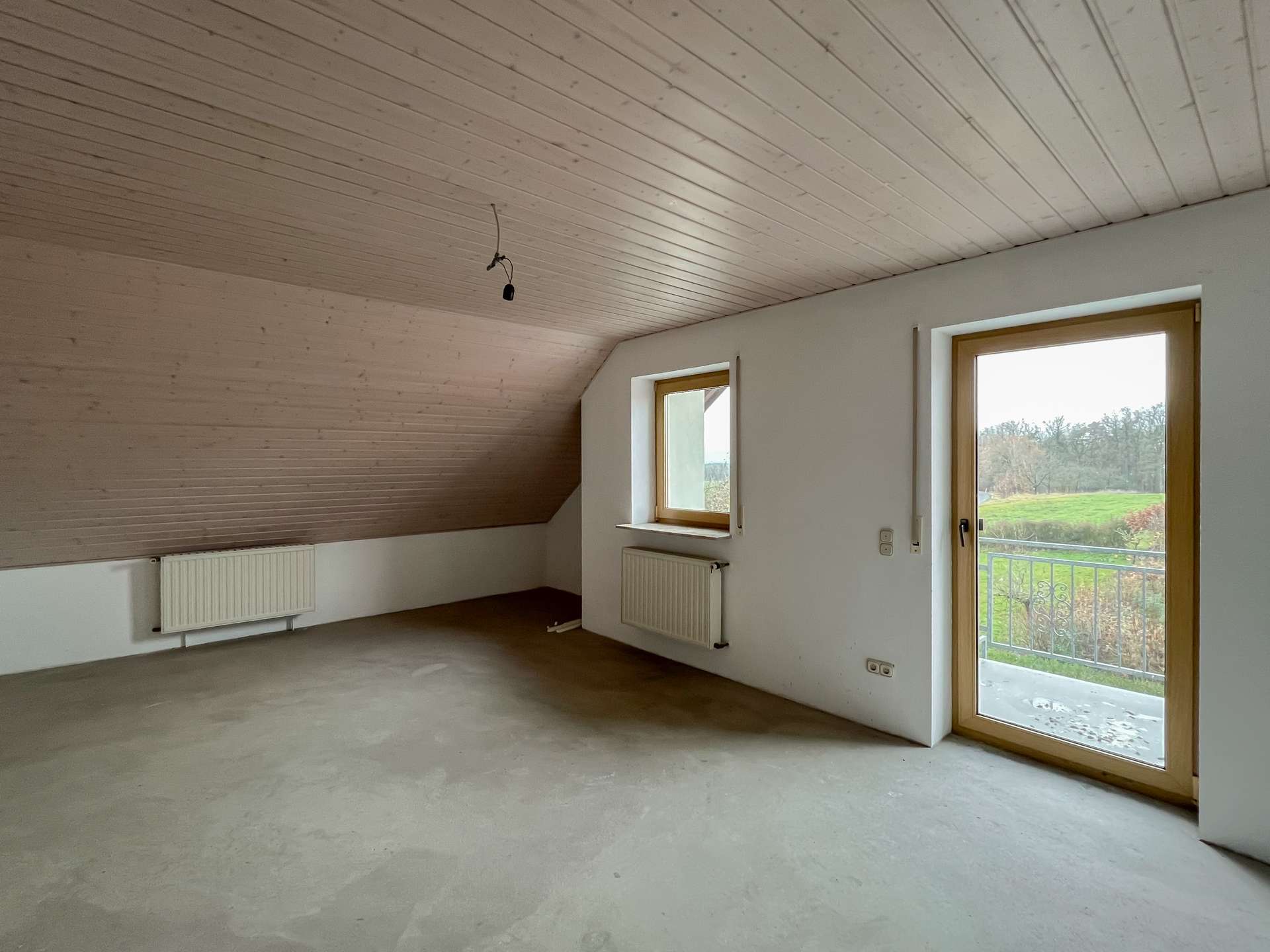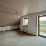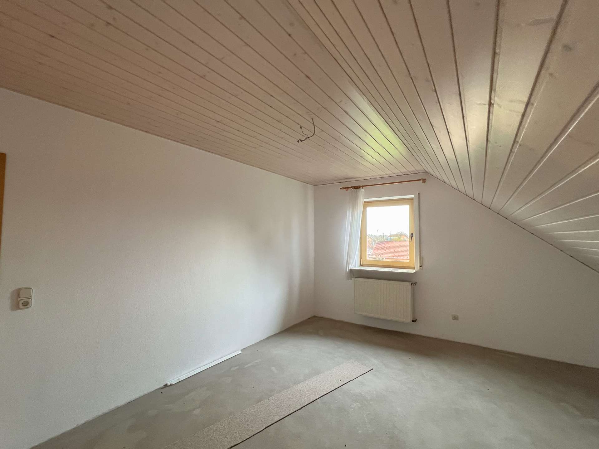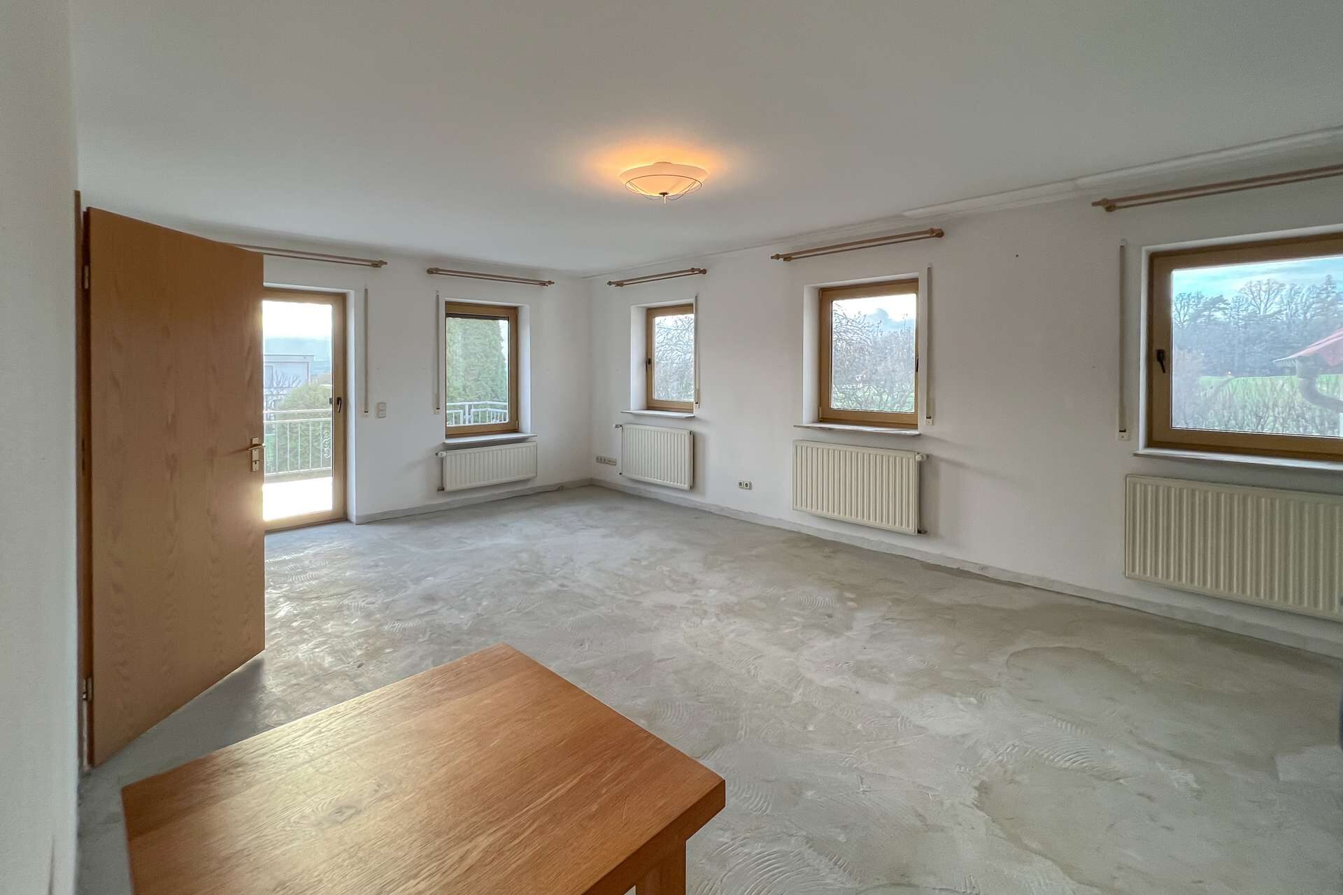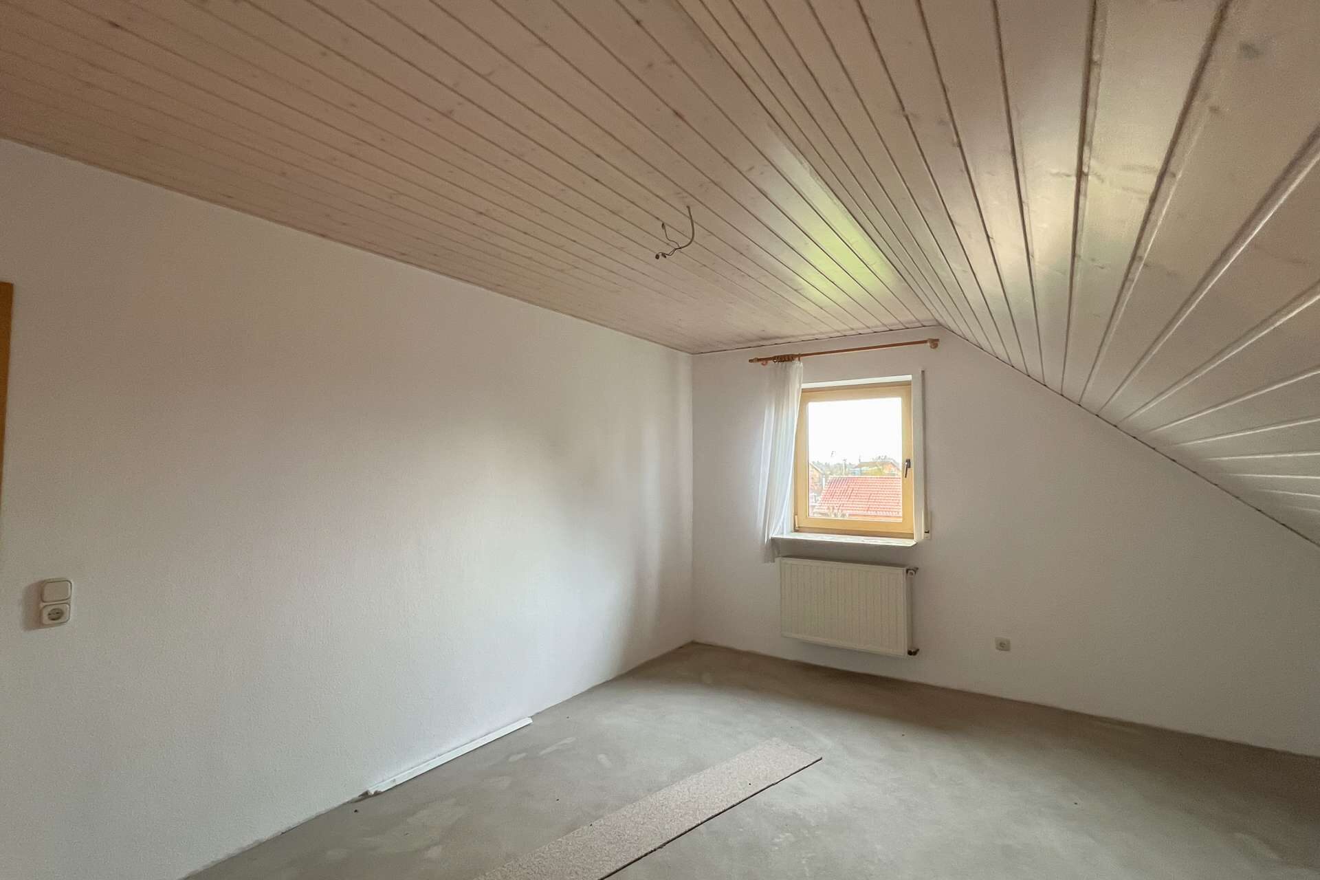 Im Wohnzimmer fehlen noch Bodenbeläge, was neuen Eigentümern freie Gestaltungsmöglichkeiten eröffnet. Ein Tageslichtbad sowie ein separates WC runden das Angebot dieser Ebene ab.