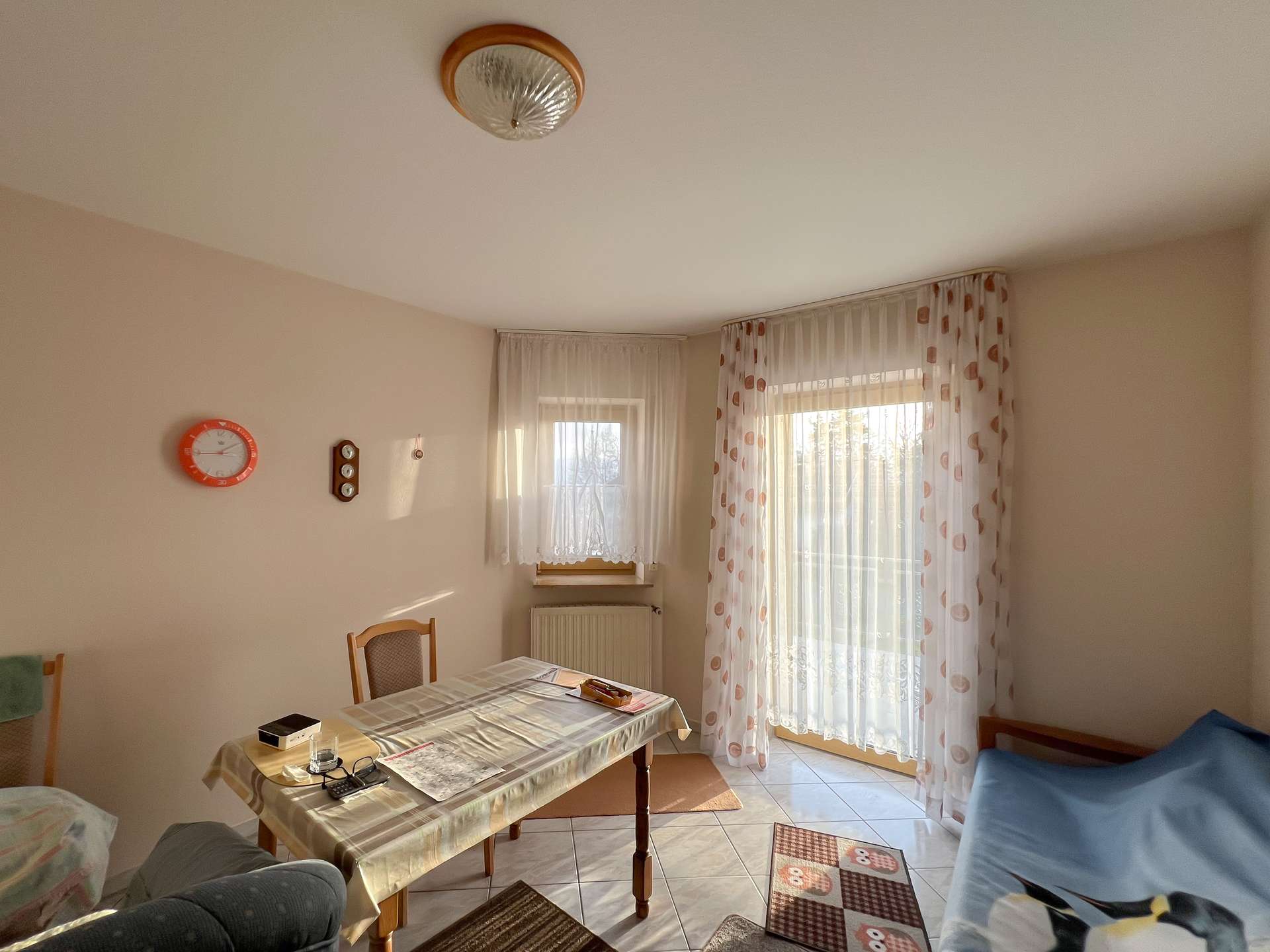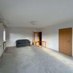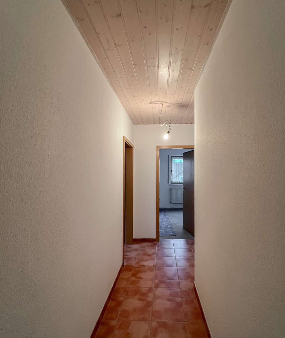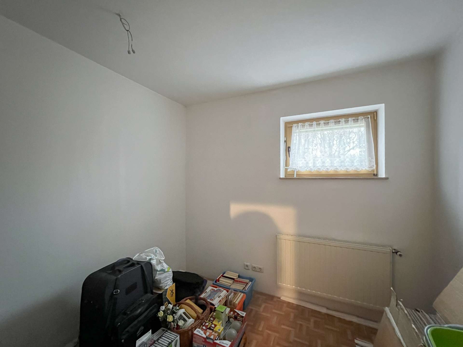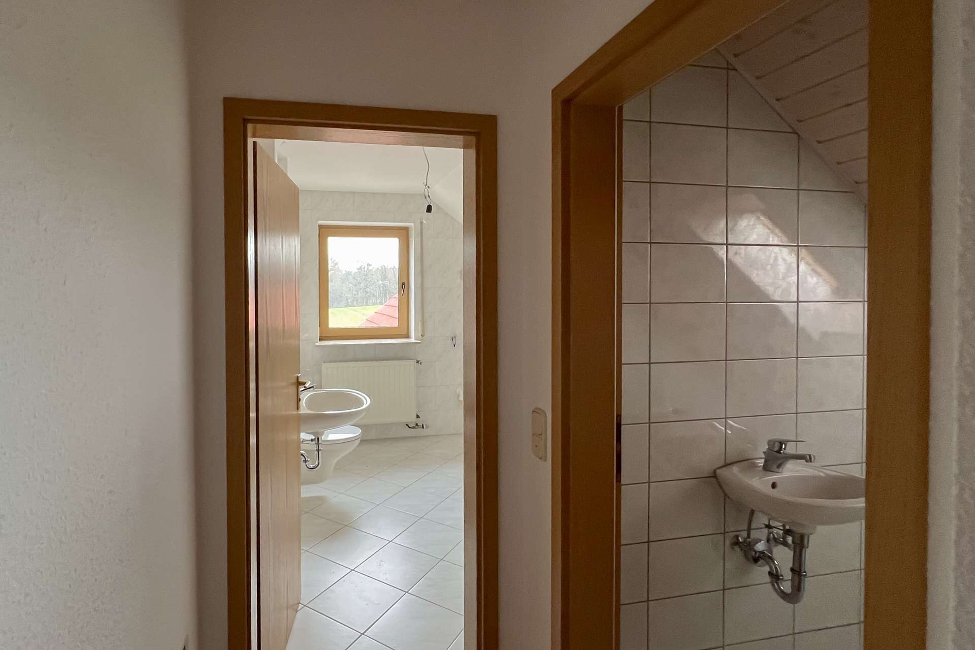Im Wohnzimmer fehlen noch Bodenbeläge, was neuen Eigentümern freie Gestaltungsmöglichkeiten eröffnet. Ein Tageslichtbad sowie ein separates WC runden das Angebot dieser Ebene ab.