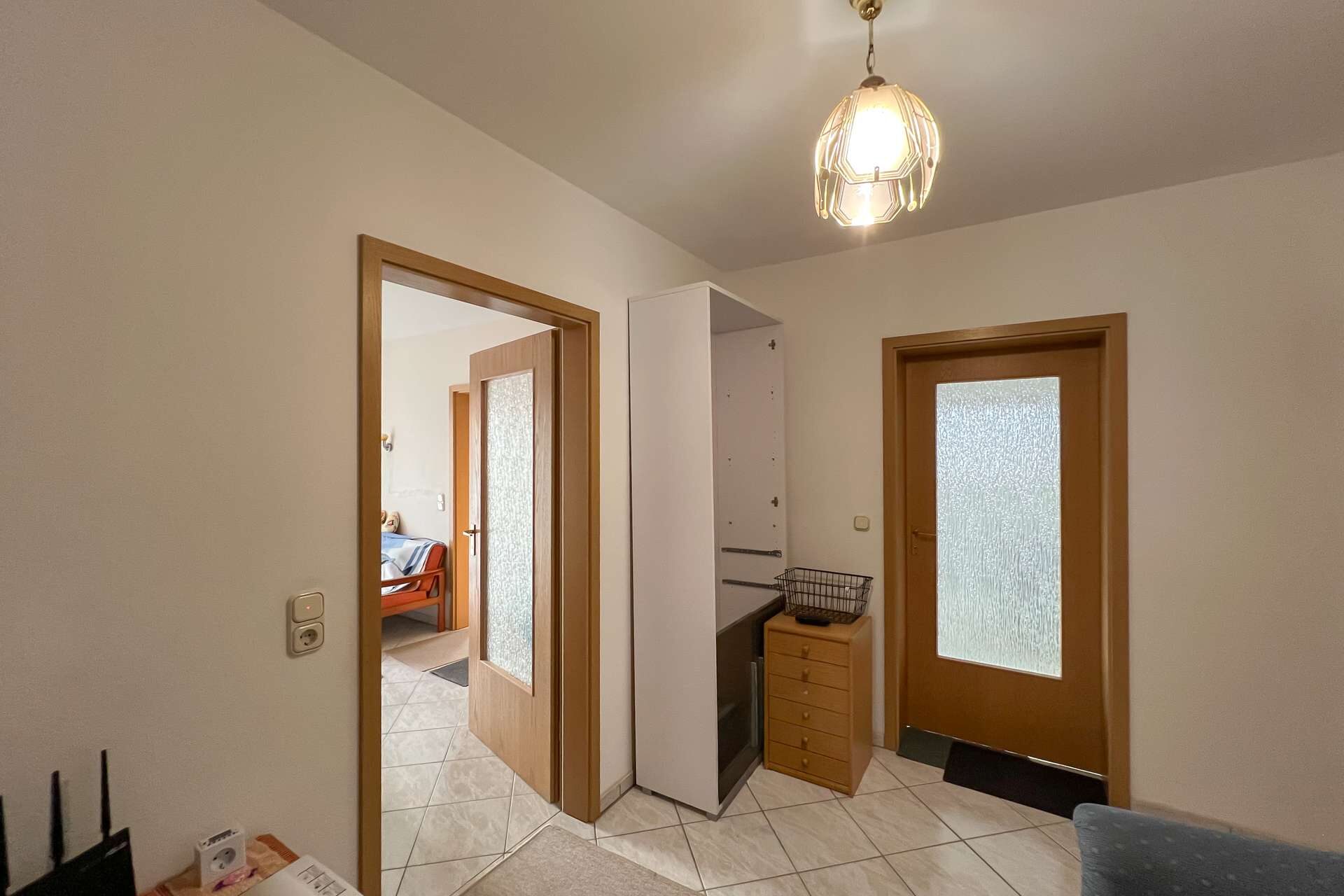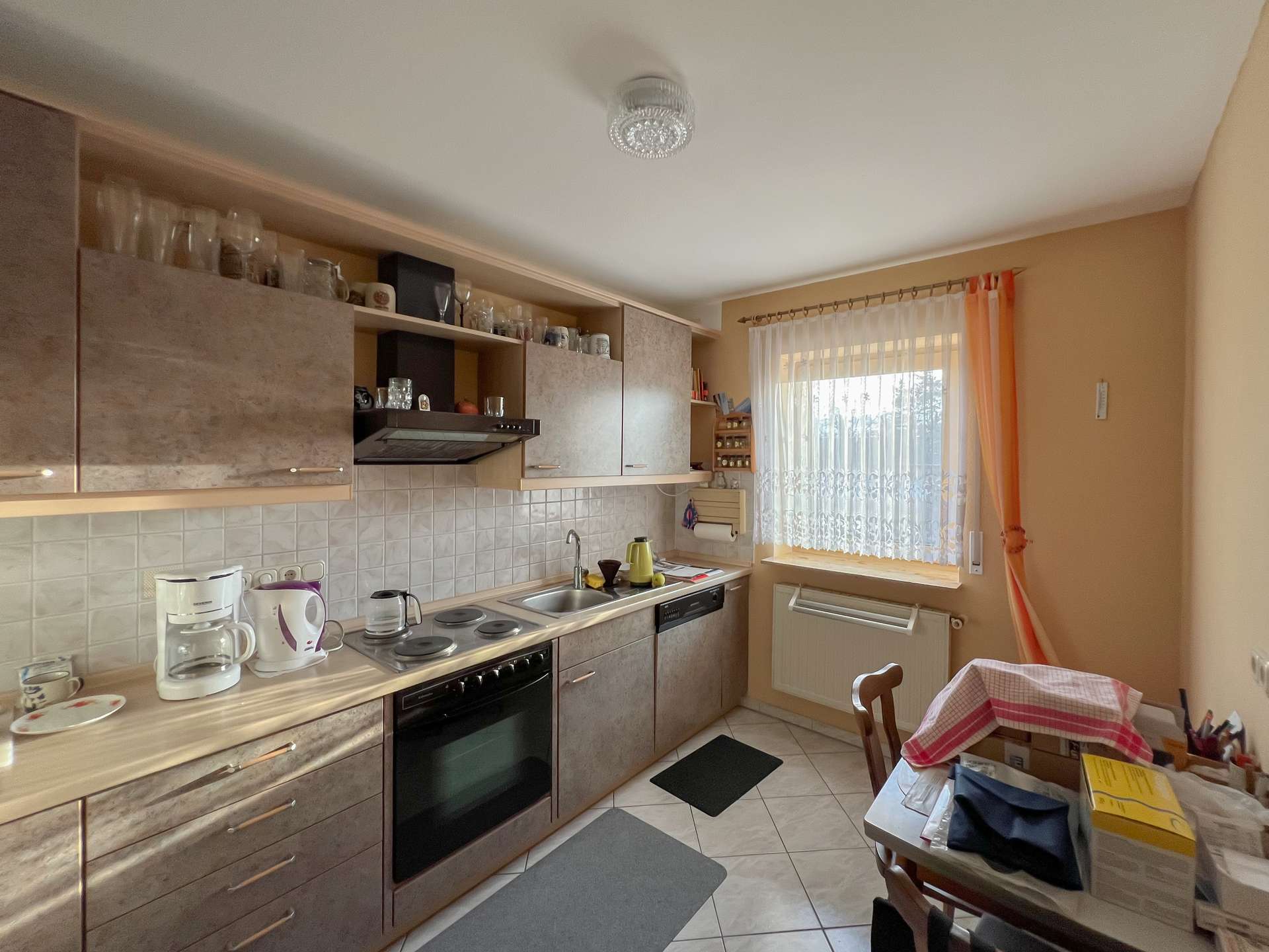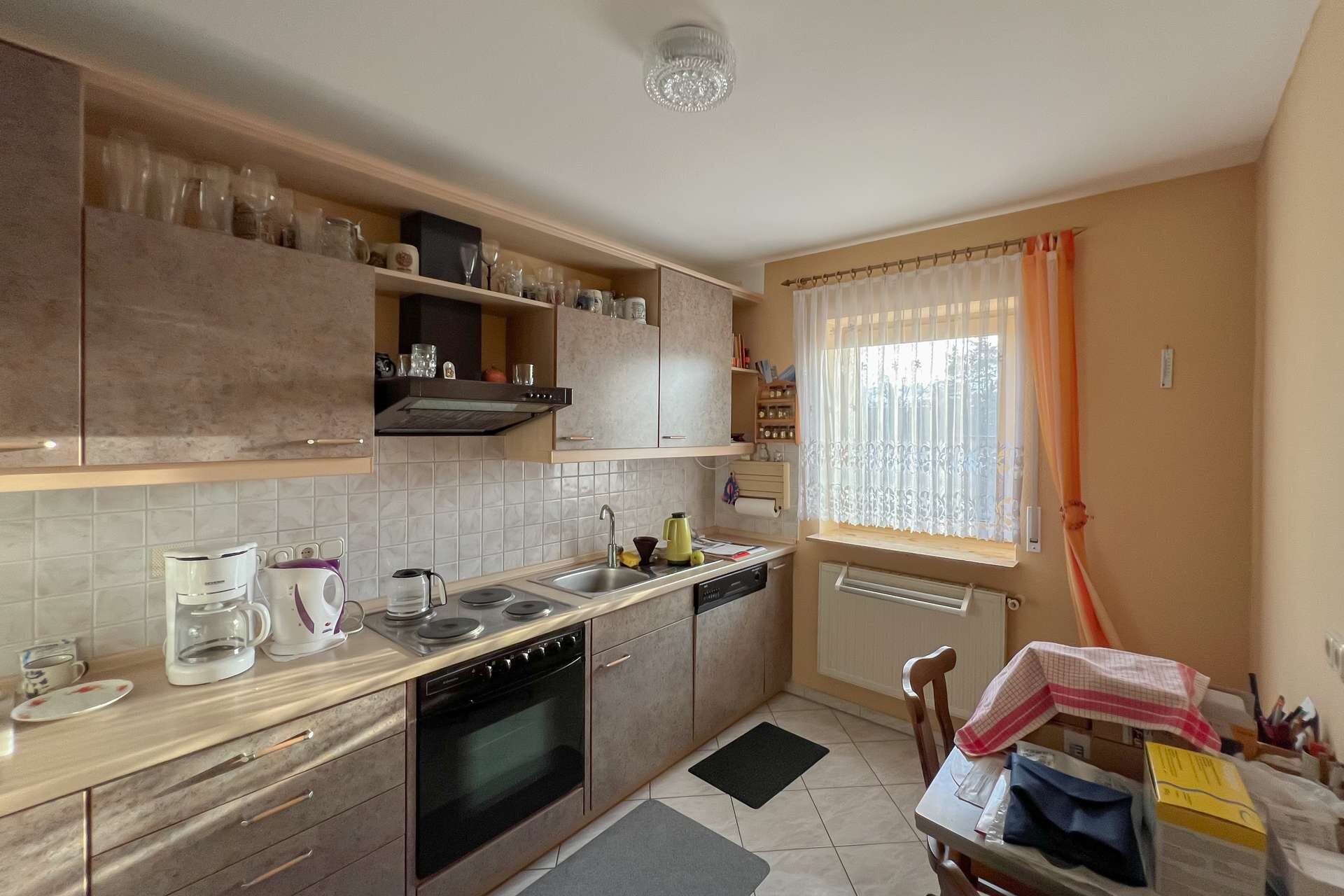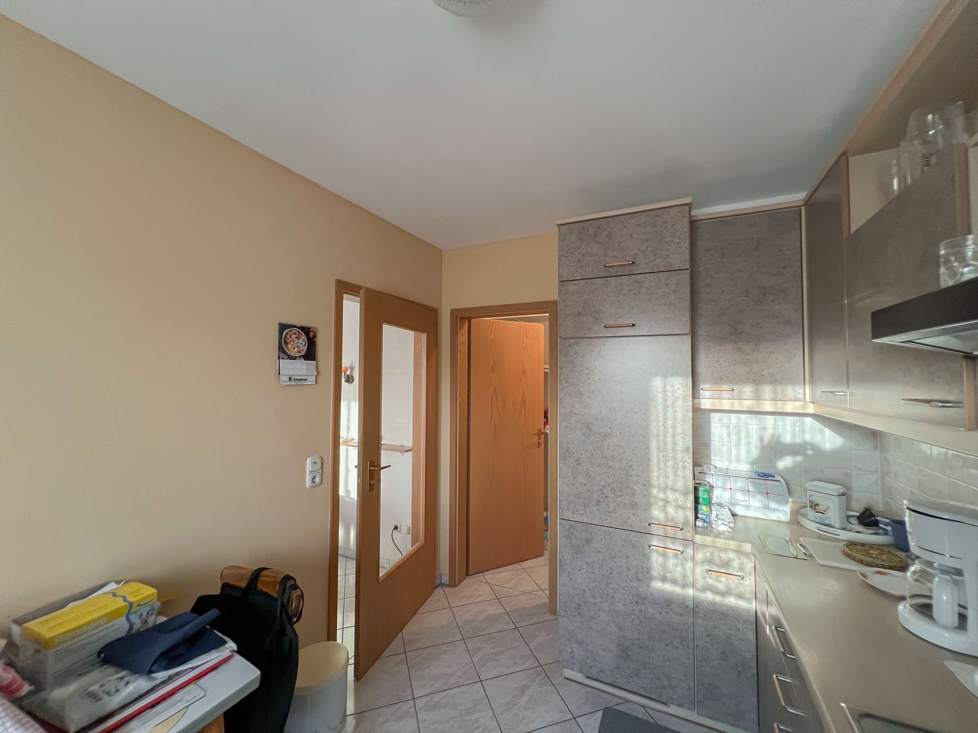Die Küche verfügt zudem über eine direkt angrenzende kleine Speisekammer, die zusätzlichen Stauraum und praktische Ablageflächen ermöglicht.