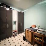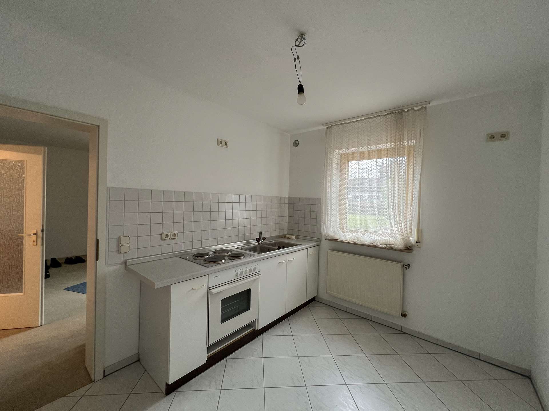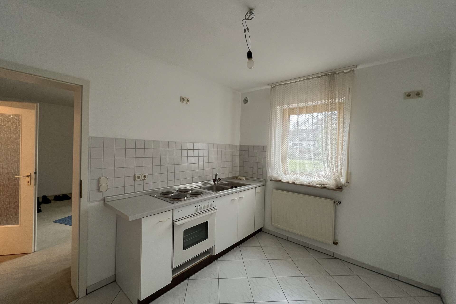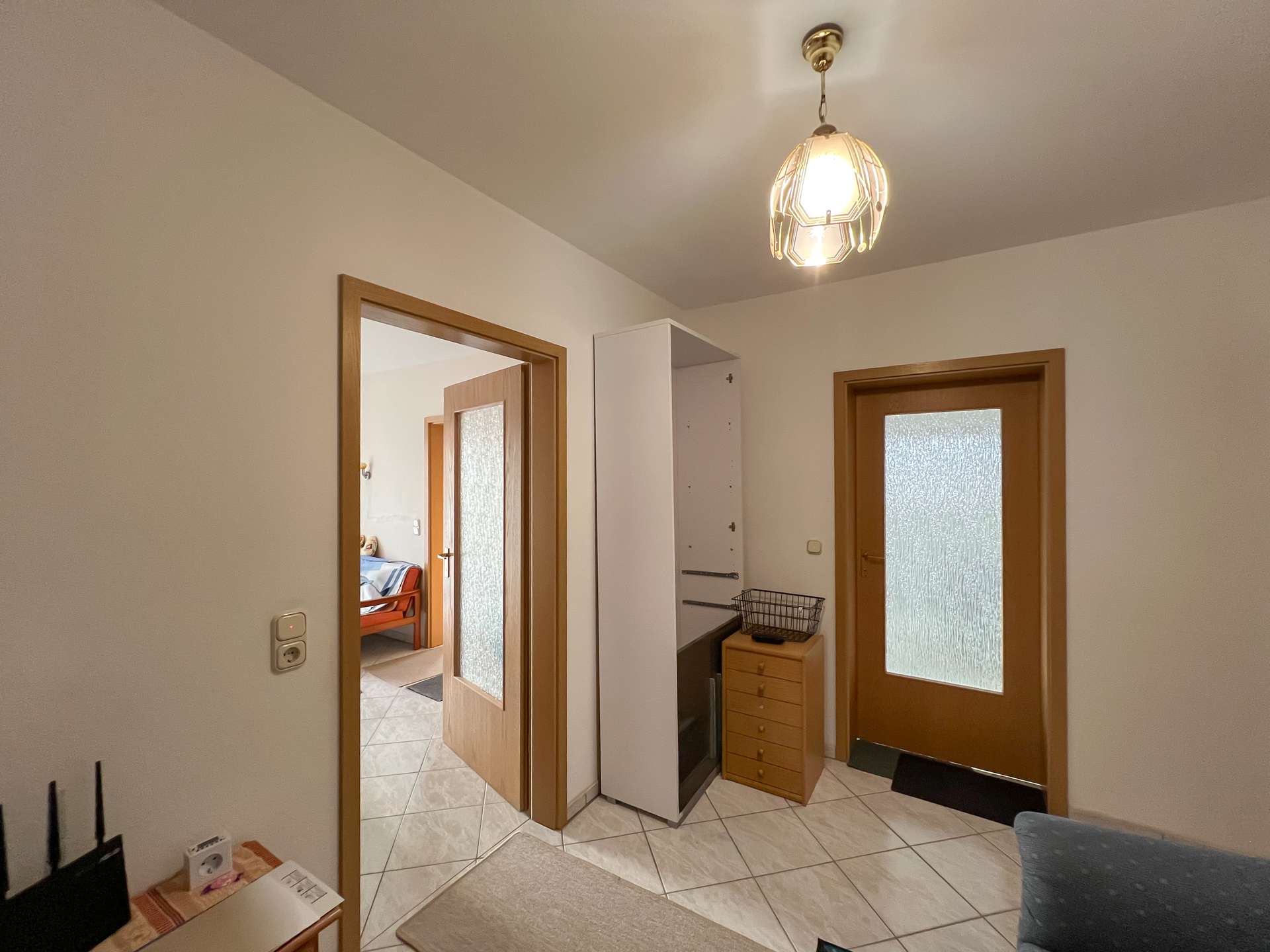 Die Küche verfügt zudem über eine direkt angrenzende kleine Speisekammer, die zusätzlichen Stauraum und praktische Ablageflächen ermöglicht.