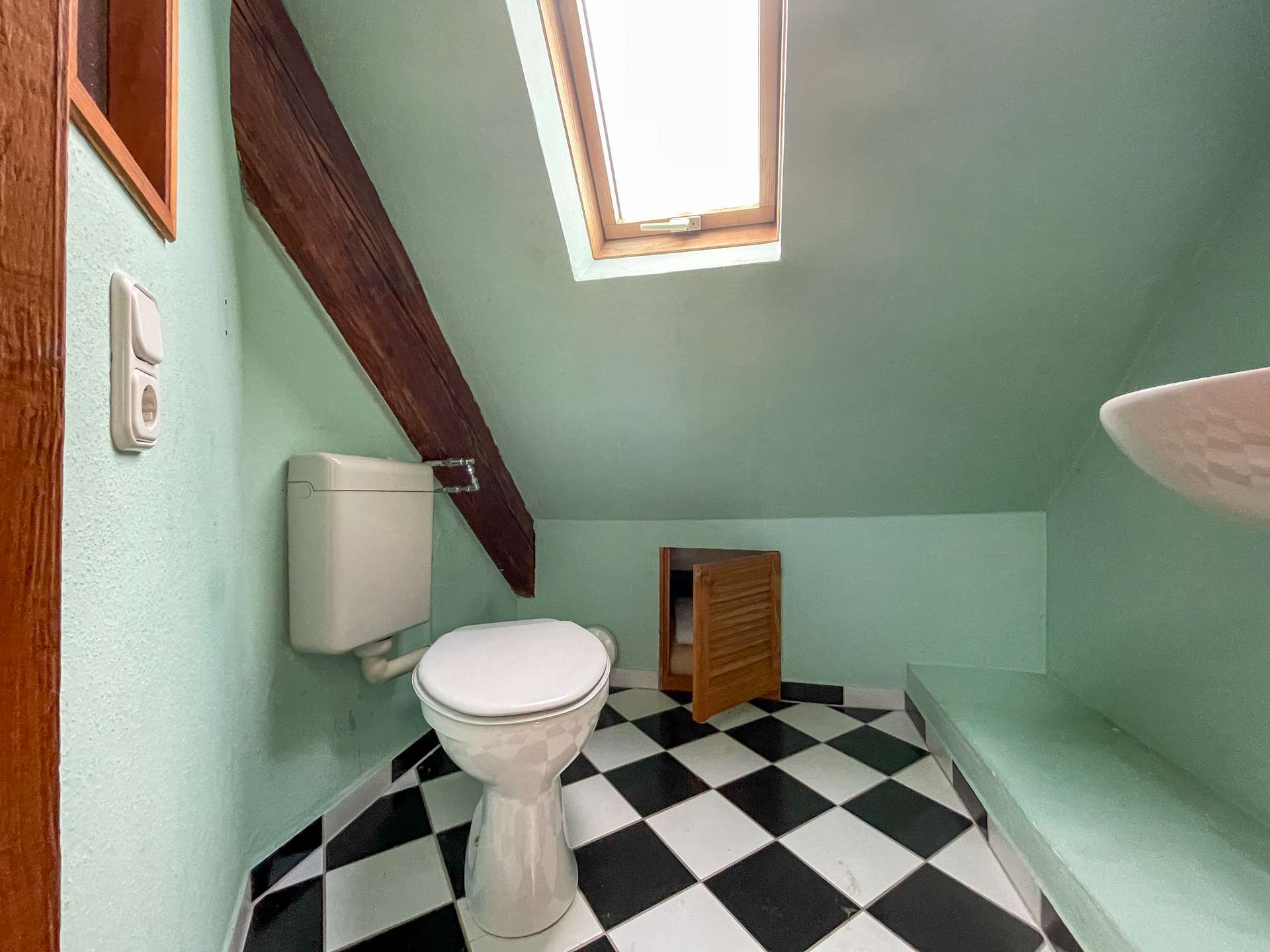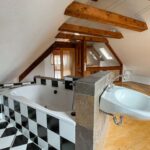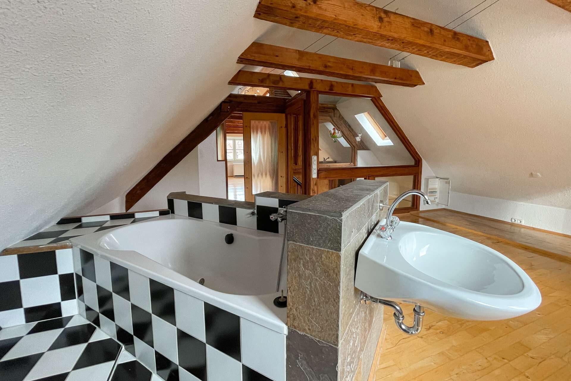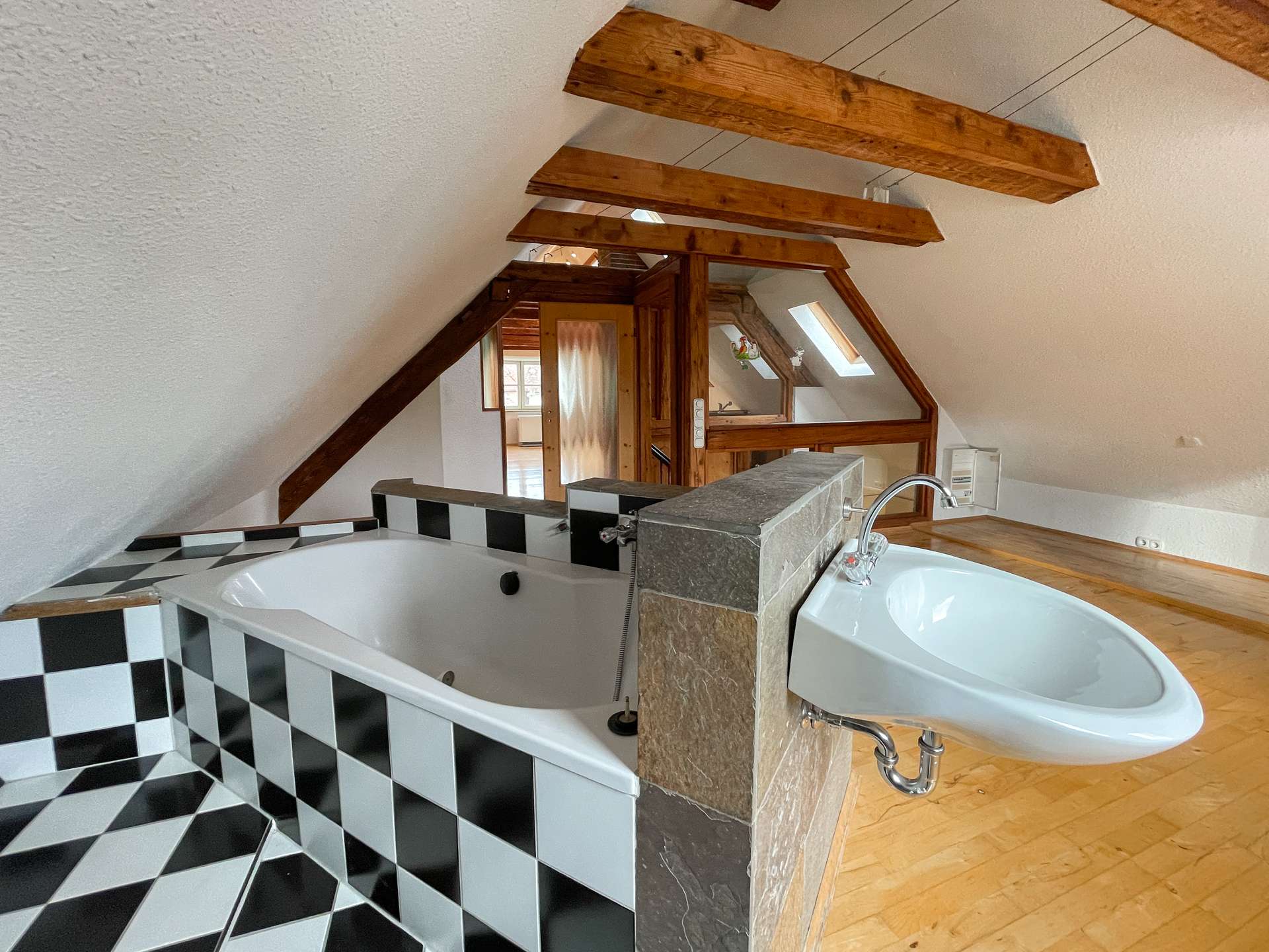 Ein besonderes Highlight ist das bereits 1994 fachmännisch ausgebaute und sanierte Dachgeschoss. Hier sorgen große Dachflächenfenster für eine lichtdurchflutete und einladende Wohnatmosphäre. Das großzügige Schlafzimmer im Dachgeschoss birgt eine außergewöhnliche Besonderheit: eine direkt integrierte Badewanne, die zu entspannten Stunden einlädt und dem Raum einen Hauch von Luxus und Individualität verleiht.
