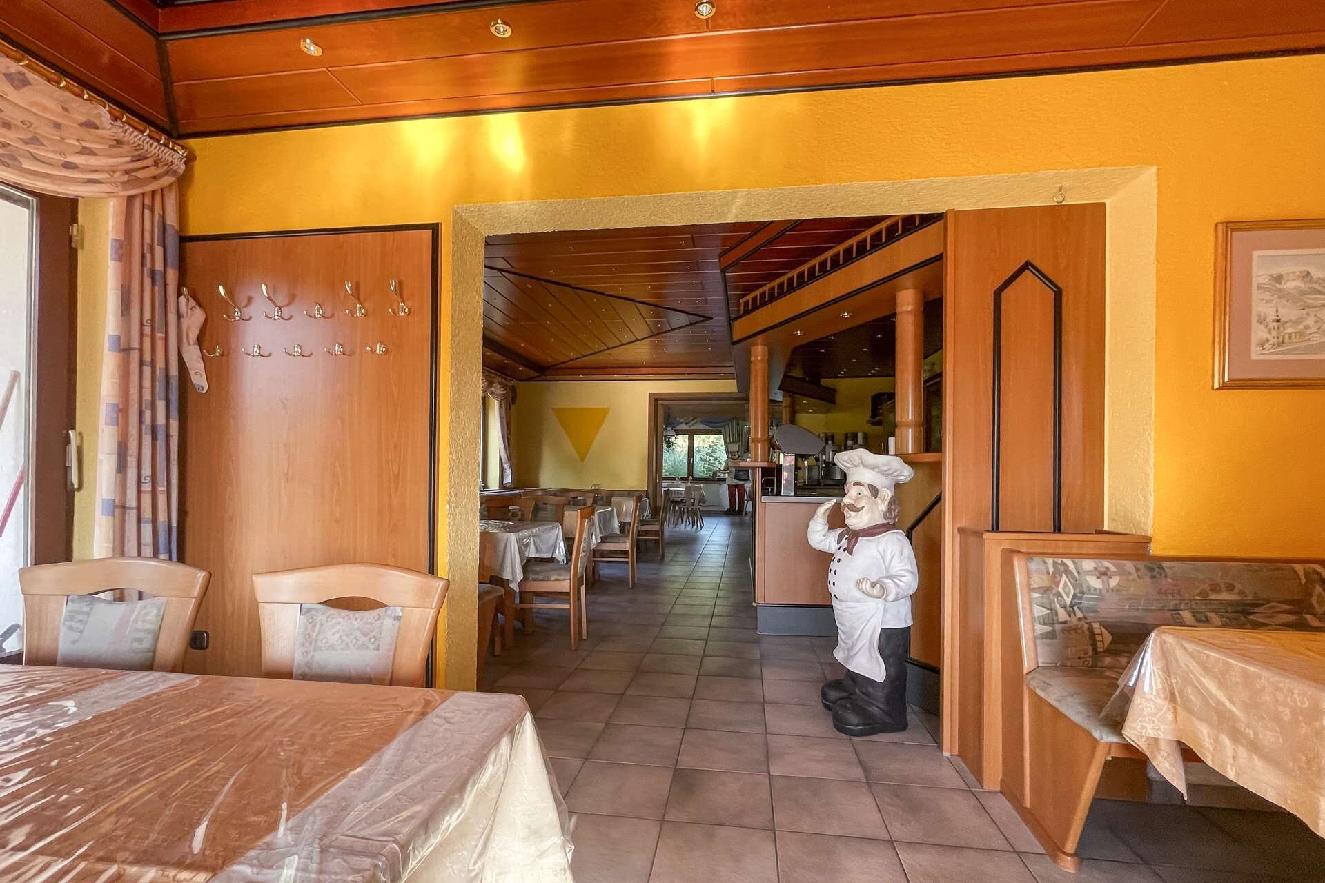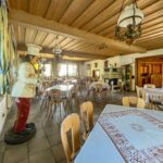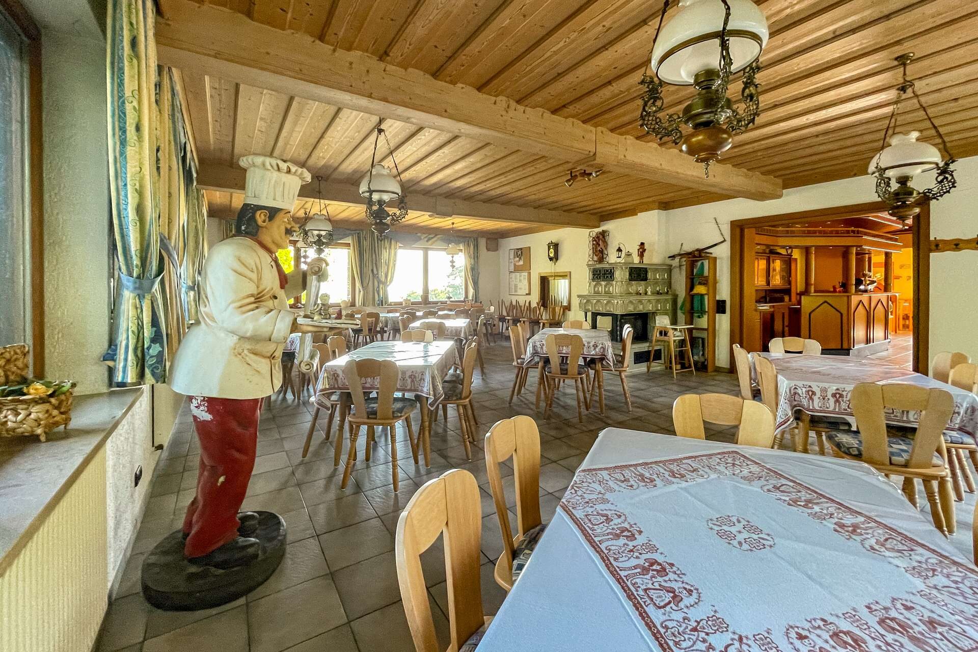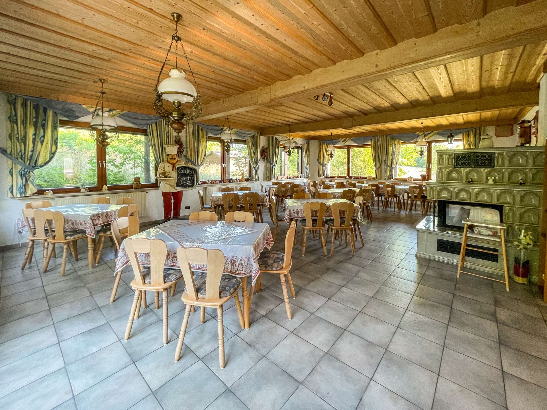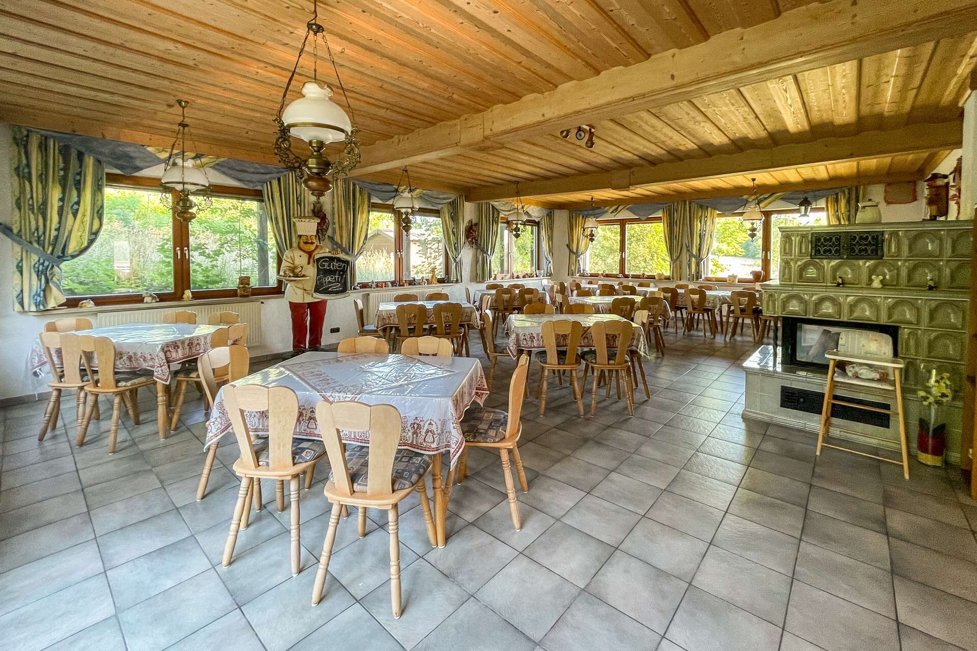 Besonderes Highlight ist der einladende Gastraum mit stilvollem Kaminkachelofen. Hier entsteht sofort eine warme, gemütliche Atmosphäre, die Gäste zum Verweilen einlädt. Der angrenzende Saal eignet sich hervorragend für Feiern, Veranstaltungen oder Tagungen. Die funktionale Einbauküche ist betriebsbereit und bietet ideale Voraussetzungen für den gastronomischen Alltag.