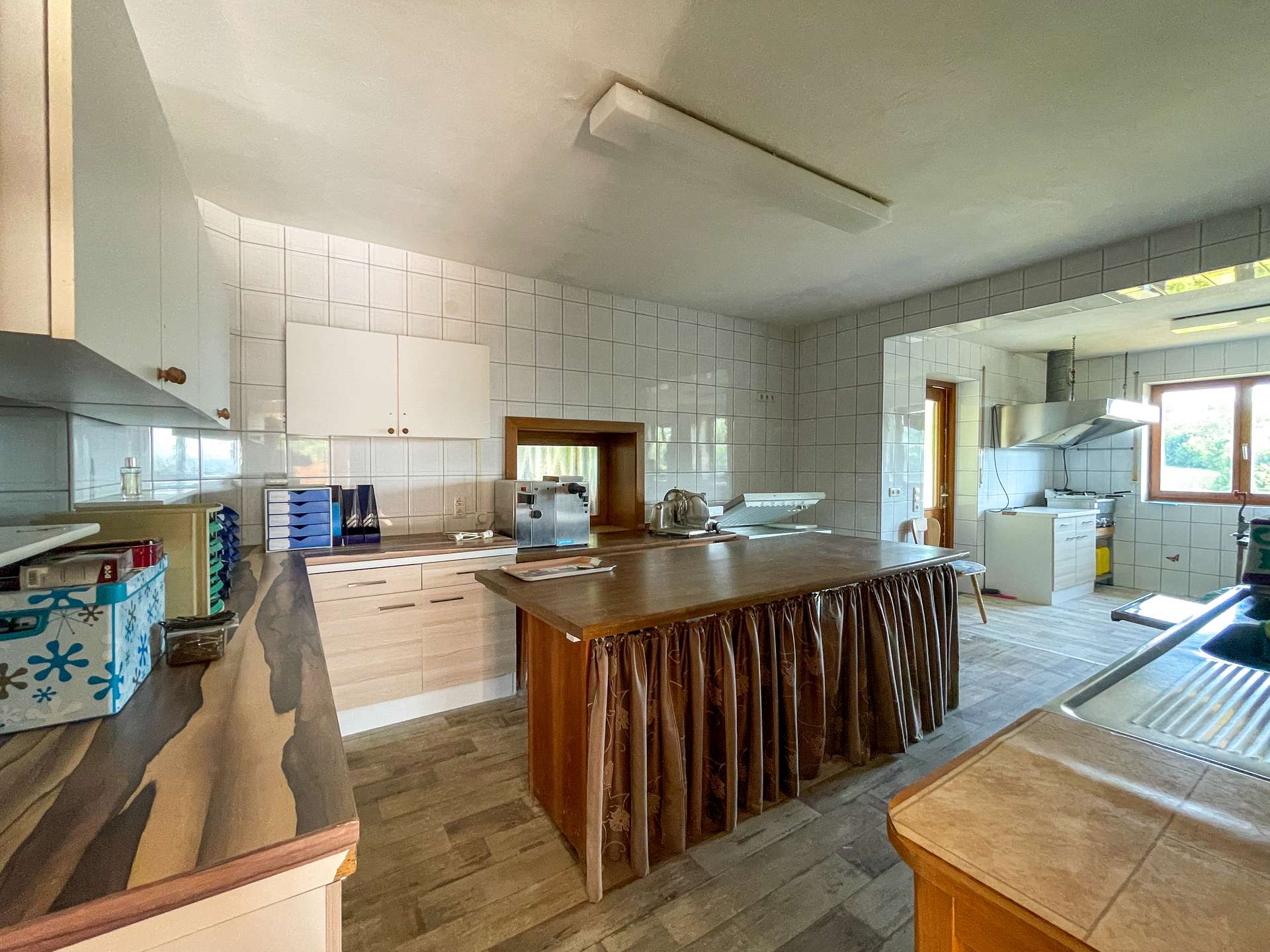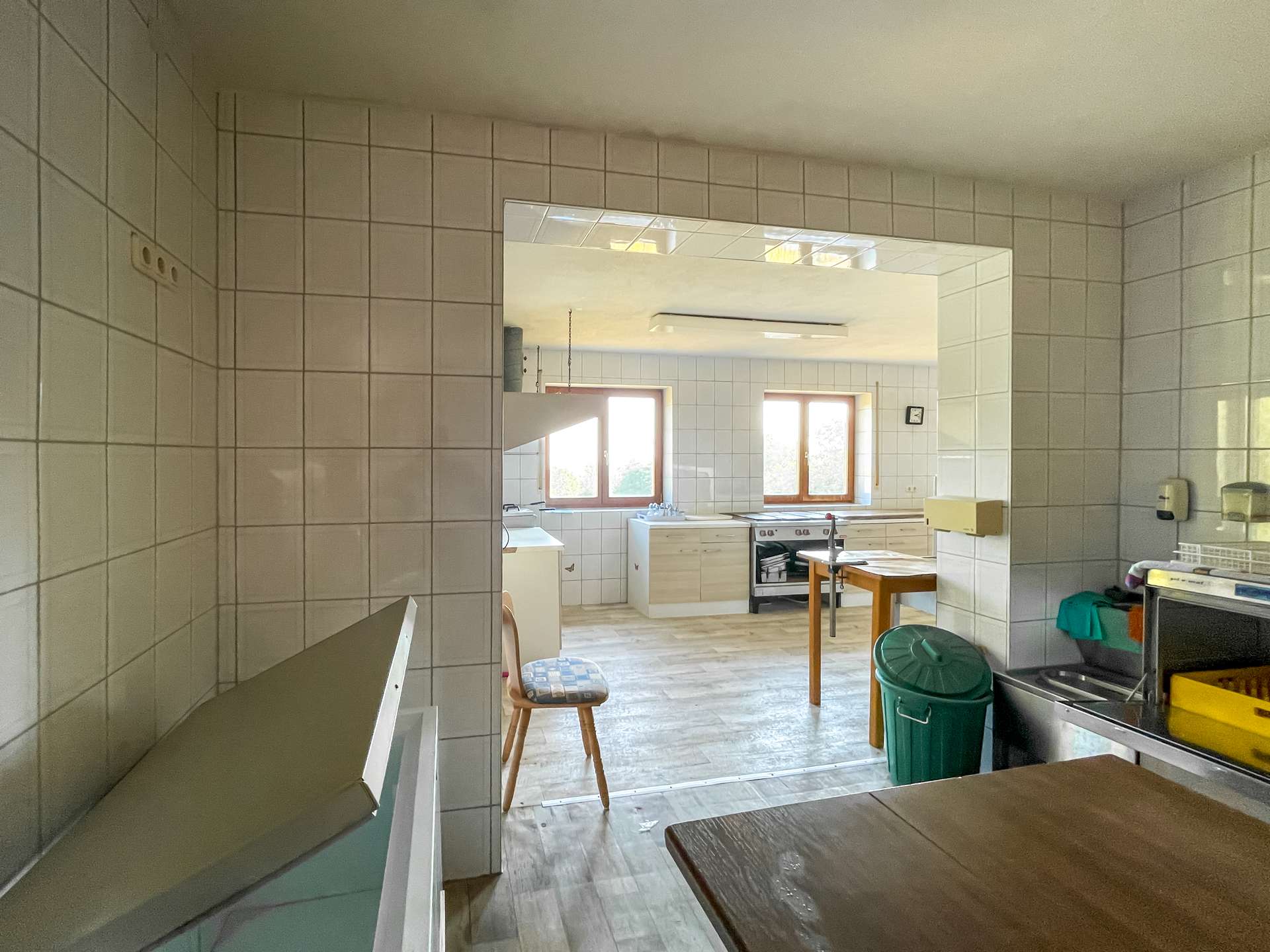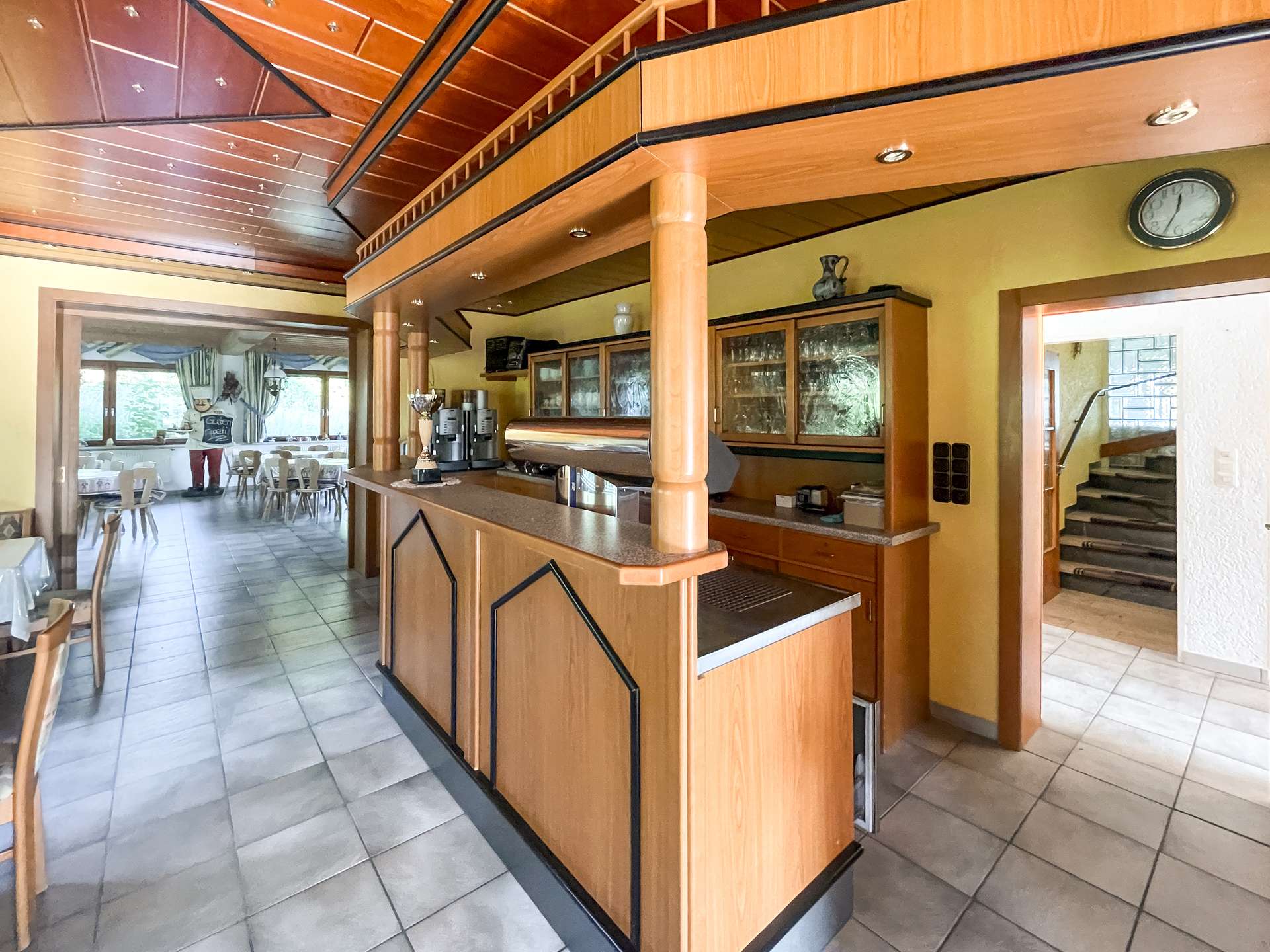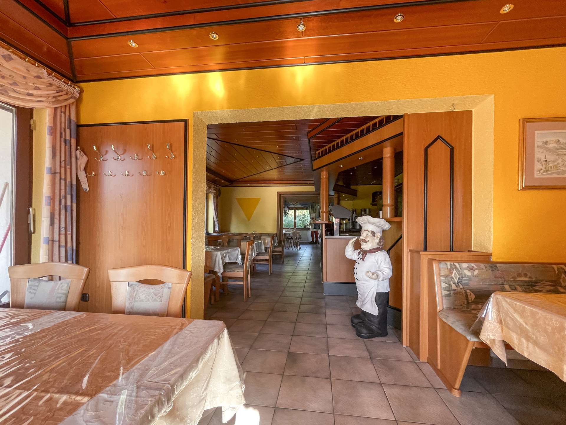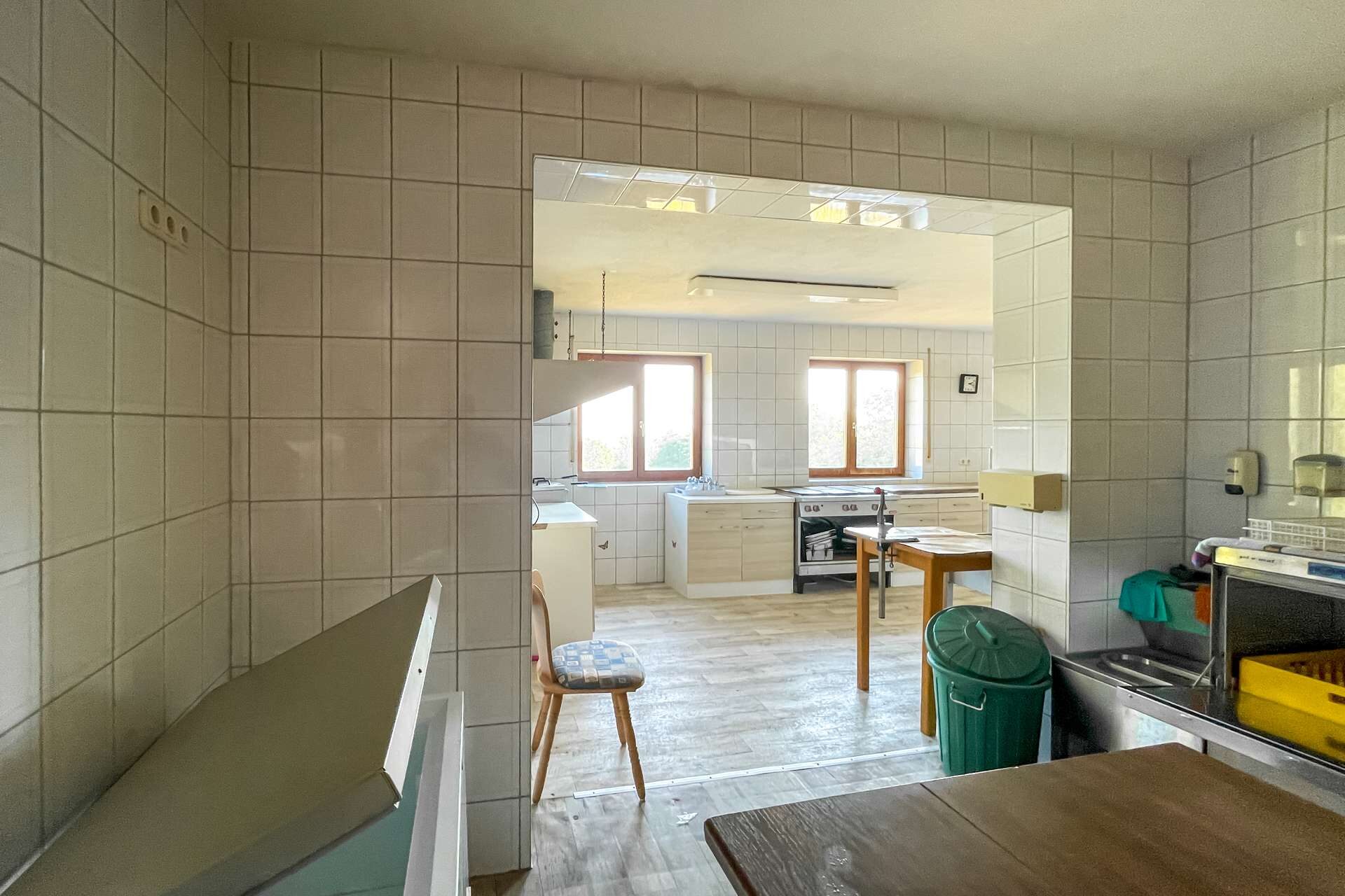 Besonderes Highlight ist der einladende Gastraum mit stilvollem Kaminkachelofen. Hier entsteht sofort eine warme, gemütliche Atmosphäre, die Gäste zum Verweilen einlädt. Der angrenzende Saal eignet sich hervorragend für Feiern, Veranstaltungen oder Tagungen. Die funktionale Einbauküche ist betriebsbereit und bietet ideale Voraussetzungen für den gastronomischen Alltag.