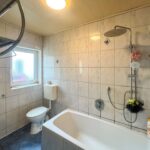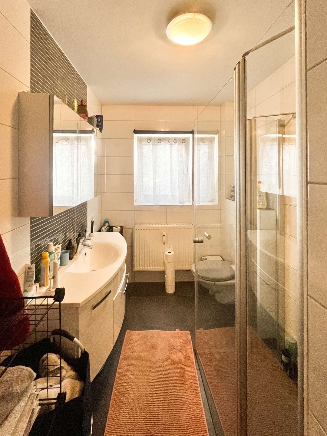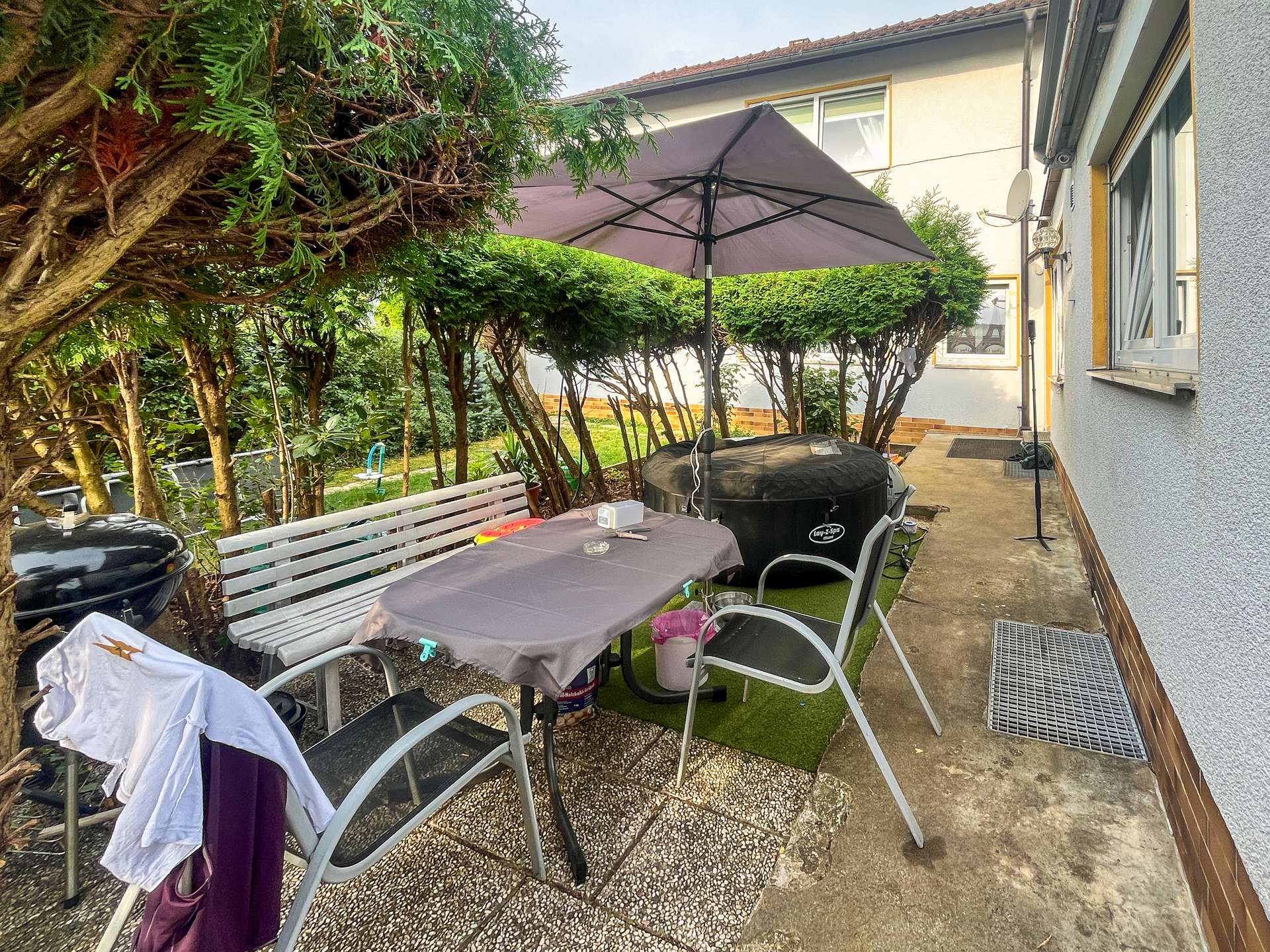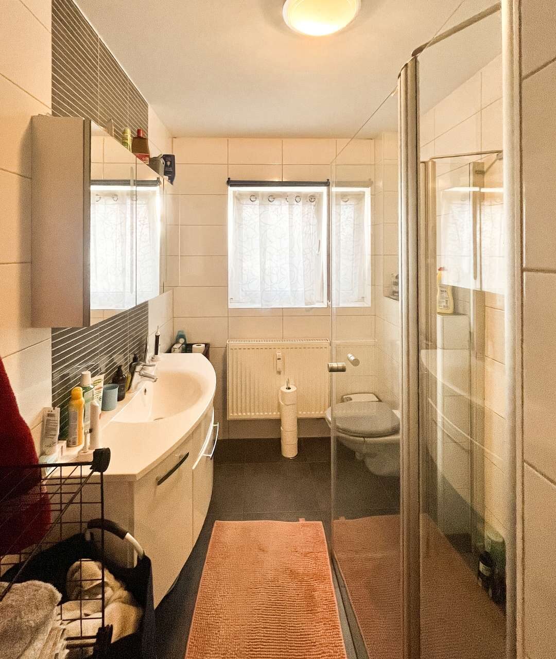 Die dritte Wohneinheit befindet sich im Erdgeschoss und bietet eine Wohnfläche von 81 m². Sie teilt sich in drei Zimmer, eine Küche und ein modernes Duschbad auf. Vom Wohnzimmer aus gelangen die Mieter direkt in ihren eigenen Gartenanteil, der ideal für entspannte Stunden im Freien ist.