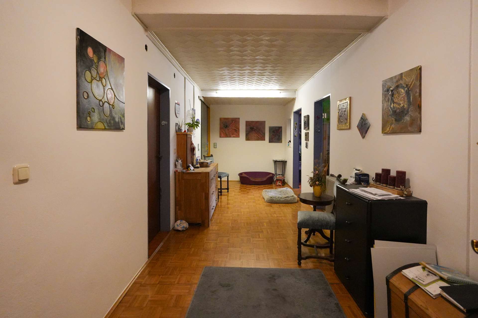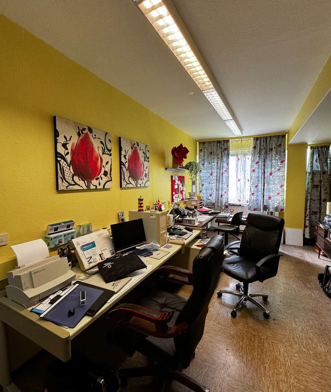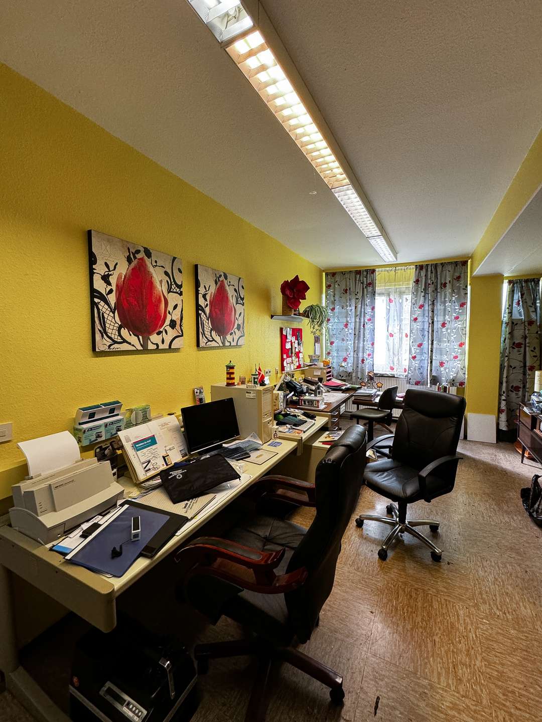 Im Erd- und Obergeschoss stehen zusätzlich ca. 880 m² Gewerbefläche zur Verfügung, die derzeit als Lager, Werkstatt und Büro genutzt werden. Die Zufahrt über ein elektrisches Hoftor, mehrere separate Eingänge sowie ausreichend Stellplätze bieten eine flexible Nutzung oder zusätzliche Einnahmemöglichkeiten.