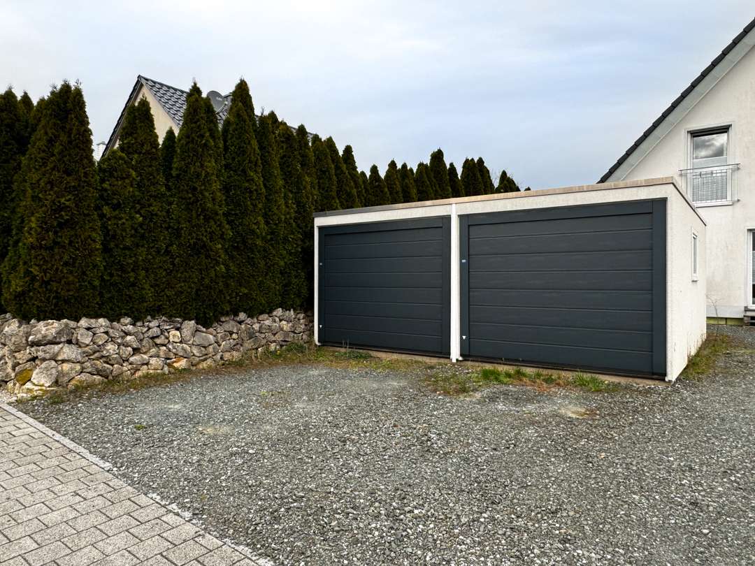 Vor dem Haus befindet sich die Doppelgarage mit Sektionaltoren. Der großzügige Garten bietet ausreichend Fläche, um nach Ihren Wünschen angelegt zu werden.