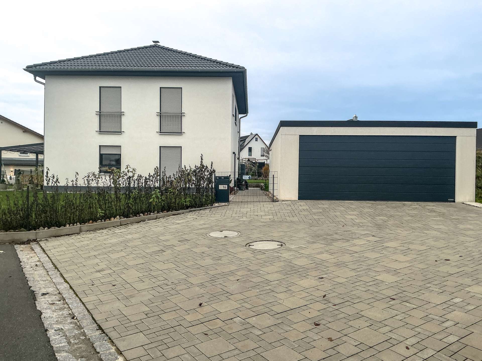 Die große Doppelgarage befindet sich unmittelbar am Haus und ermöglicht komfortables Parken sowie zusätzlichen Stauraum für Fahrräder, Werkzeuge oder Freizeitgeräte.