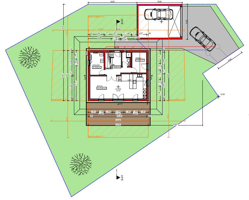 Die große Doppelgarage befindet sich unmittelbar am Haus und ermöglicht komfortables Parken sowie zusätzlichen Stauraum für Fahrräder, Werkzeuge oder Freizeitgeräte.