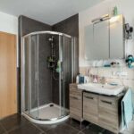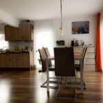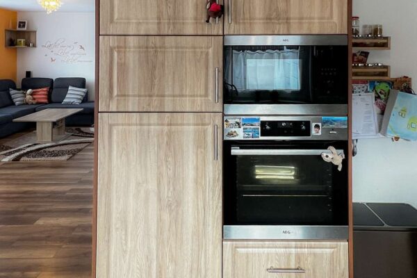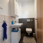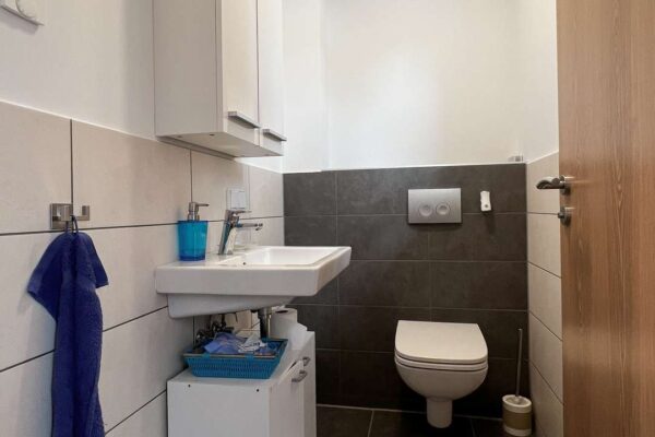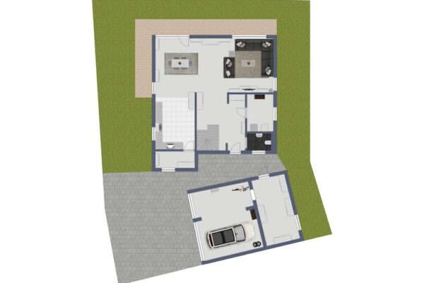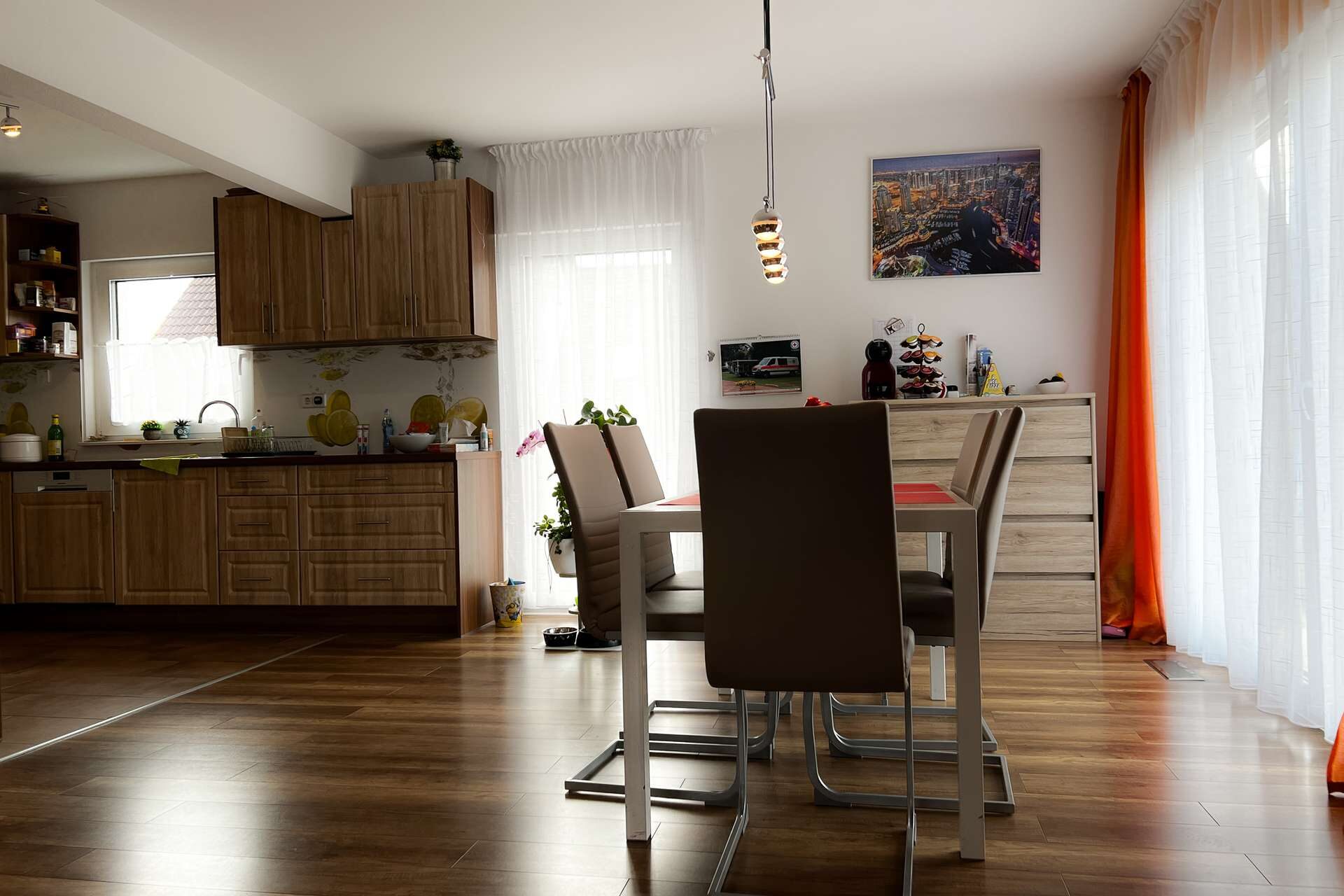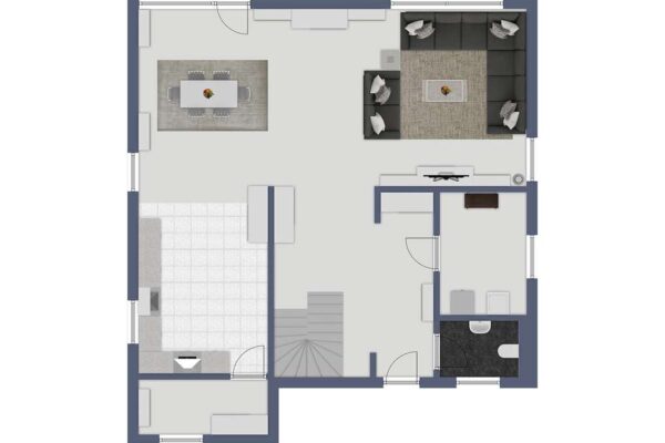 Im Erdgeschoss befindet sich ein großzügiger offener Wohn – und Essbereich mit Anschluss an die Küche. Der Raum ist L-förmig angelegt, dadurch bekommen die einzelnen Bereiche eine Abgeschlossenheit. Vom Essbereich gelangen Sie auf die Terrasse – perfekt für ein Frühstück in der Sonne. Die Küche ist mit hochwertigen Möbeln und Geräten ausgestattet – beim Kochen können Sie mit Ihren Gästen im Esszimmer kommunizieren. Eine Speisekammer hinter der Küche bietet ausreichend Platz zur Lagerung. Die Technik wurde auf dieser Etage im Hauswirtschaftsraum untergebracht. Eine Gästetoilette befindet sich direkt neben dem Eingang.