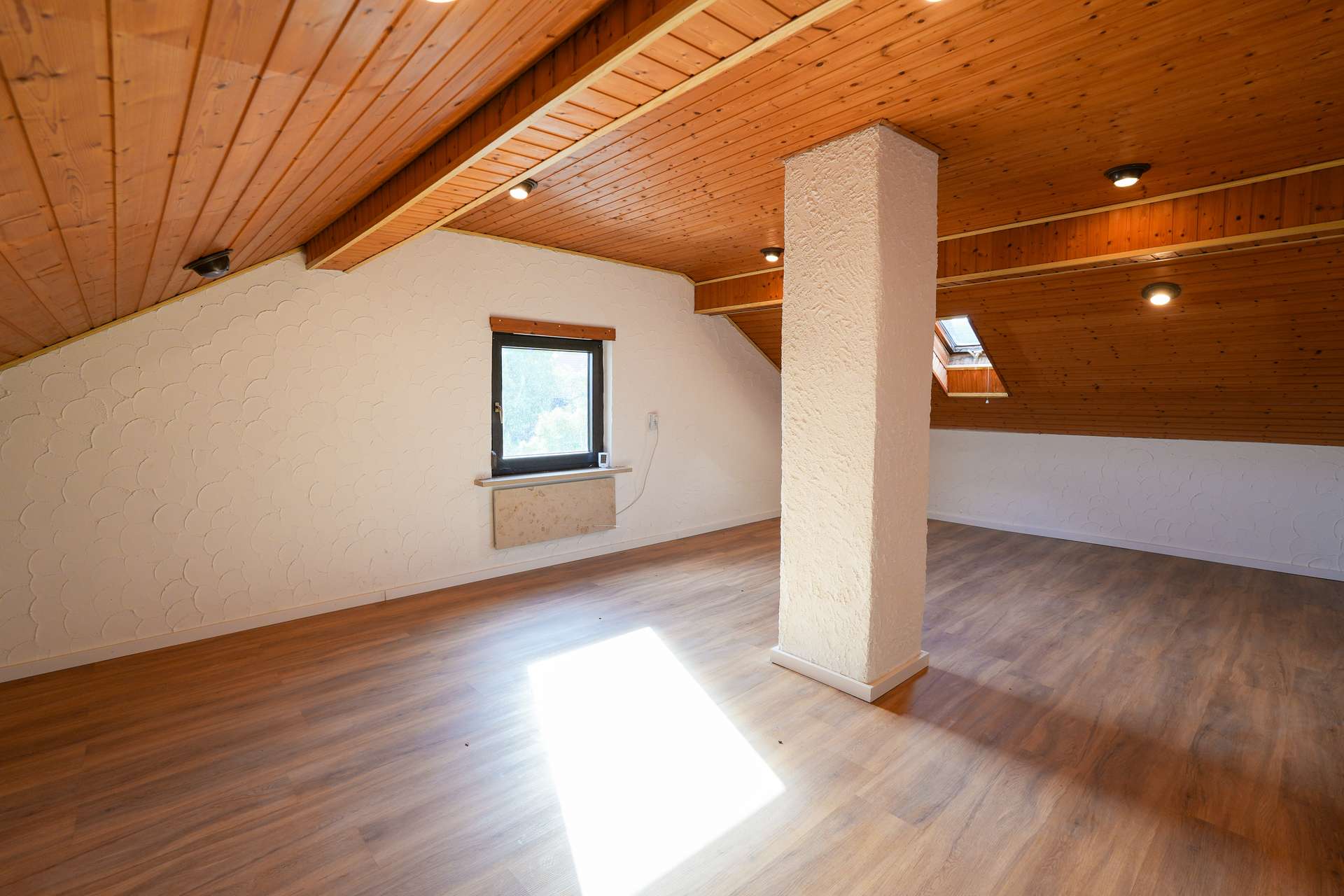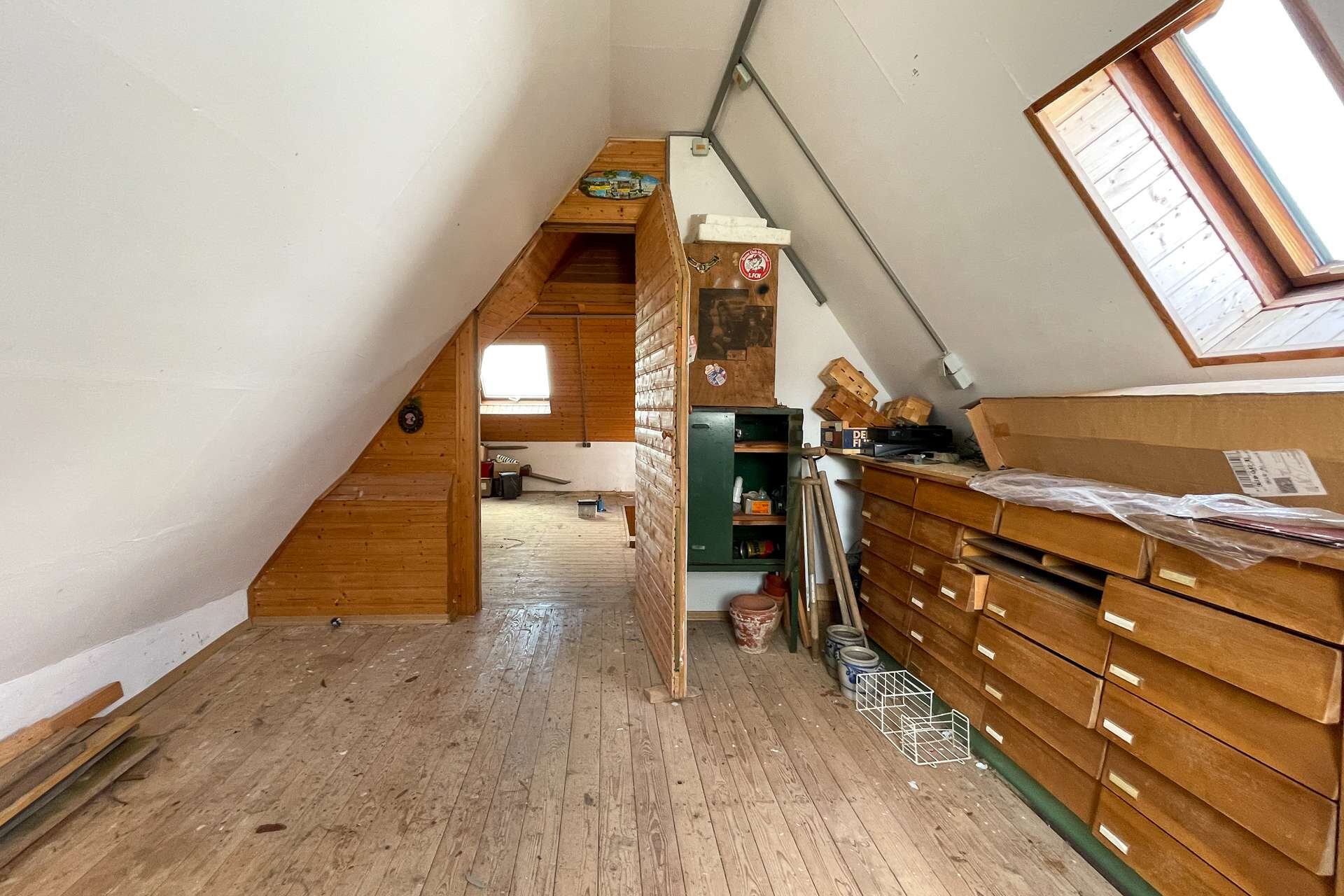 Das Dachgeschoss überzeugt mit einem großen, ausgebauten Raum sowie zusätzlicher Staufläche und weiterer Ausbaureserve.