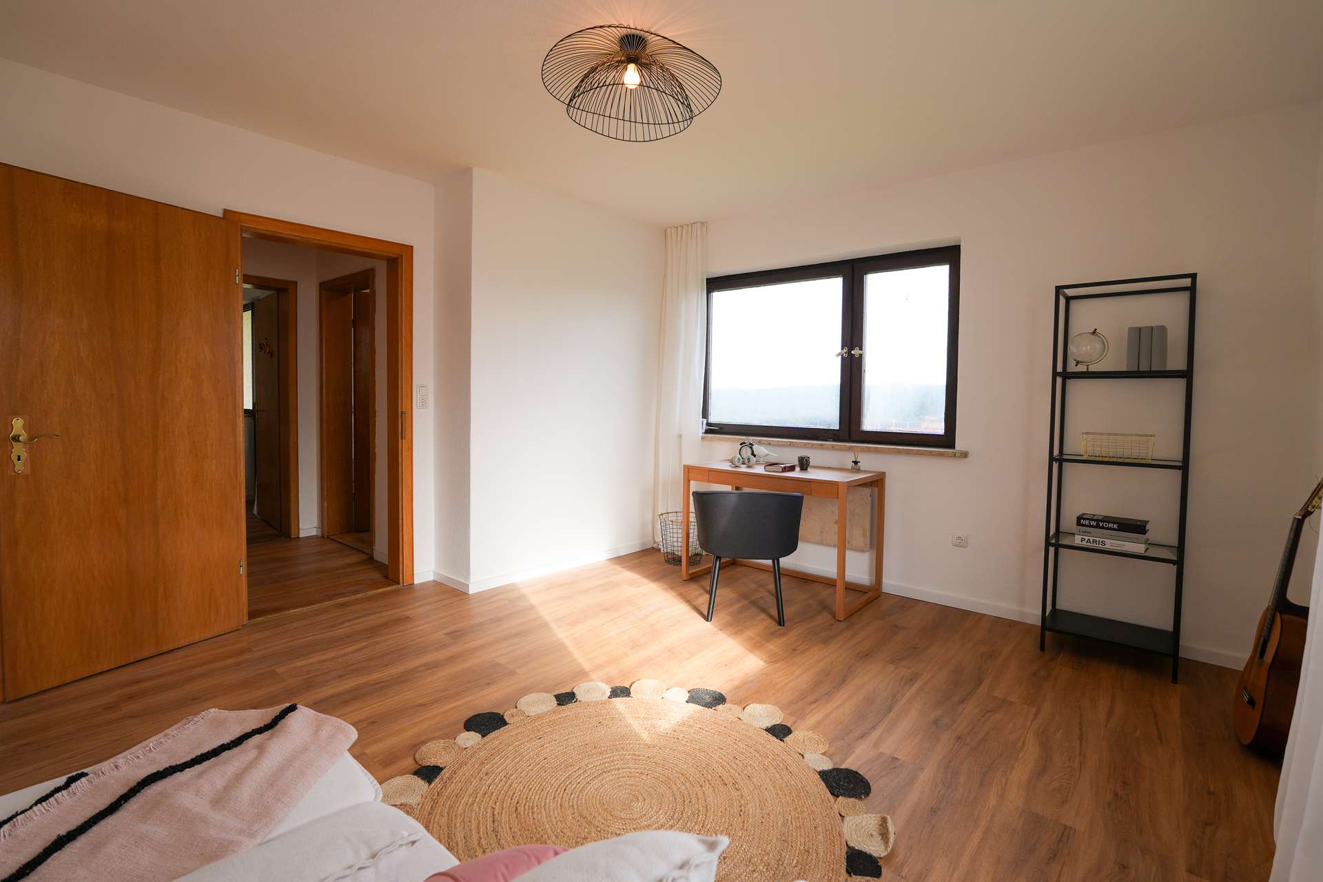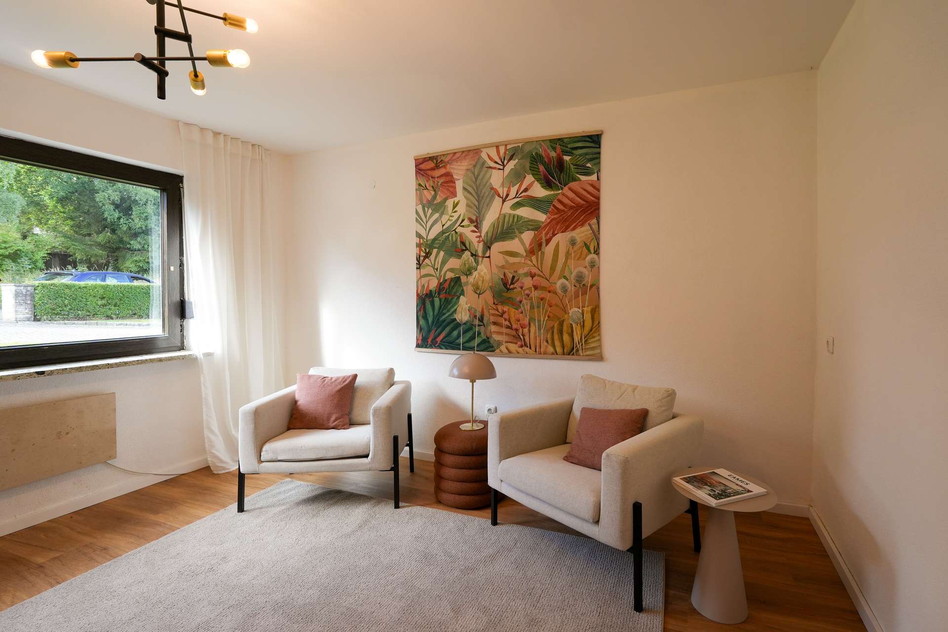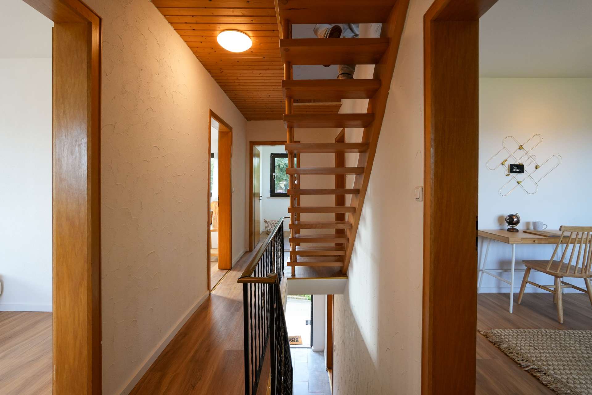 Beim Betreten des Hauses erwartet Sie rechterhand eine großzügige Küche mit direktem Zugang zum Wohnzimmer – perfekt für einen offenen, kommunikativen Wohnbereich. Das gemütliche Wohnzimmer lädt zu entspannten Abenden und geselligen Momenten ein. Linkerhand befindet sich ein Arbeitszimmer, optimal für Homeoffice oder kreative Hobbys, gefolgt von einem weiteren flexibel nutzbaren Raum, der sich ideal als Gäste-, Kinder- oder Hobbyzimmer eignet. Ein frisch modernisierter Flur führt zu einem Gäste-WC, einem praktischen Abstellraum sowie zum Keller.