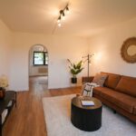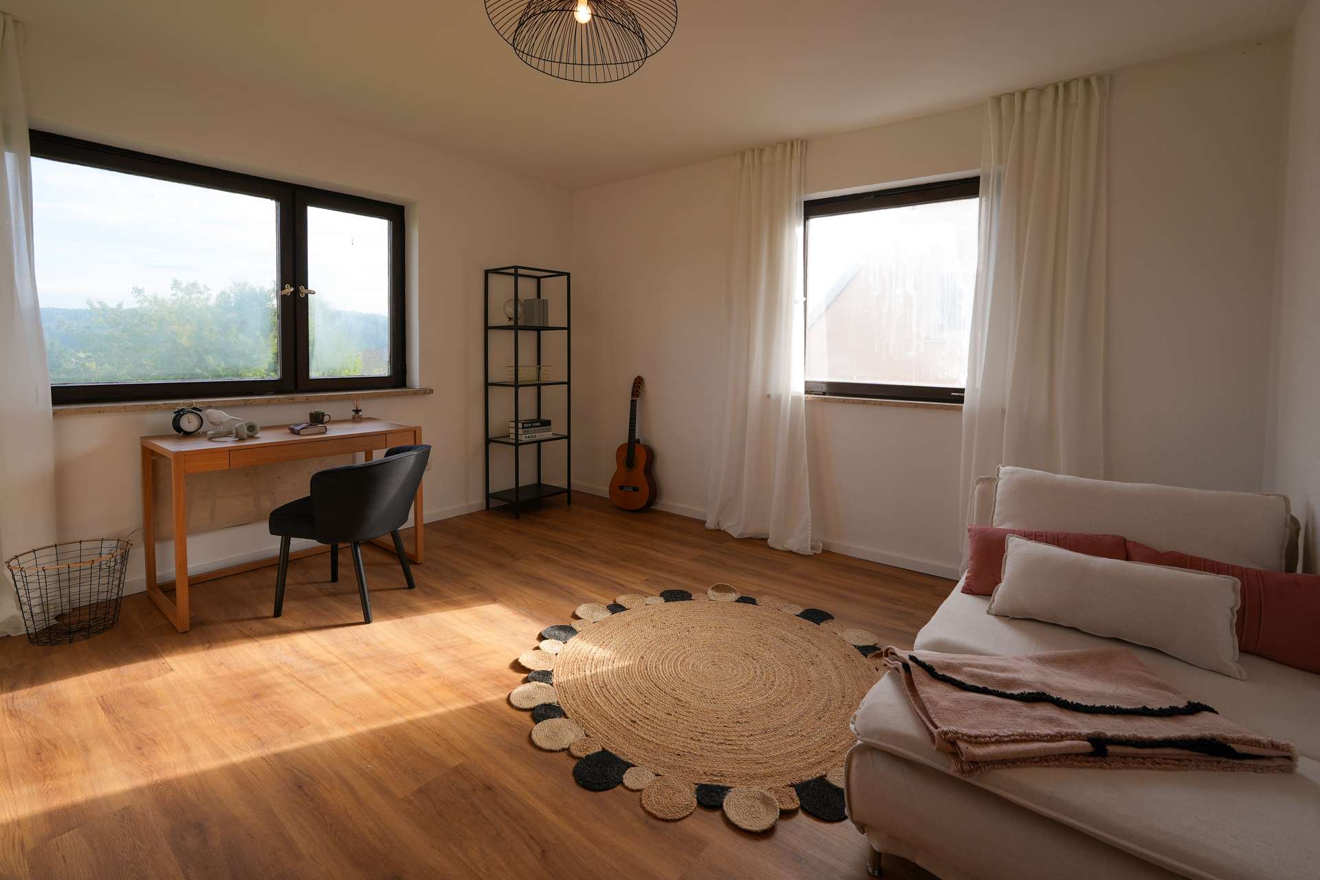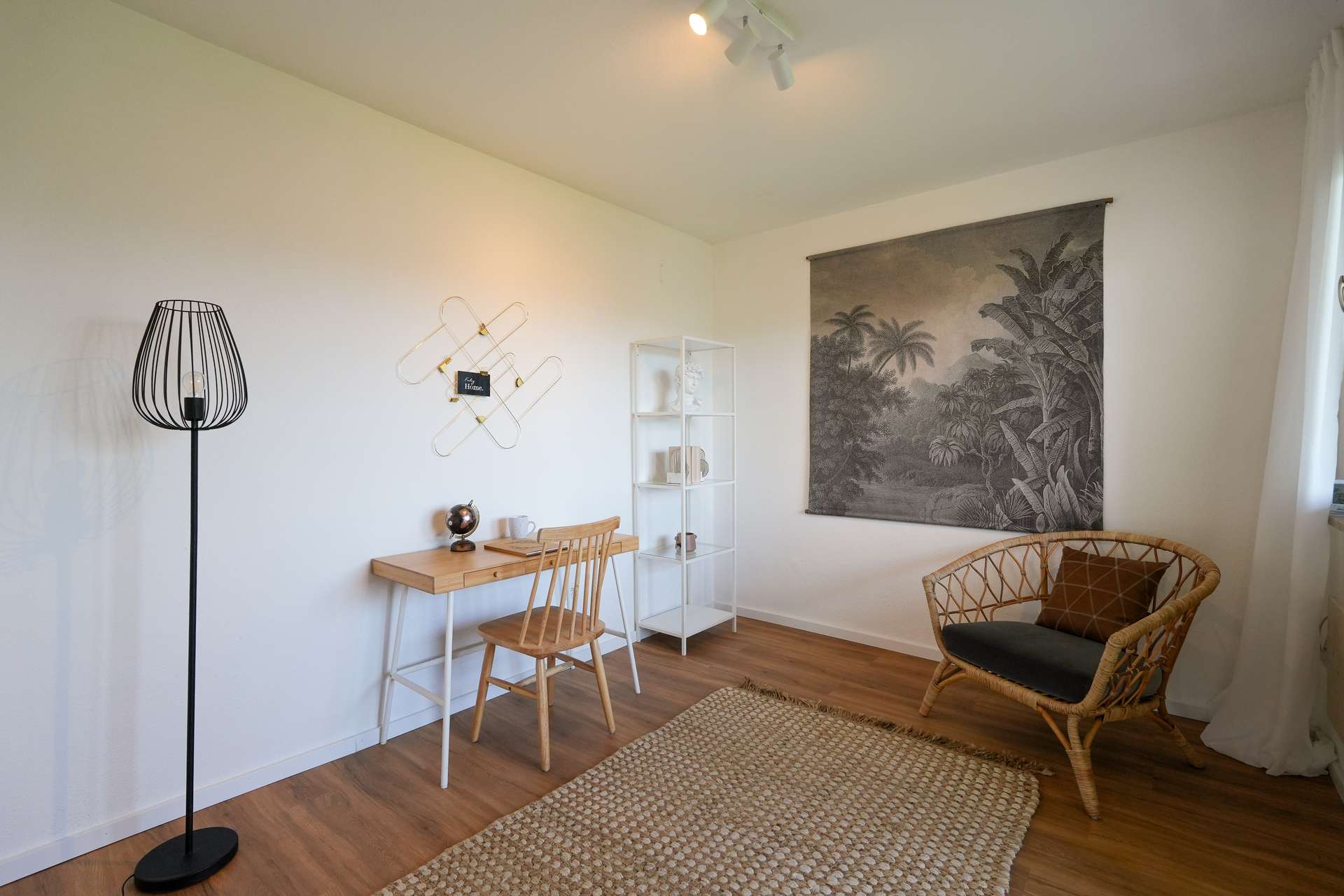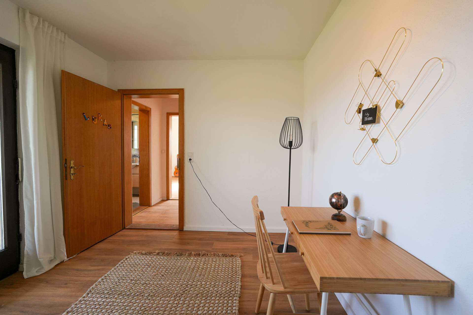 Beim Betreten des Hauses erwartet Sie rechterhand eine großzügige Küche mit direktem Zugang zum Wohnzimmer – perfekt für einen offenen, kommunikativen Wohnbereich. Das gemütliche Wohnzimmer lädt zu entspannten Abenden und geselligen Momenten ein. Linkerhand befindet sich ein Arbeitszimmer, optimal für Homeoffice oder kreative Hobbys, gefolgt von einem weiteren flexibel nutzbaren Raum, der sich ideal als Gäste-, Kinder- oder Hobbyzimmer eignet. Ein frisch modernisierter Flur führt zu einem Gäste-WC, einem praktischen Abstellraum sowie zum Keller.
