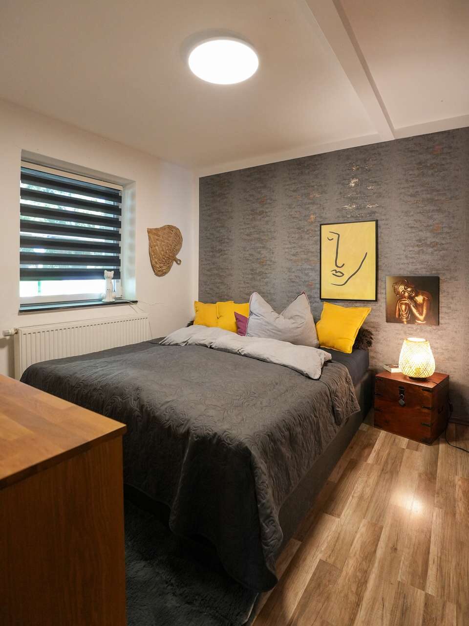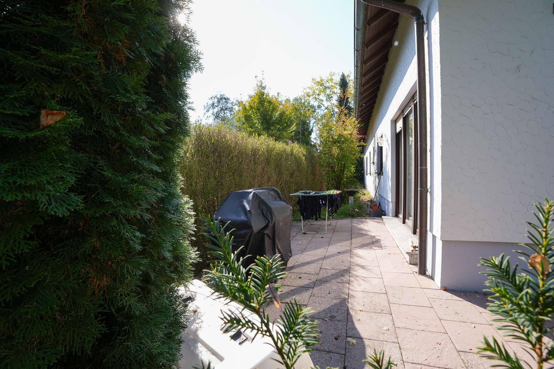 Die linke Gebäudeseite beherbergt eine weitläufige Wohnung mit rund 150 m², die sich durch helle, gut proportionierte Räume auszeichnet. Ein großzügiger Wohn- und Essbereich, mehrere Schlafzimmer, eine geräumige Küche, ein Bad, ein Gäste-WC sowie direkter Zugang zu Garten und Terrasse schaffen hier ein komfortables Zuhause für Familien oder Paare mit Platzbedarf.