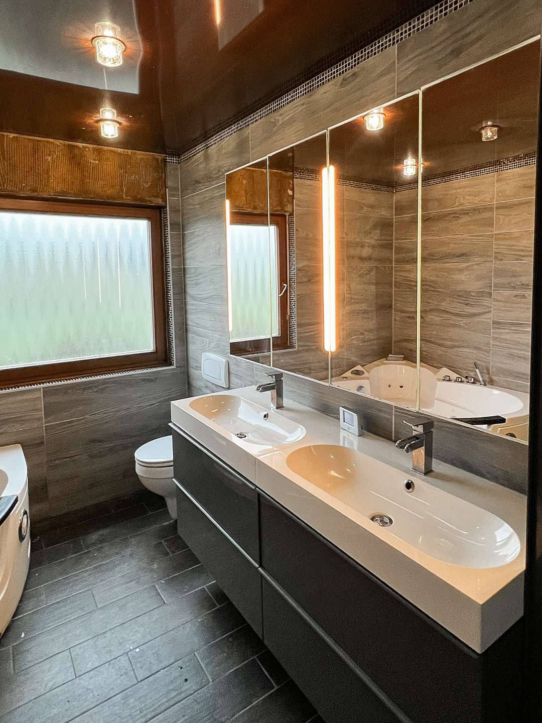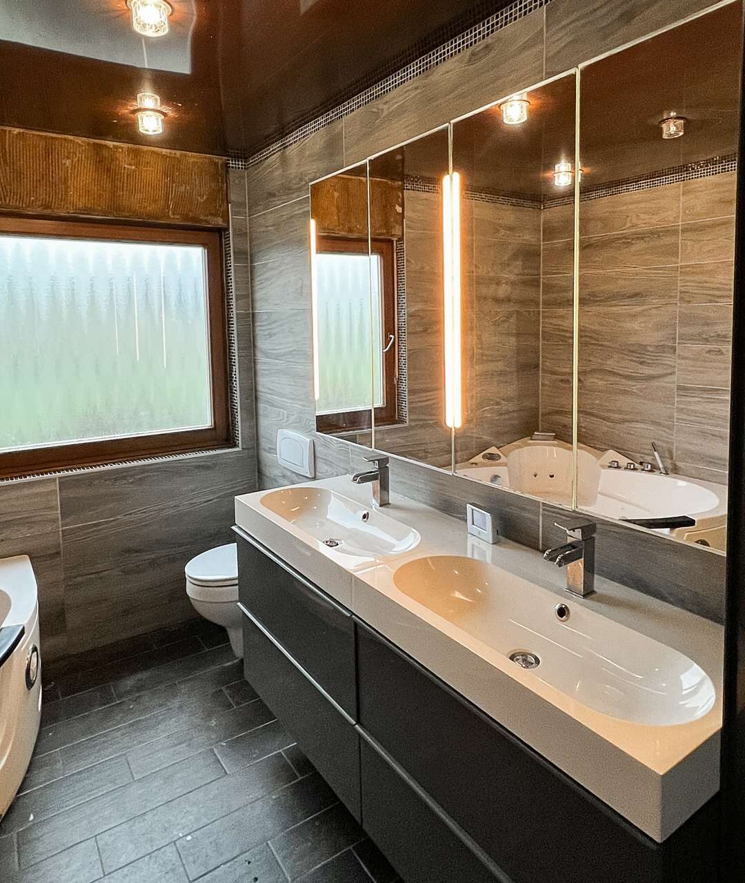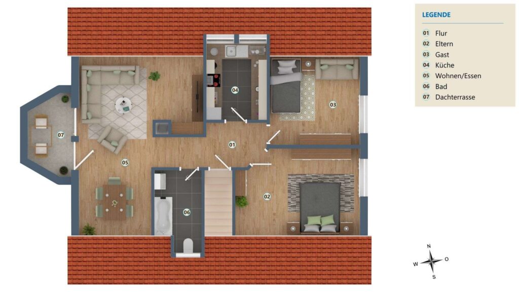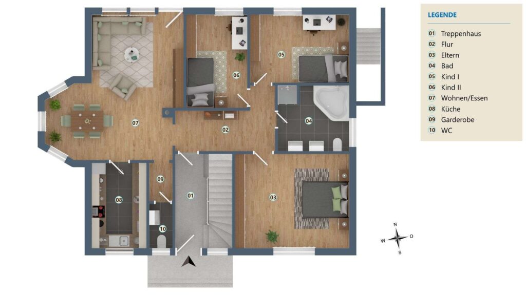 Rechterhand befinden sich drei Räume und das moderne Badezimmer. Die Räume lassen sich individuell nutzen, ob Schlafzimmer, Kinderzimmer oder Ankleidezimmer – es entscheiden allein Ihre persönlichen Bedürfnisse. Die Ausstattung des Badezimmers wird Sie begeistern, moderne Fliesen, eine großzügige Eckwhirlbadewanne, zwei Waschbecken und Tageslicht – was will man mehr?